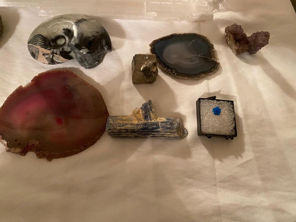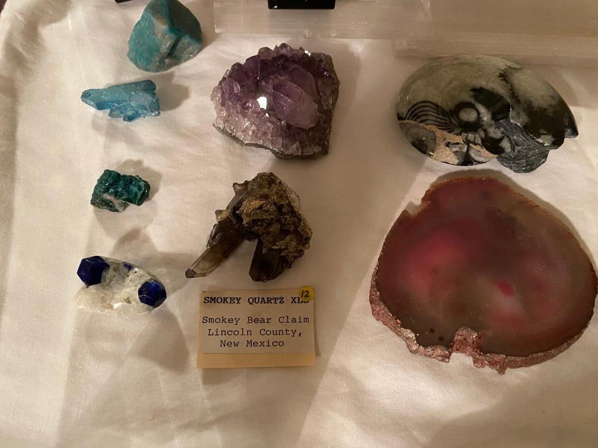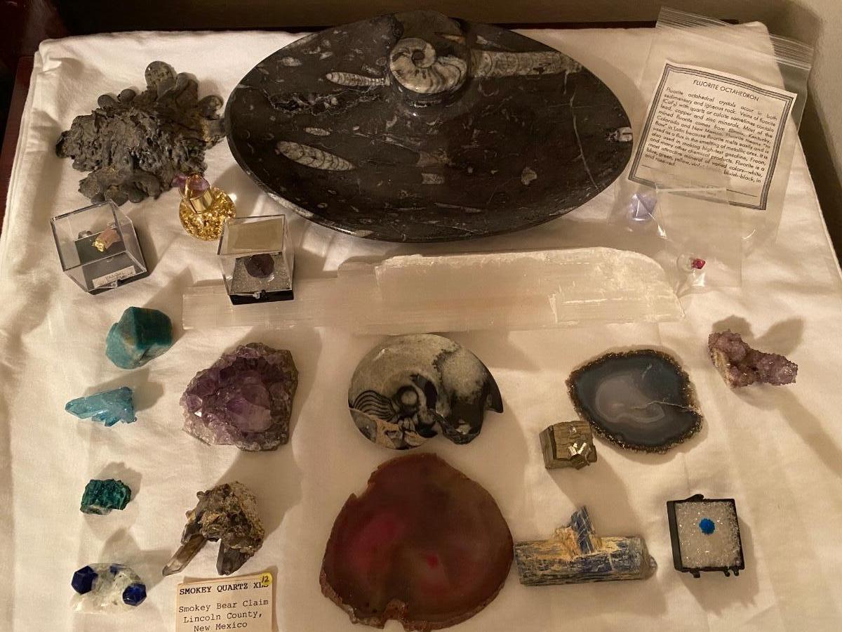 Lapidary or Rock Collection. Various crystals, rocks & fossils. The tray with nautilus is approx 8-1/2” w
