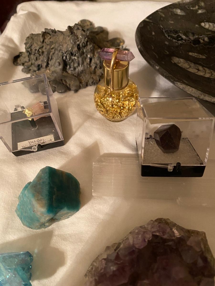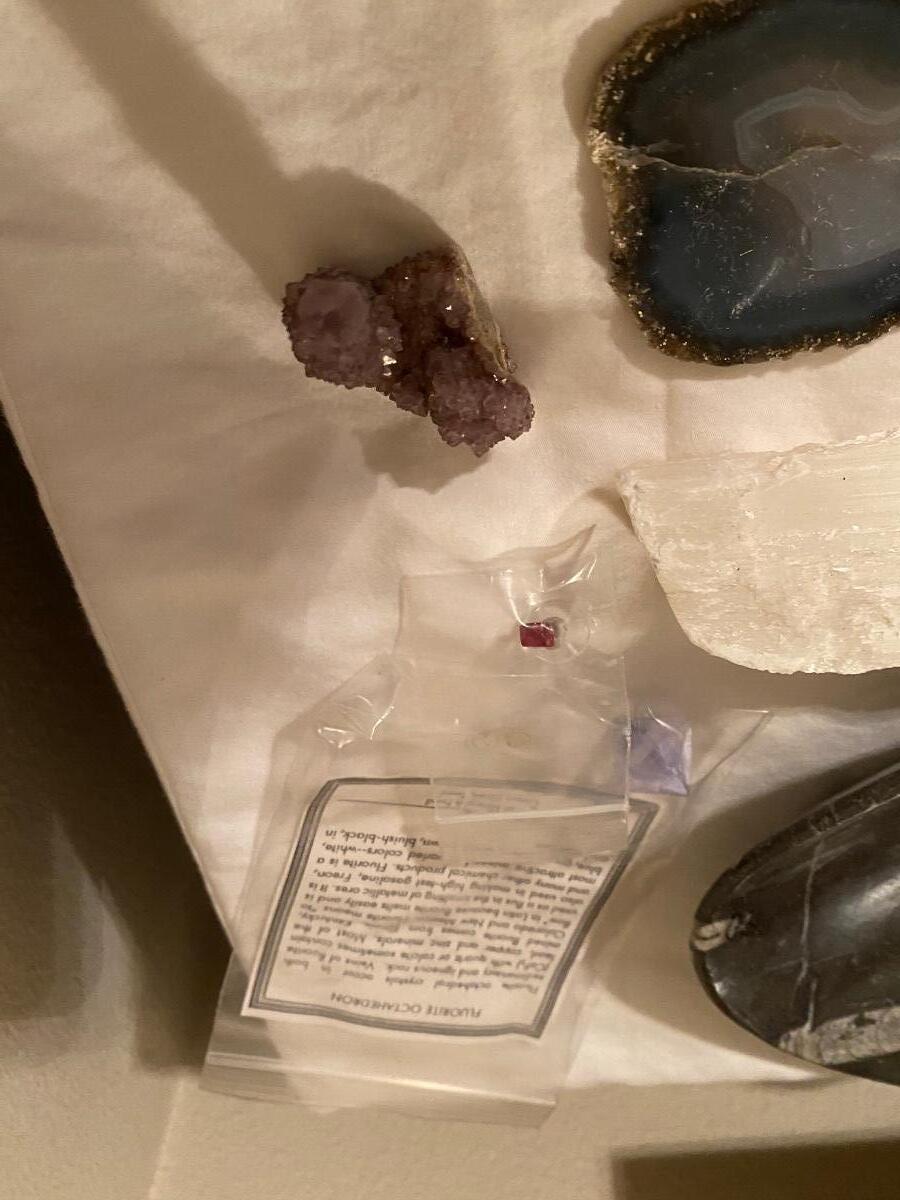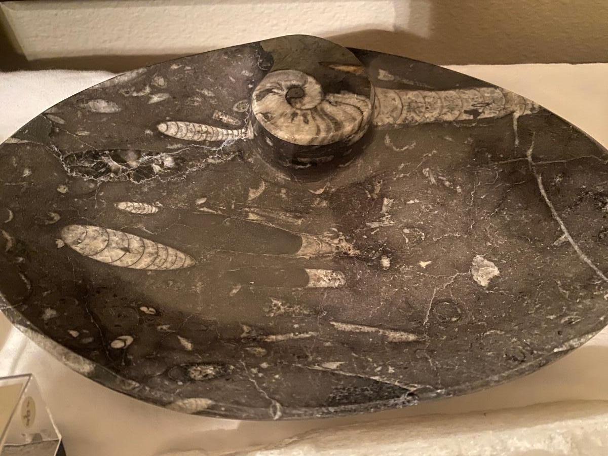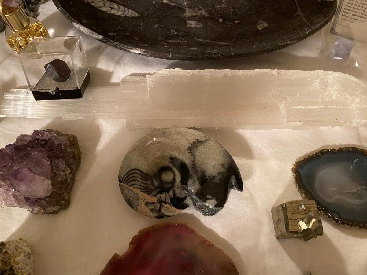Lapidary or Rock Collection. Various crystals, rocks & fossils. The tray with nautilus is approx 8-1/2” w