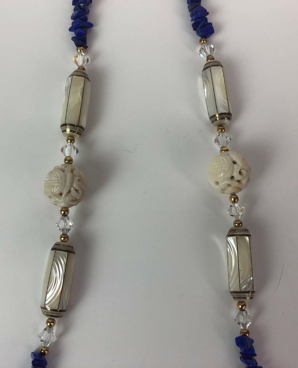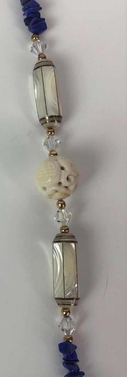 In very good condition this necklace measures 32 inches long...Made of Lapis..Carved Jade balls..Glass and gold tone beads and Mother of Pearl....Unknown maker? This estate jewelry is offered with no reserve“🦆