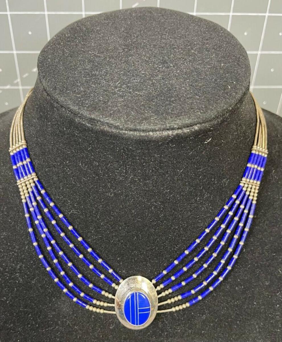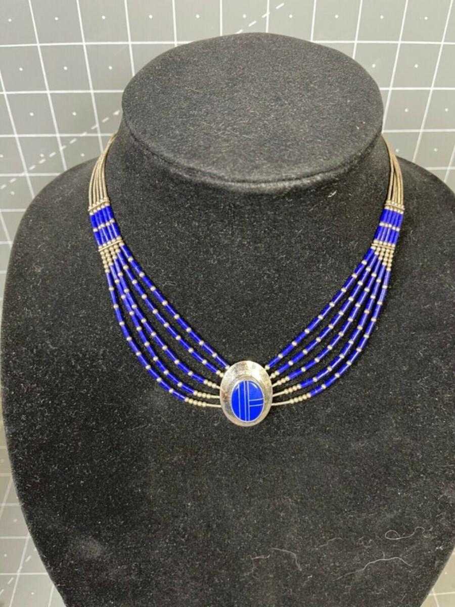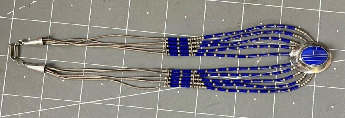 Lapis Lazuli Silver Inlay Choker Necklace Liquid Silver Beads vintage