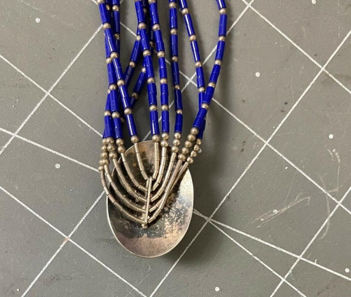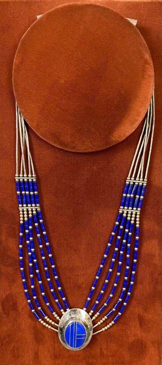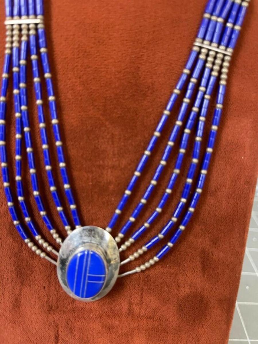Beautiful Lapis Lazuli and liquid silver choker style necklace. Vintage 1970’s hand made jewelry, estate find. Measures 16” in length overall and 18 grams in weight. Not marked but tests as sterling or .925 silver. Lapis beads with a cool geometric design on the main oval setting.