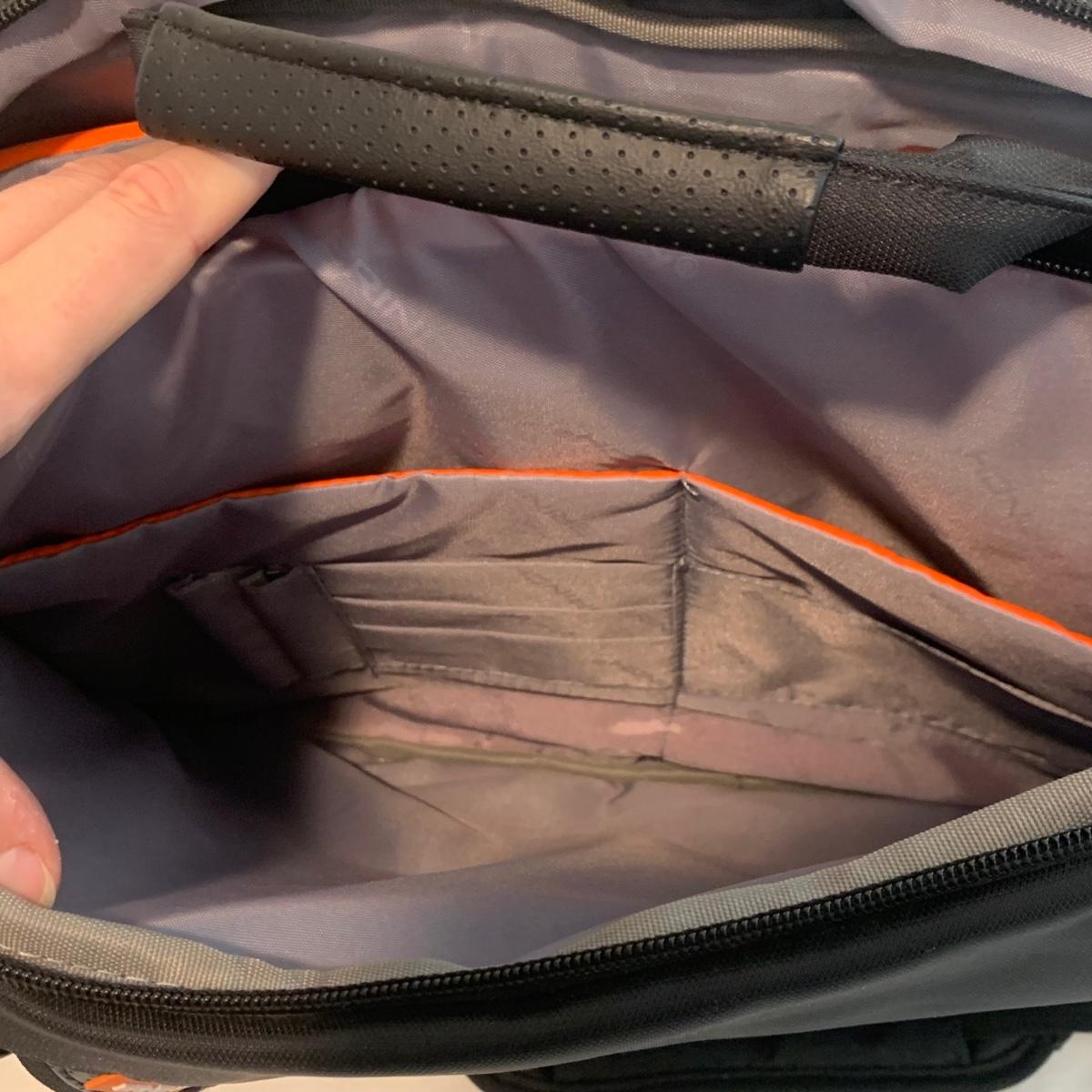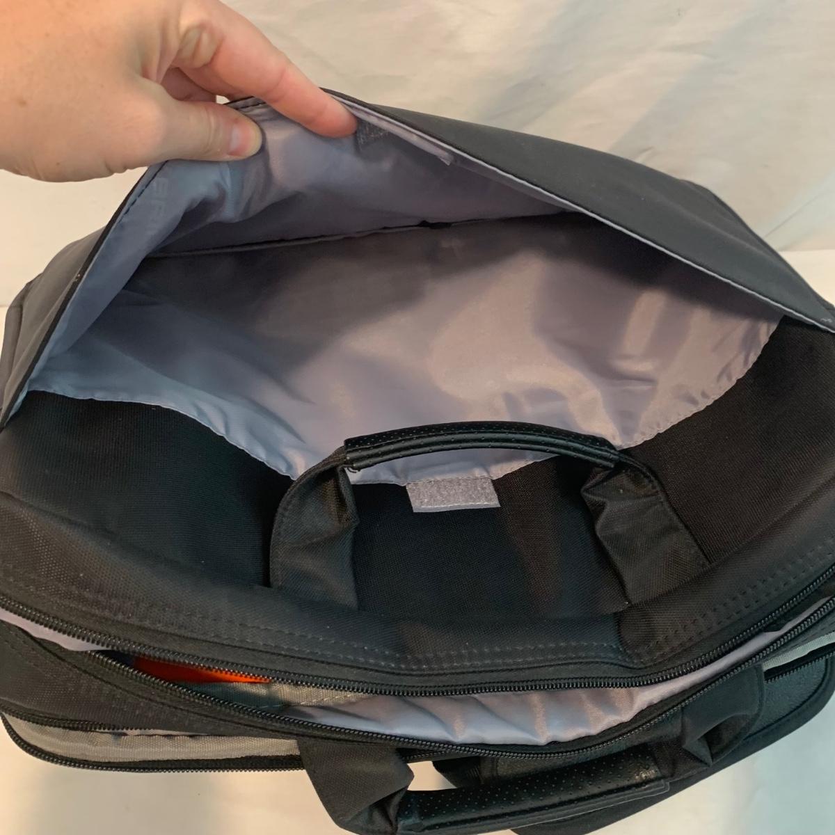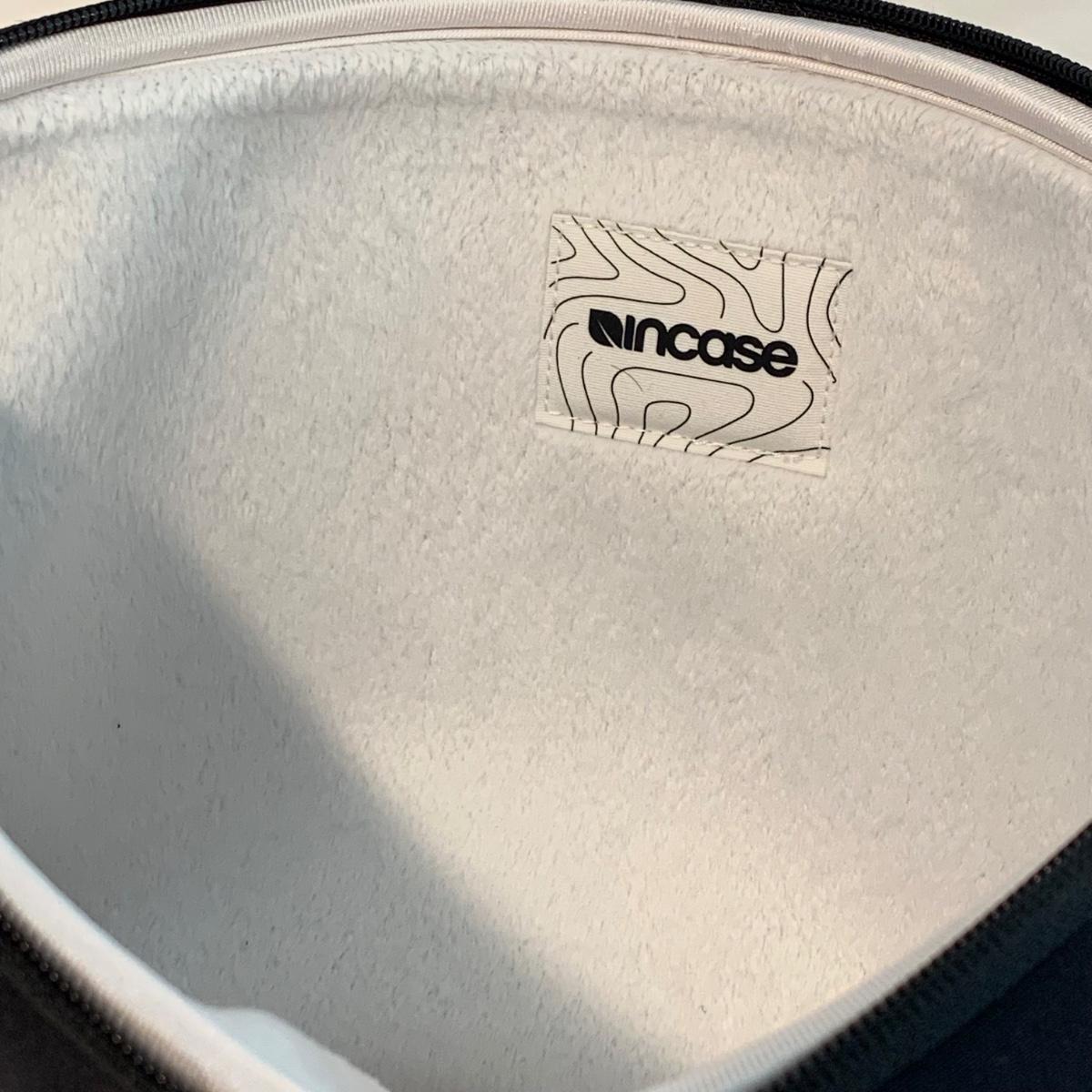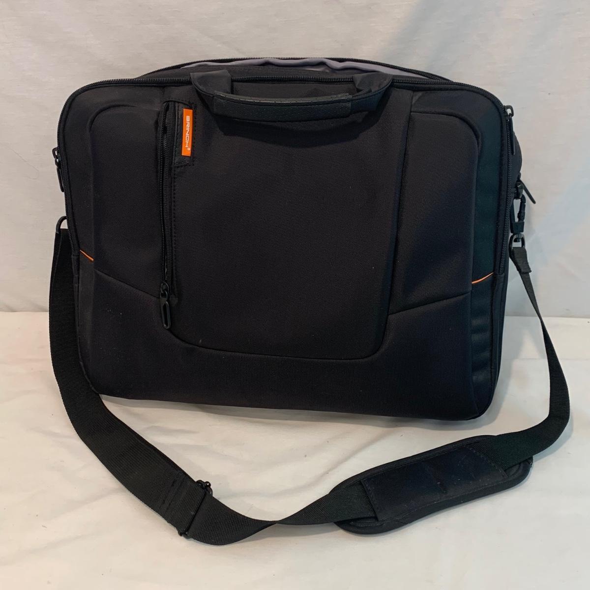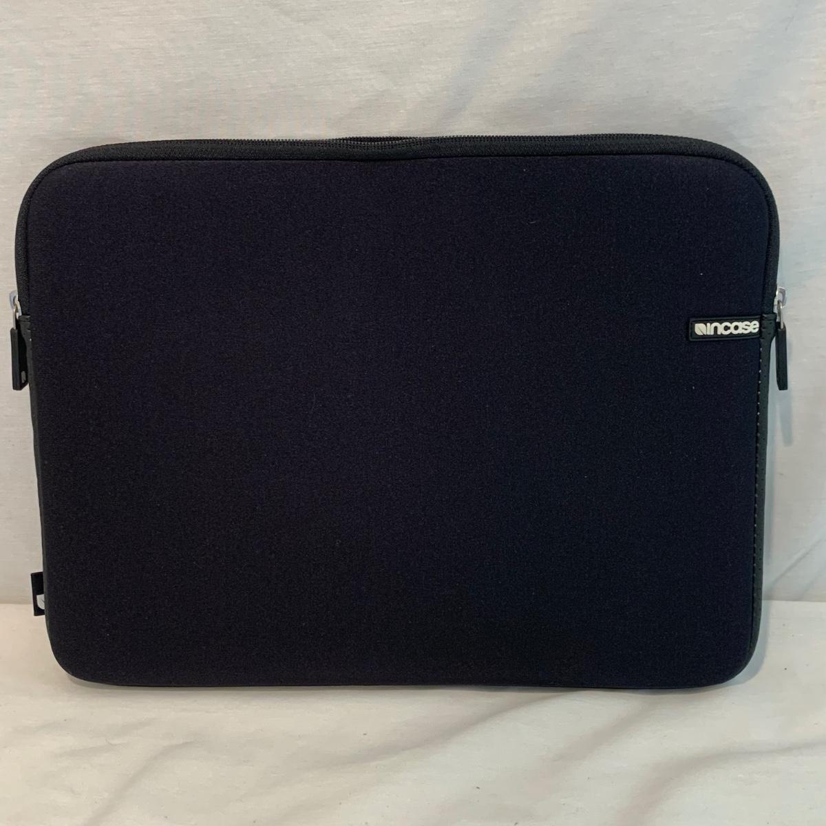 Two laptop cases: one is a Brinch brand padded laptop bag that has a handle, shoulder strap, and multiple pockets. The other is an Incase brand foam laptop sleeve that has a super soft lining; 13.5” x 10.5”. Also included is a Levenger brand laptop desk with a soft velvet vase and wood surface. One elastic band is included. There are some blemishes on the wood and velvet. And a Peeramid Bookrest which is a soft microfiber cover pyramid pillow to rest a phone, tablet or book on.