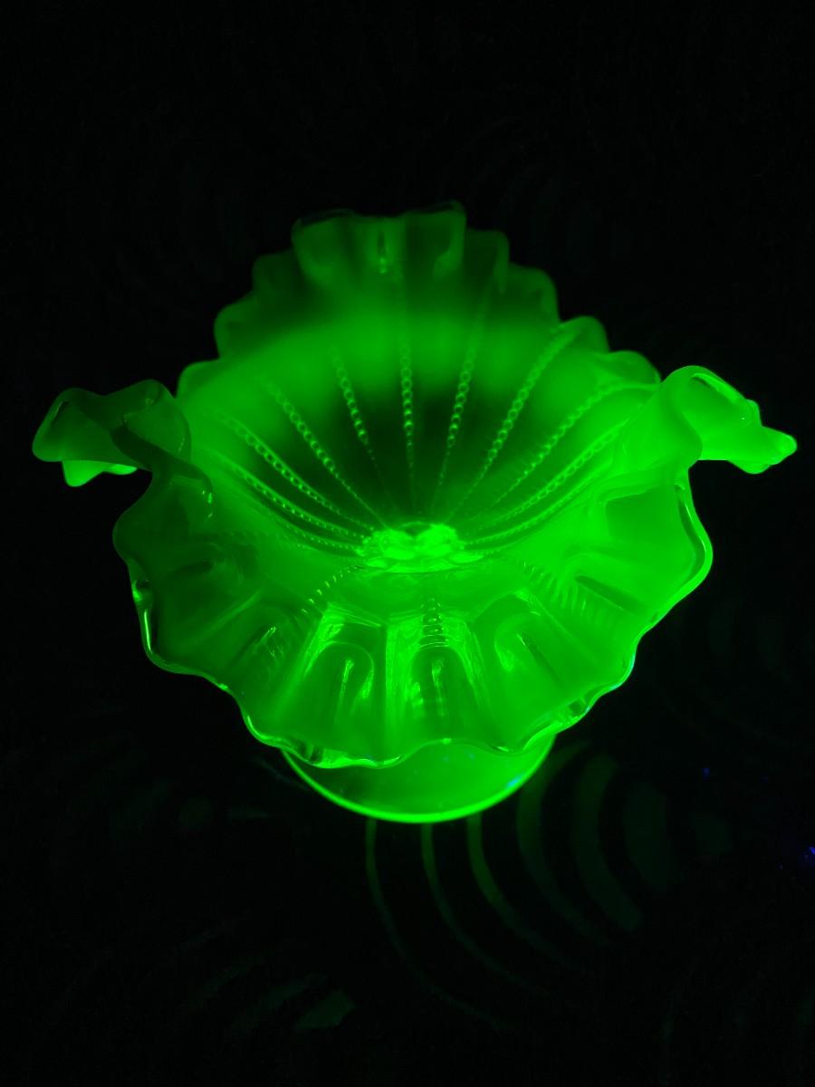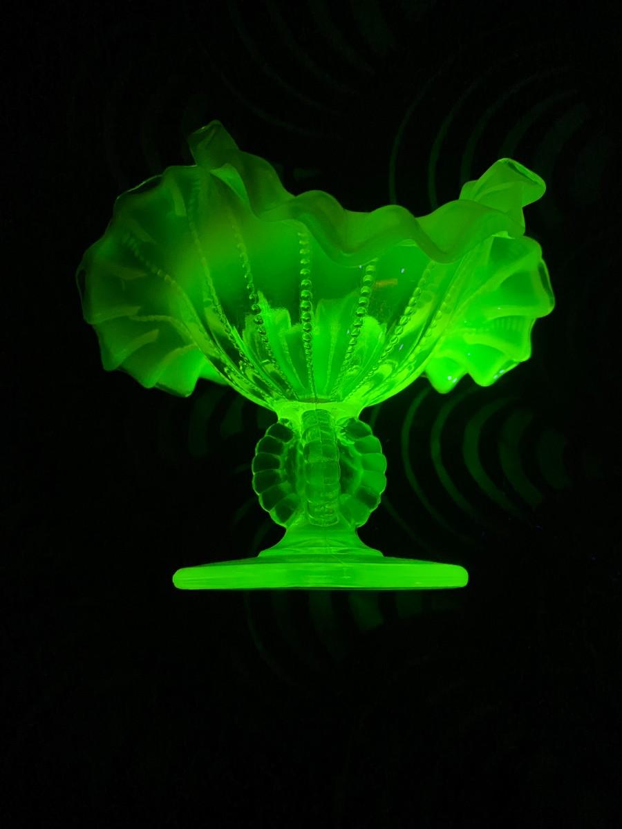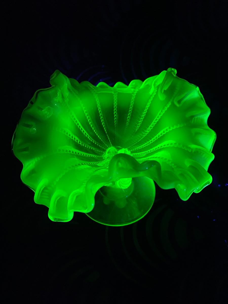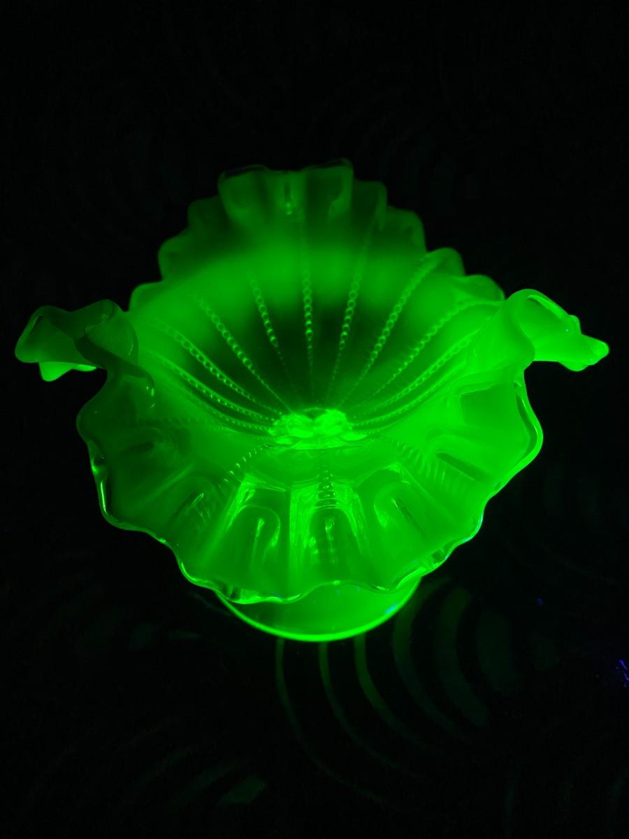 Art Deco Northwood Uranium Ruffle and Raised Dot Glass Dish