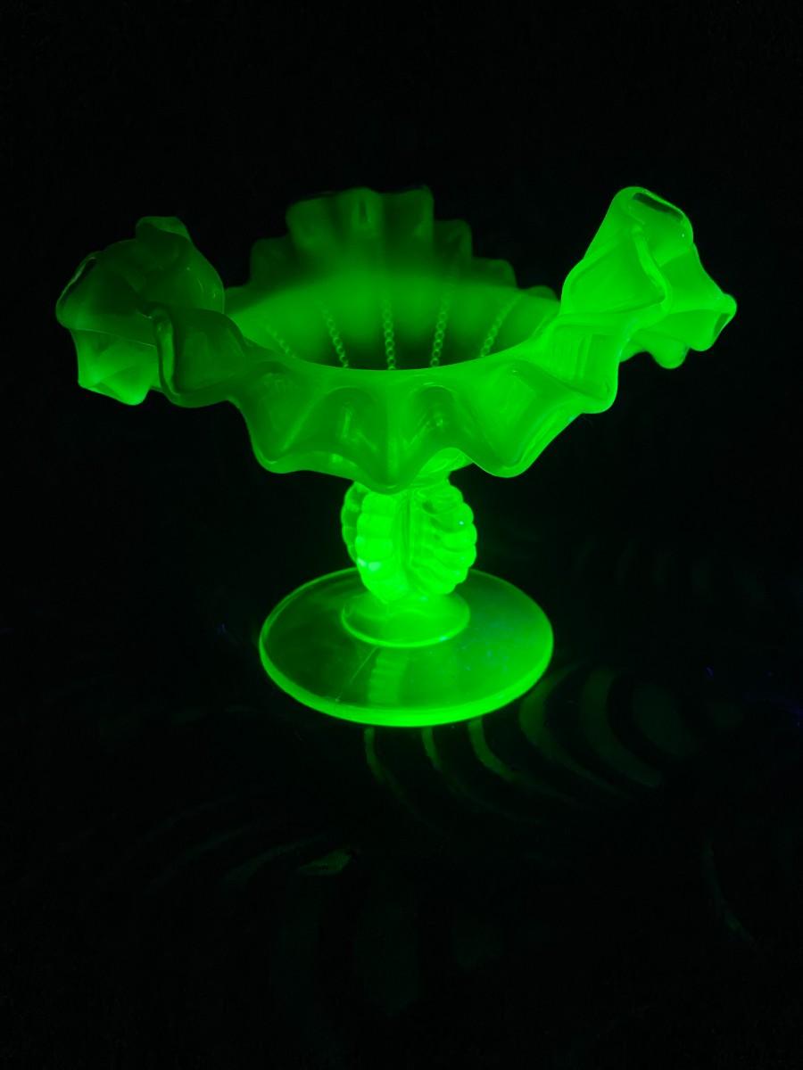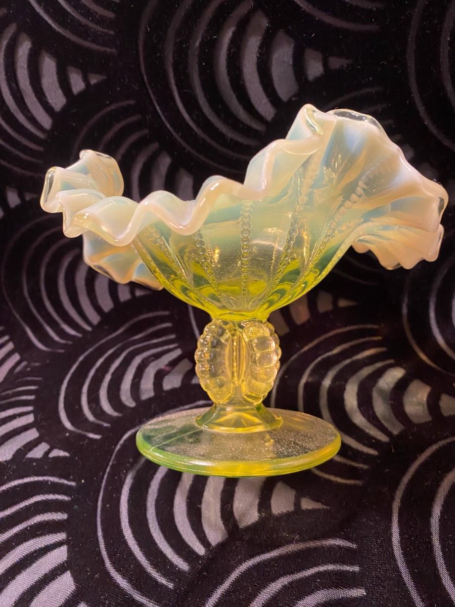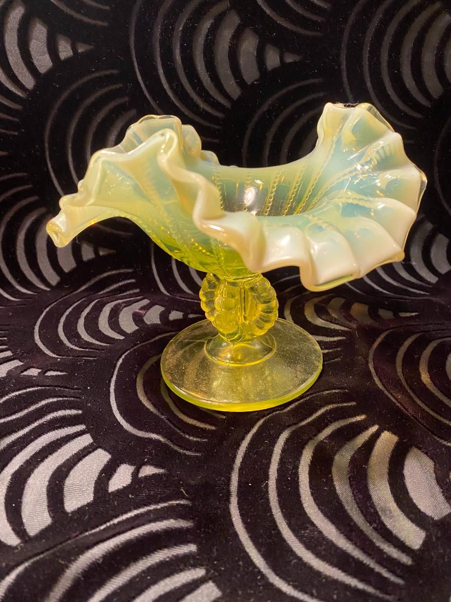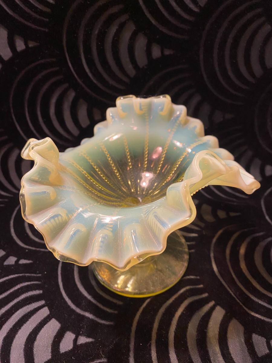 Art Deco Northwood Uranium Ruffle and Raised Dot Glass Dish