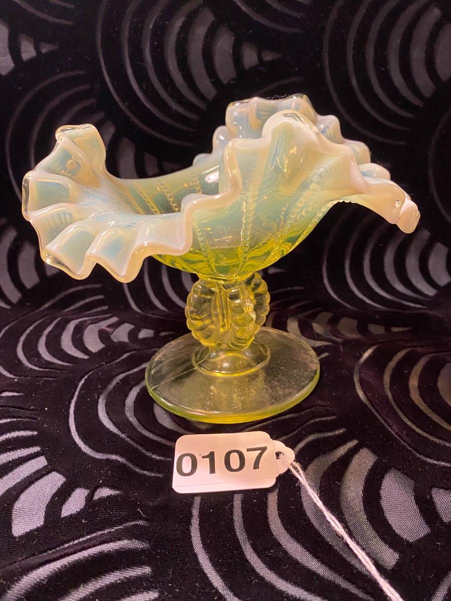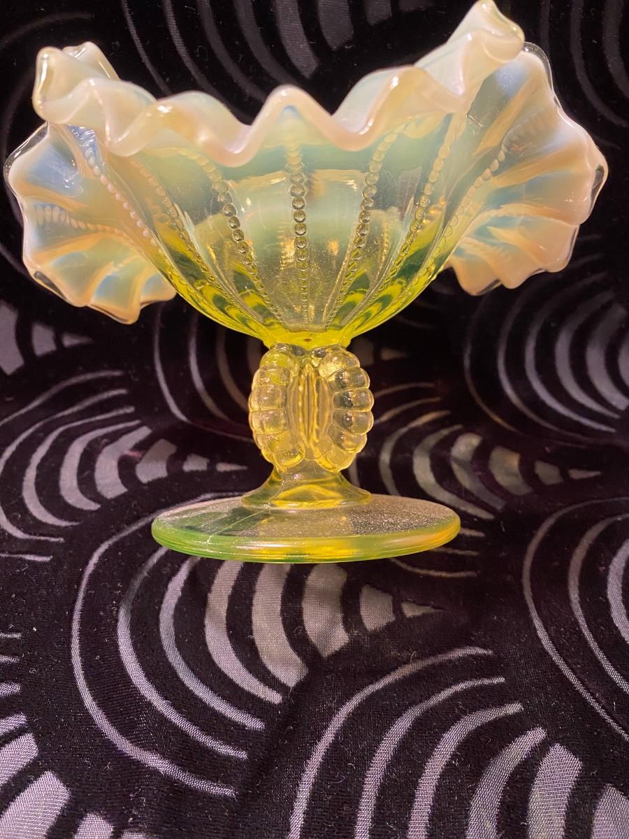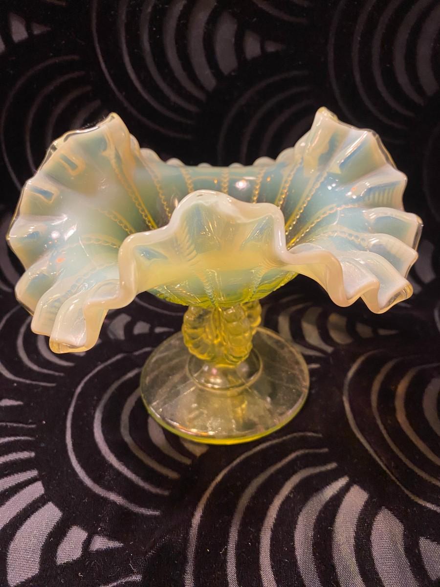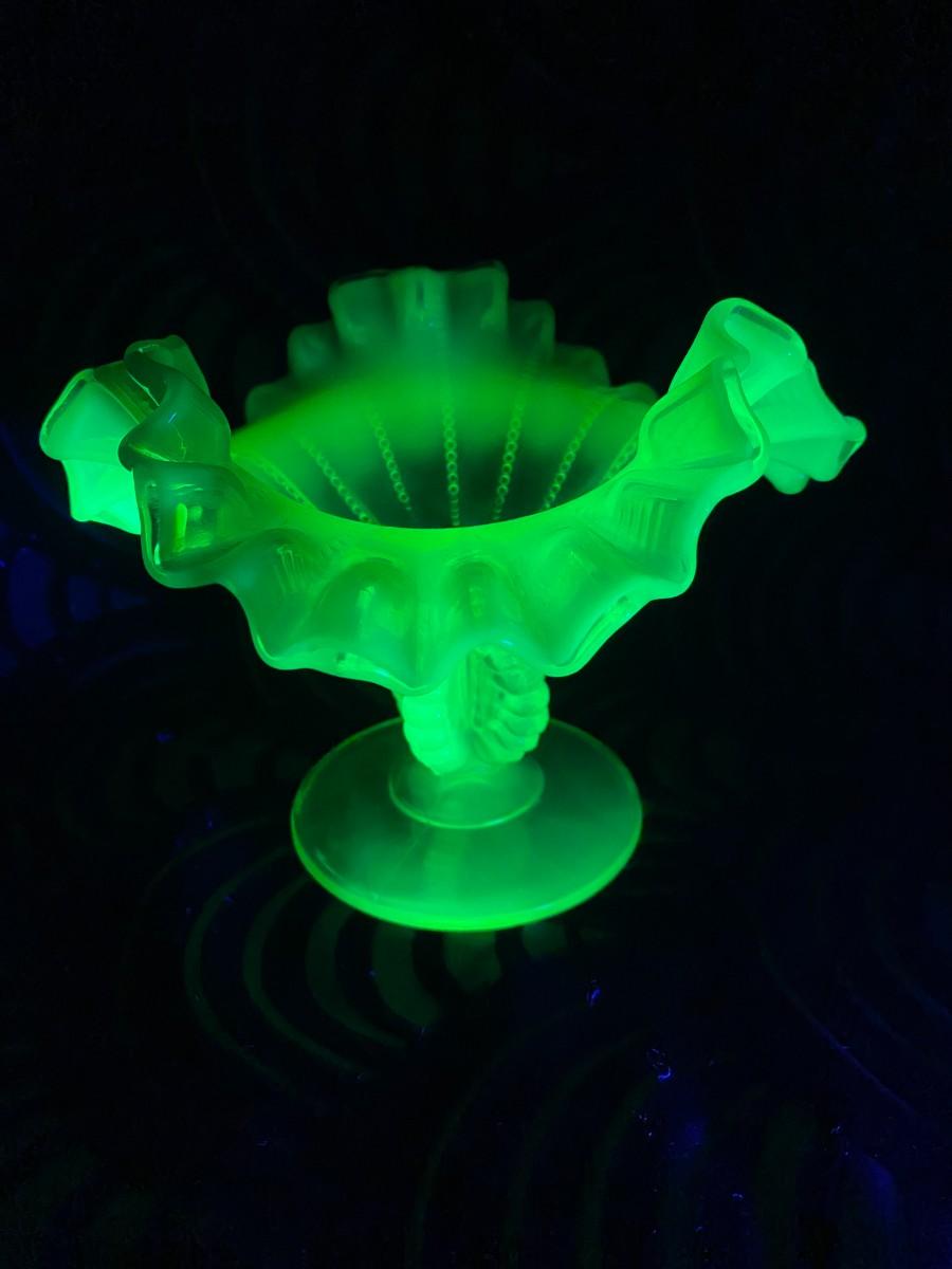 Art Deco Northwood Uranium Ruffle and Raised Dot Glass Dish
