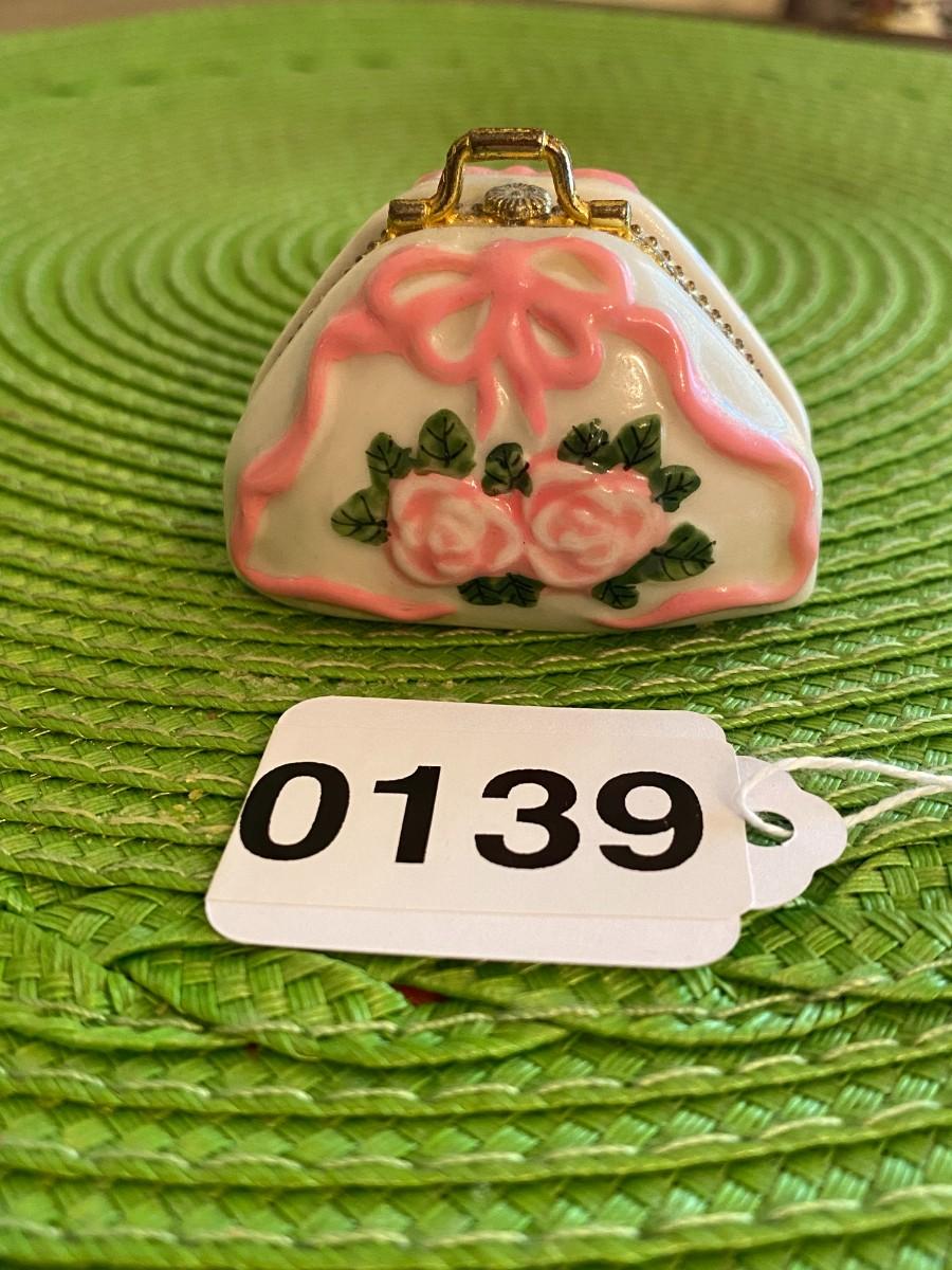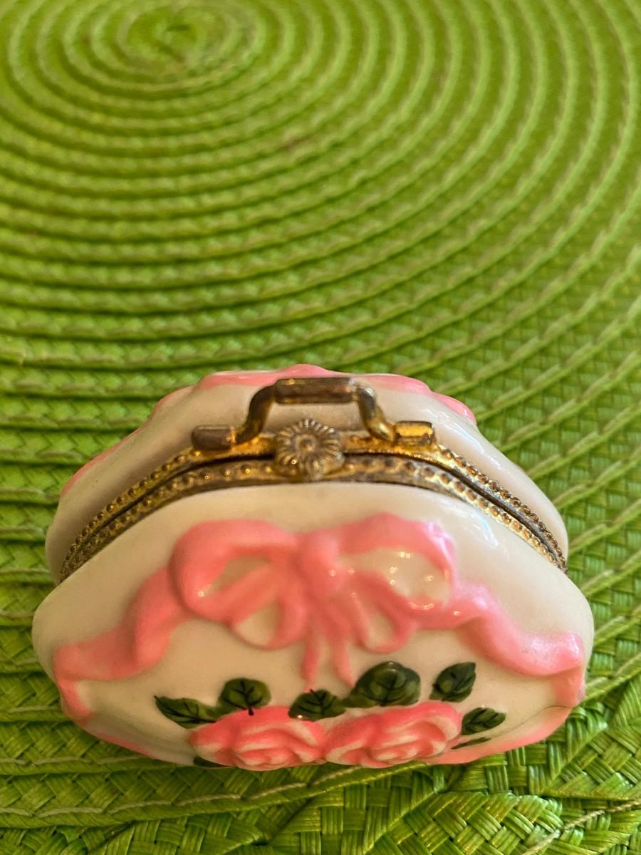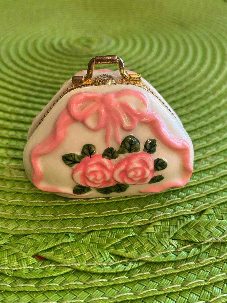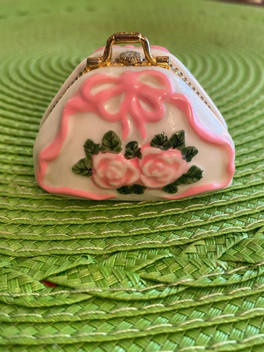 Miniature Porcelain Hand Bag Trinket Box with Mini Comb and Mirror