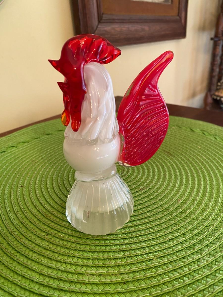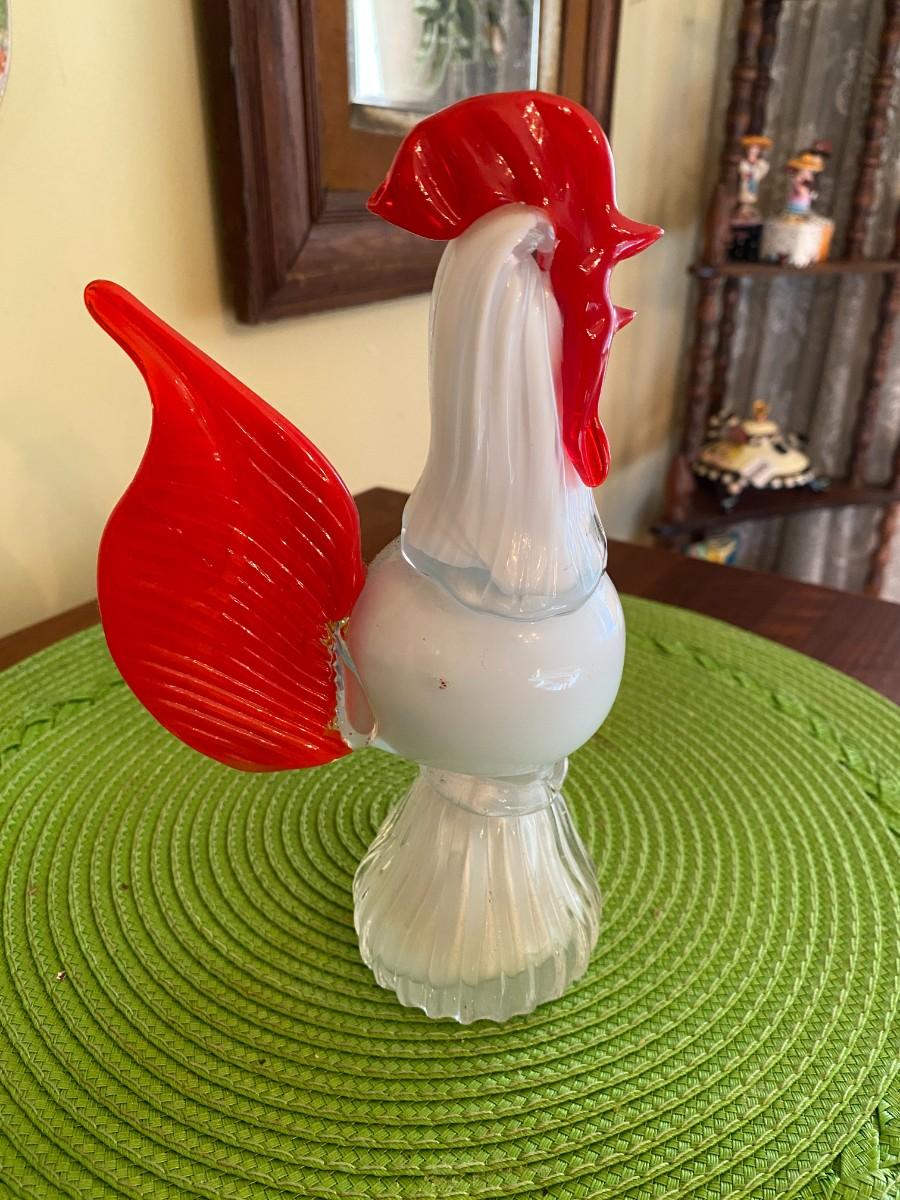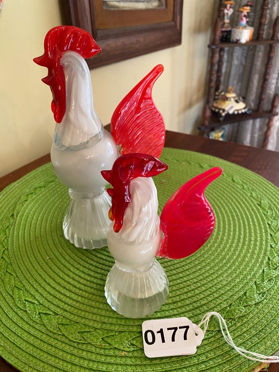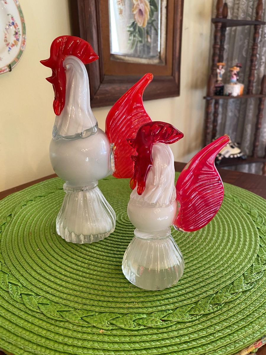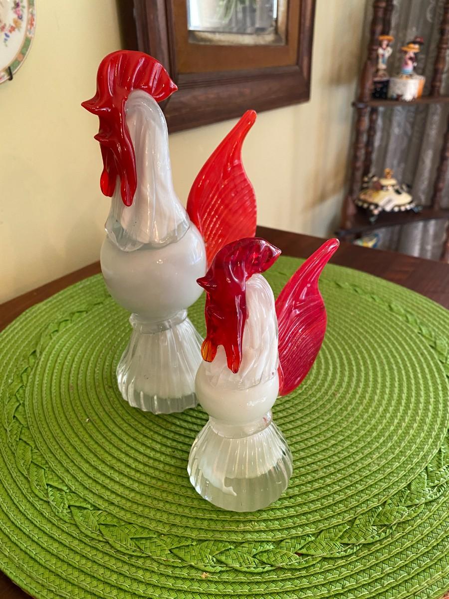Fun pair of Vintage Murano Red and White Art Glass Chickens / Roosters