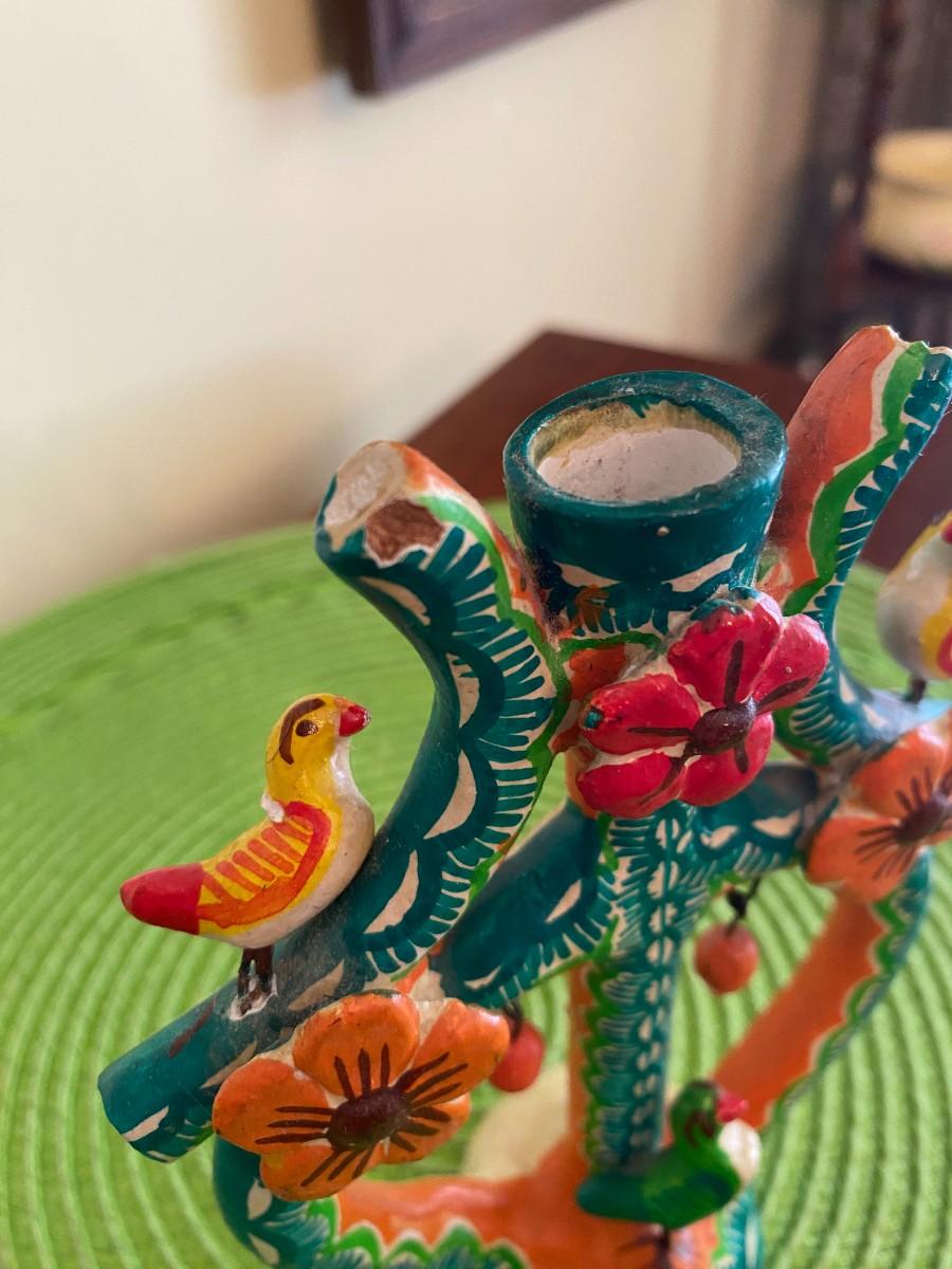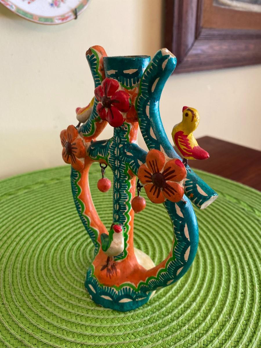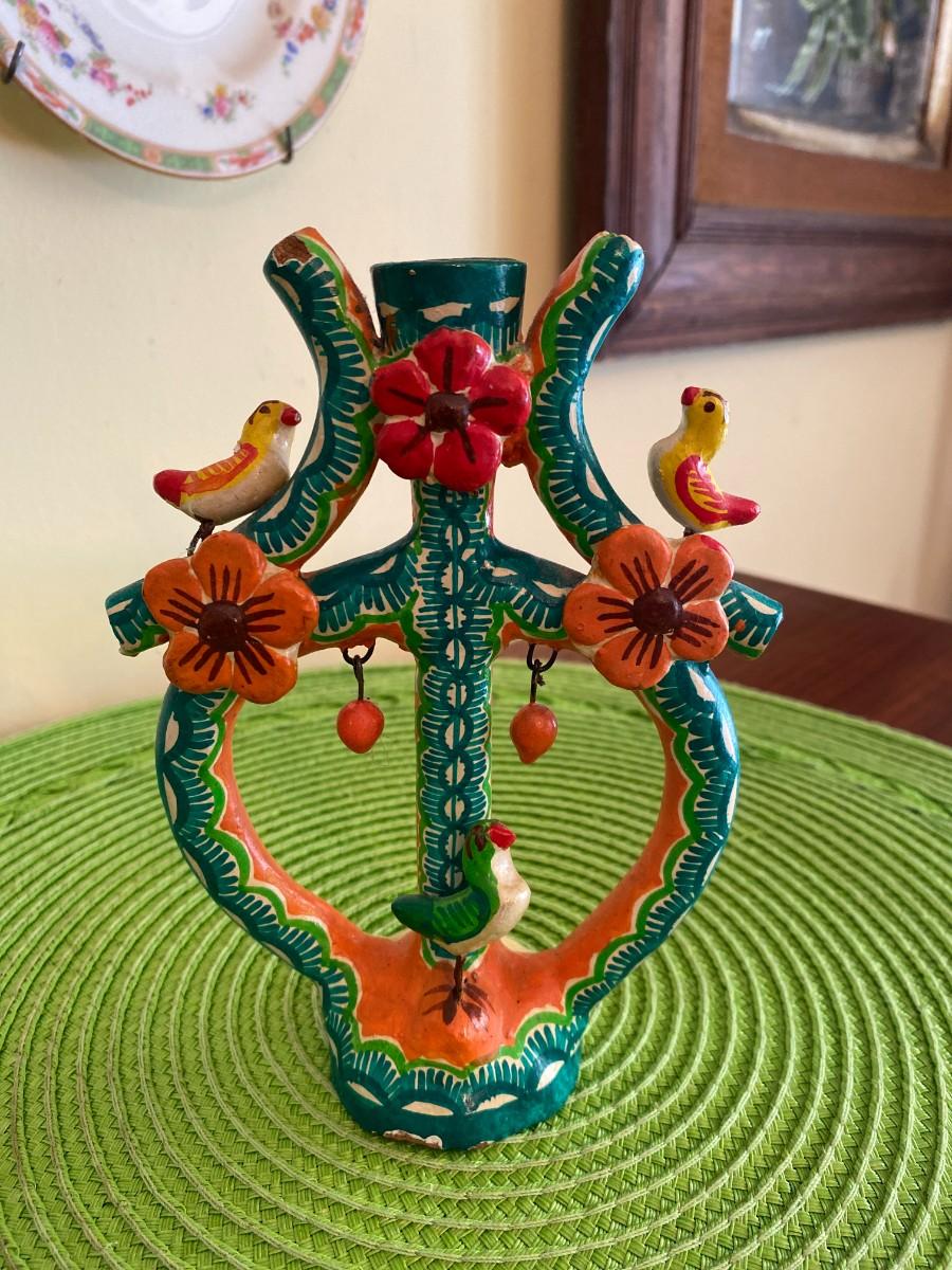 Vintage Mexican Folk Art "Arbol De La Vida" Clay Candle Holder Green