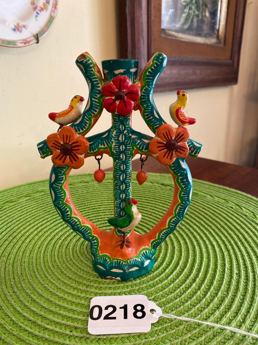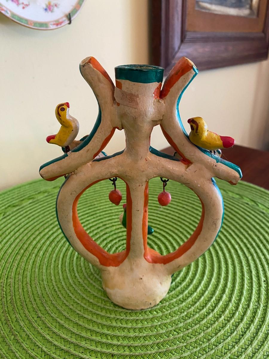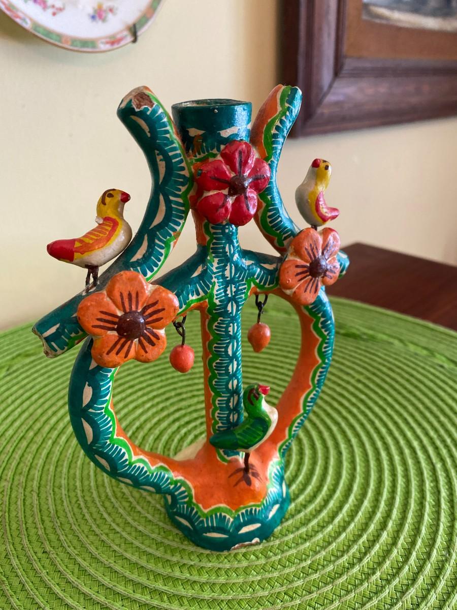 Vintage Mexican Folk Art "Arbol De La Vida" Clay Candle Holder Green