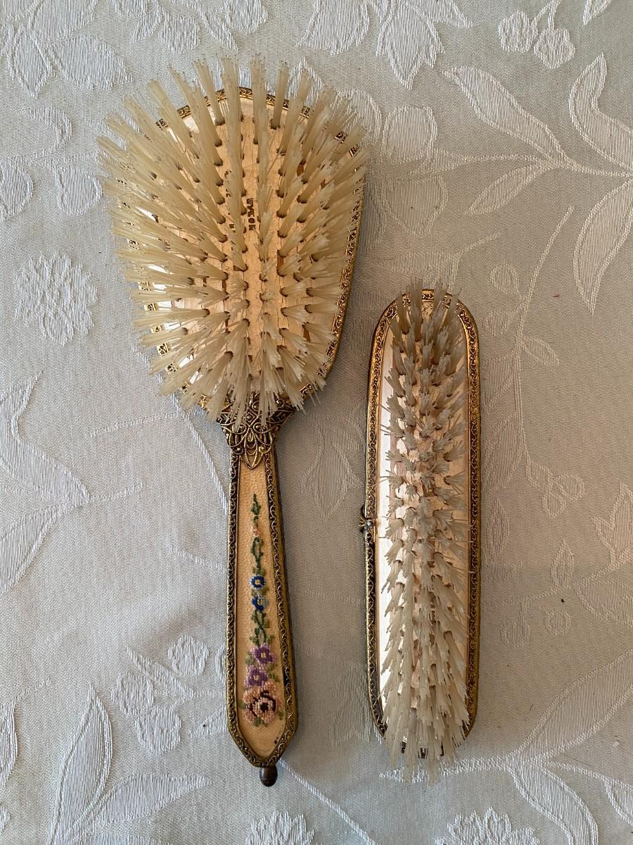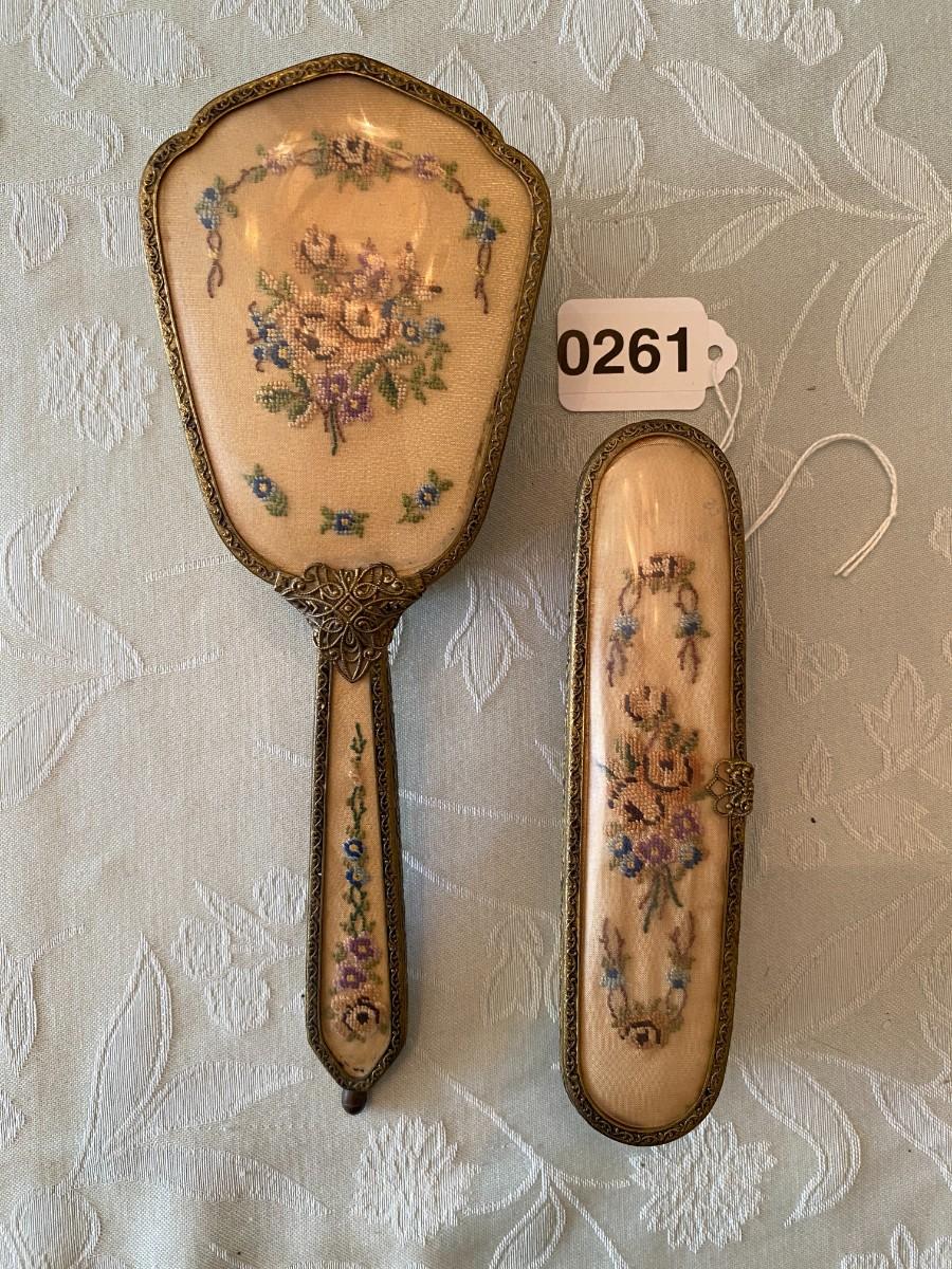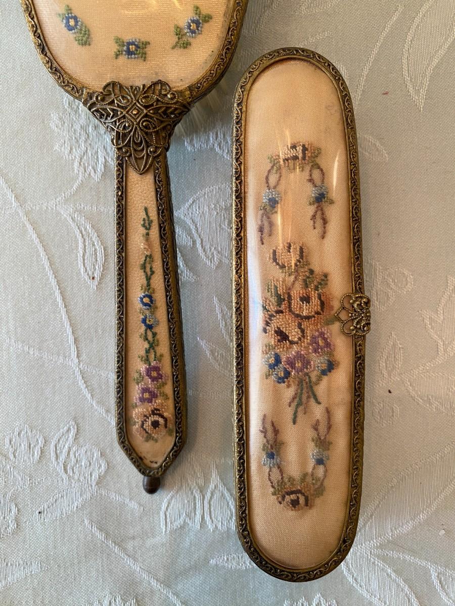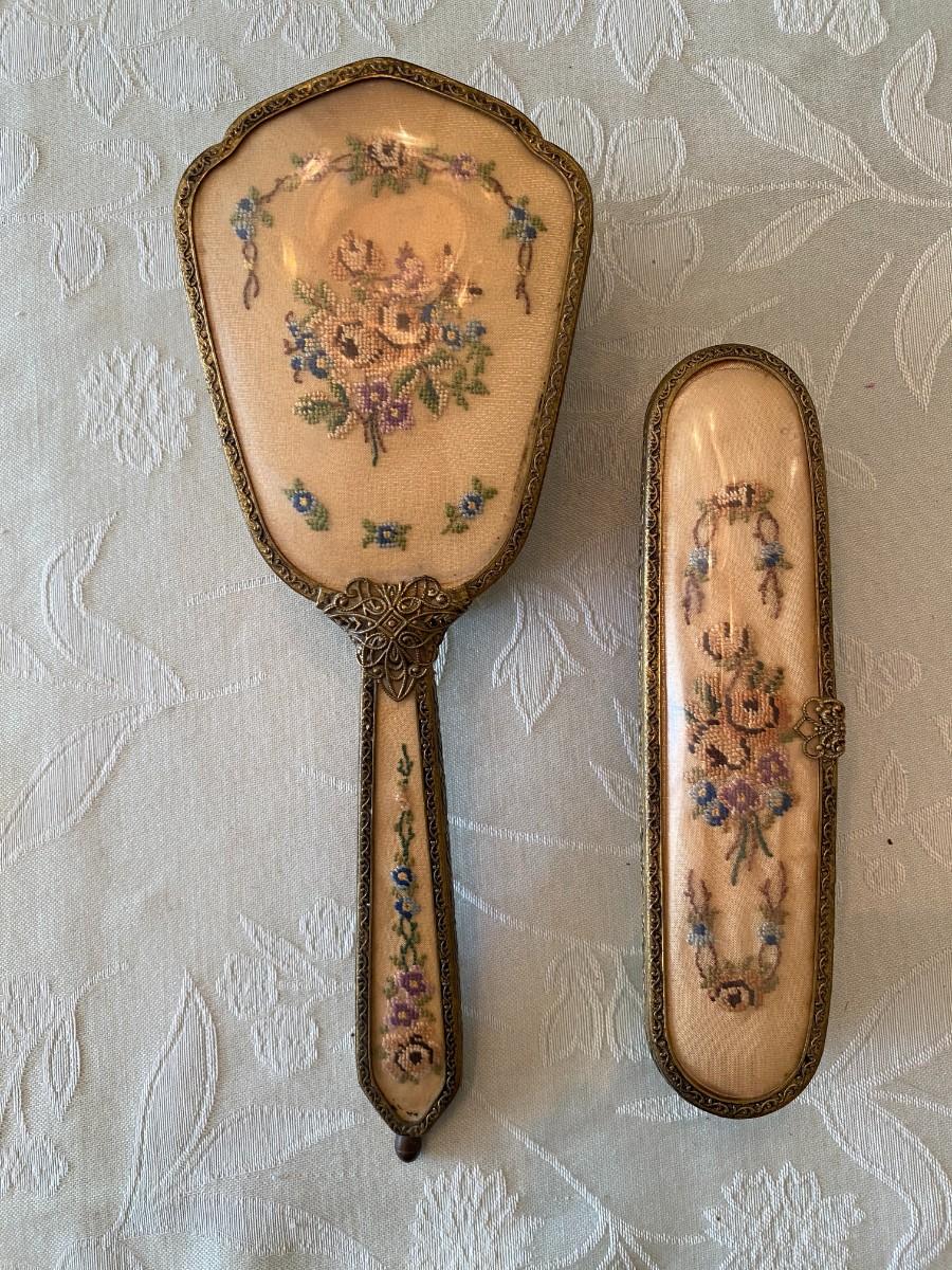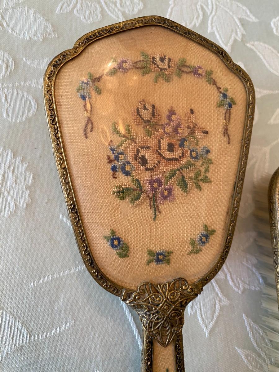 Victorian Gold Filigree and Needlepoint 2 Piece Vanity set by Nycon England