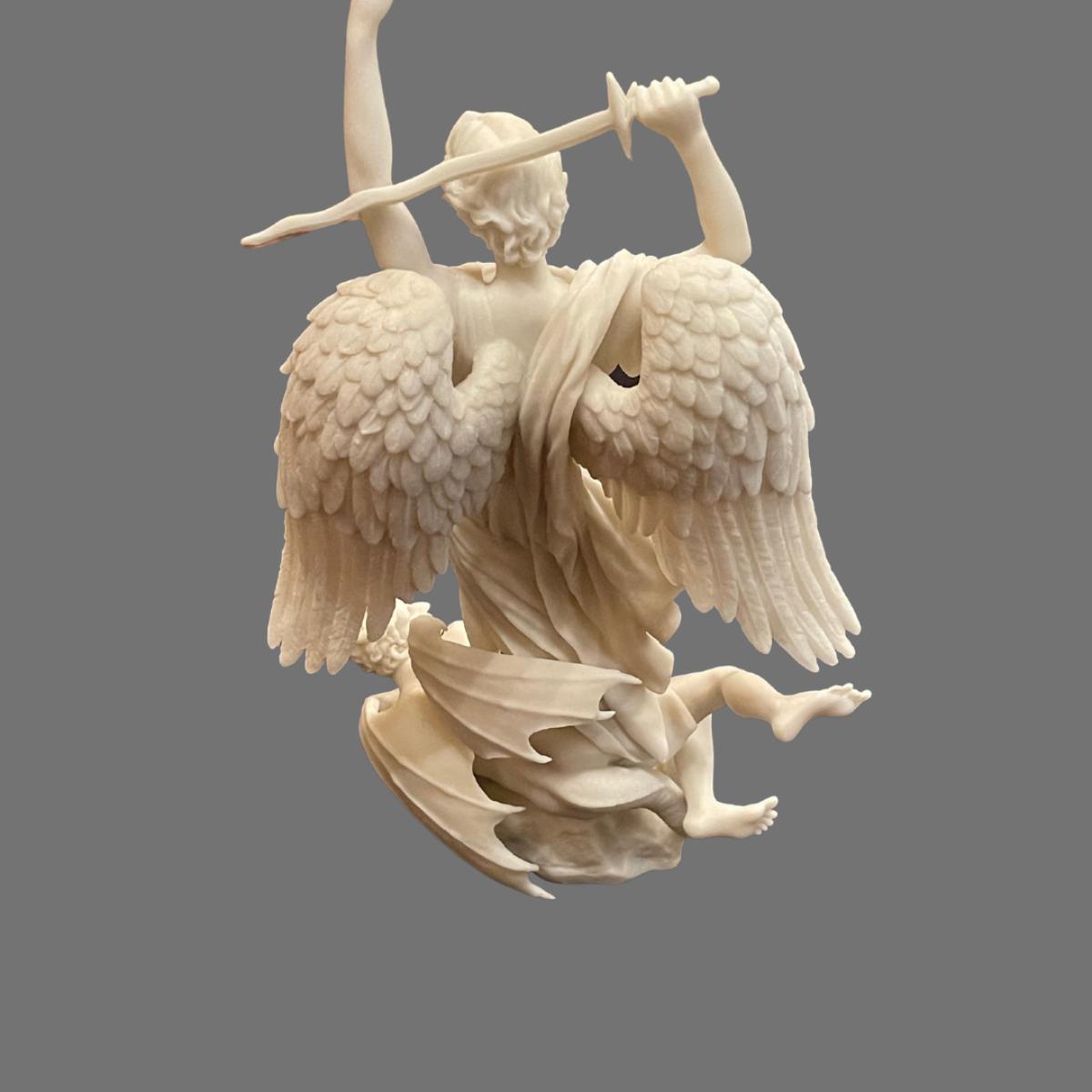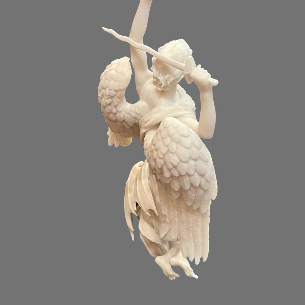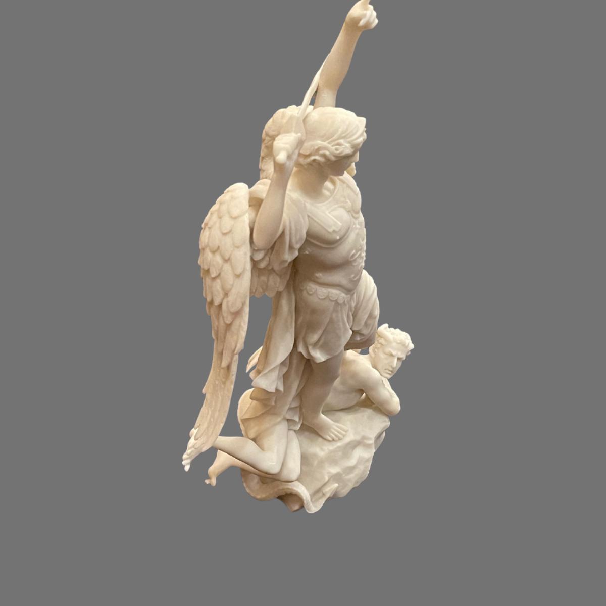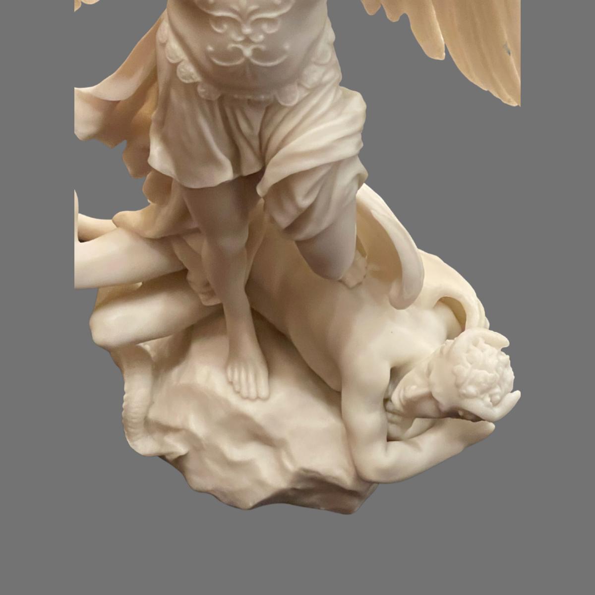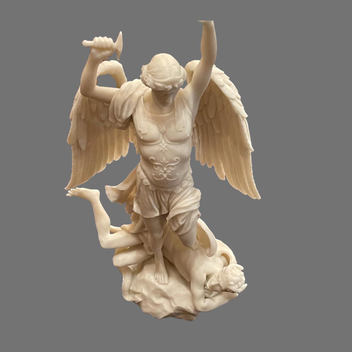 This sculpture is from Paris' most beloved landmark, the Fontaine Saint-Michel. It shows Michel with his sword held high in the final moment of Satan's defeat. This statue measures 14".