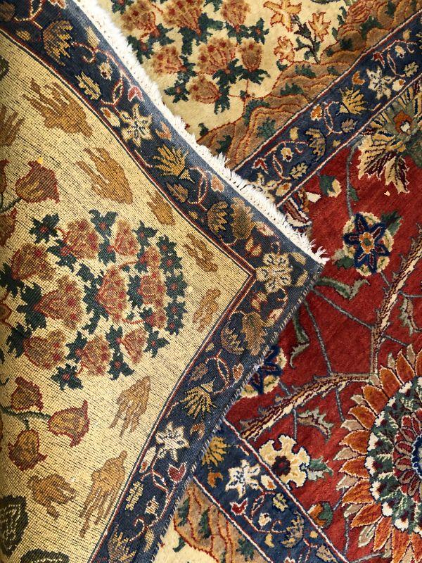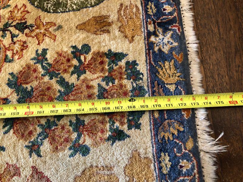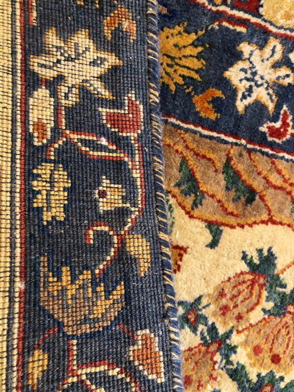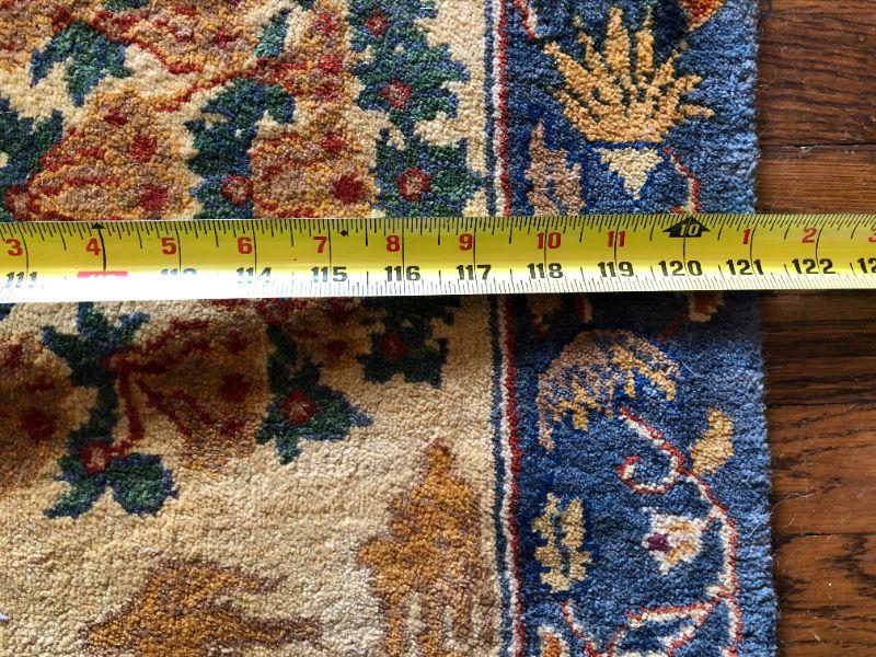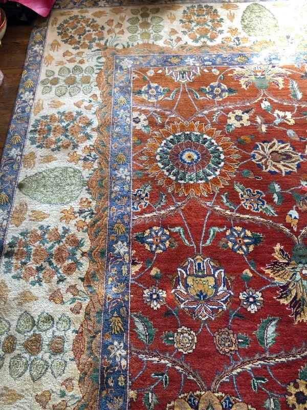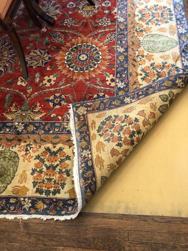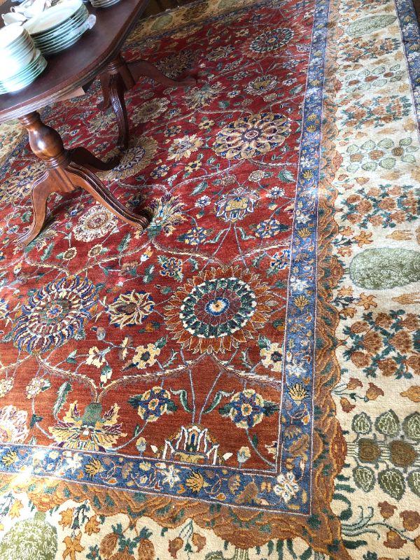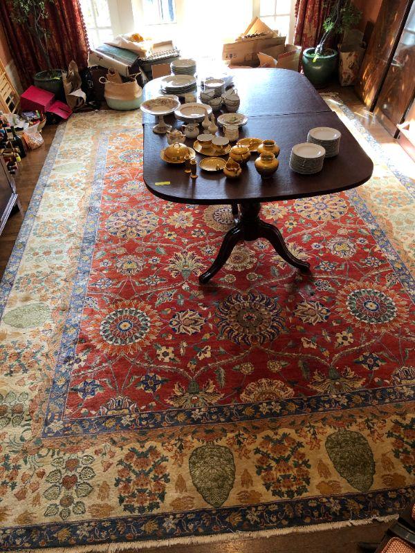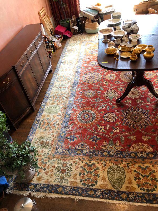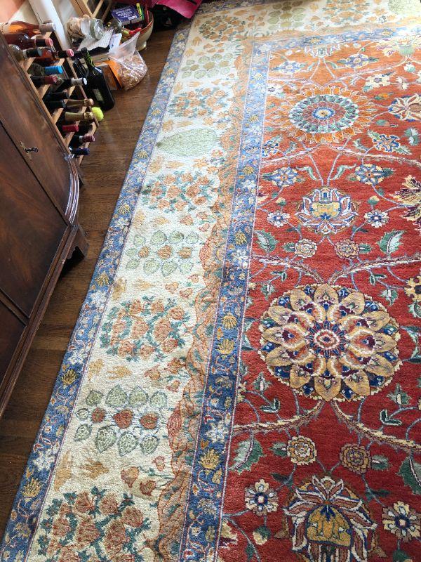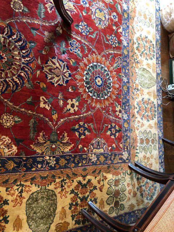 Beautiful large hand woven area rug with a wonderful design of deep red, dark blue, and tan colors. Side of rug closest to window does show signs of color fading from sunlight. The rug measurements are approximately 121 inches by 173 inches. In very good condition. From a San Francisco Presidio Heights family estate.