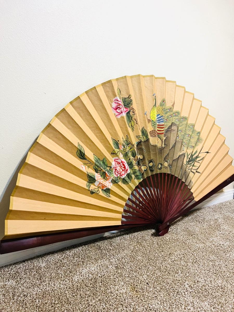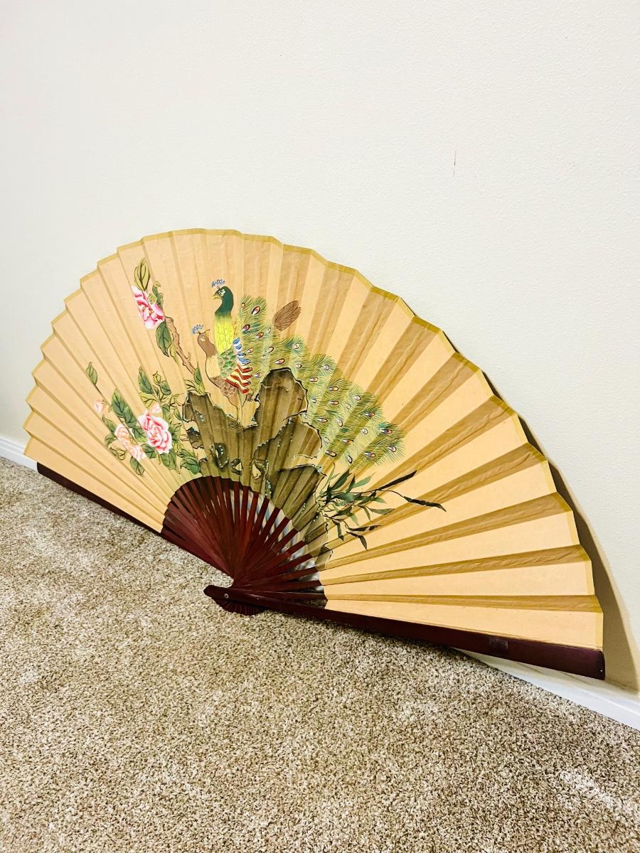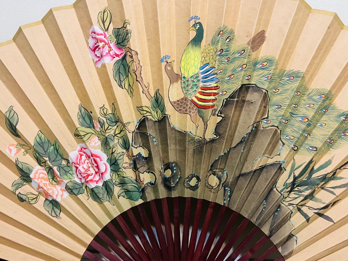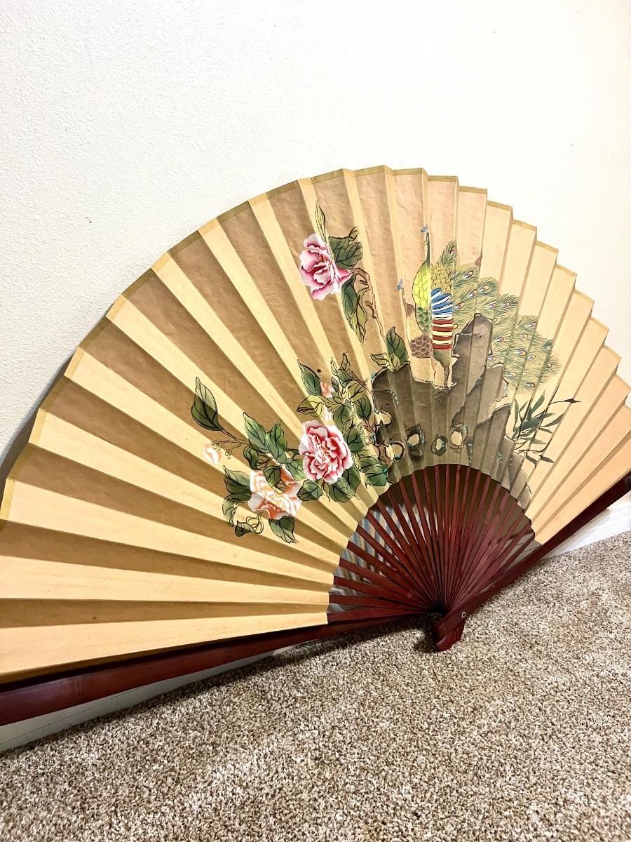 Folding Fan Hand Painted Wooden base with a beautiful peacock and roses. Measuring 57 inches when open and 31 inches tall.