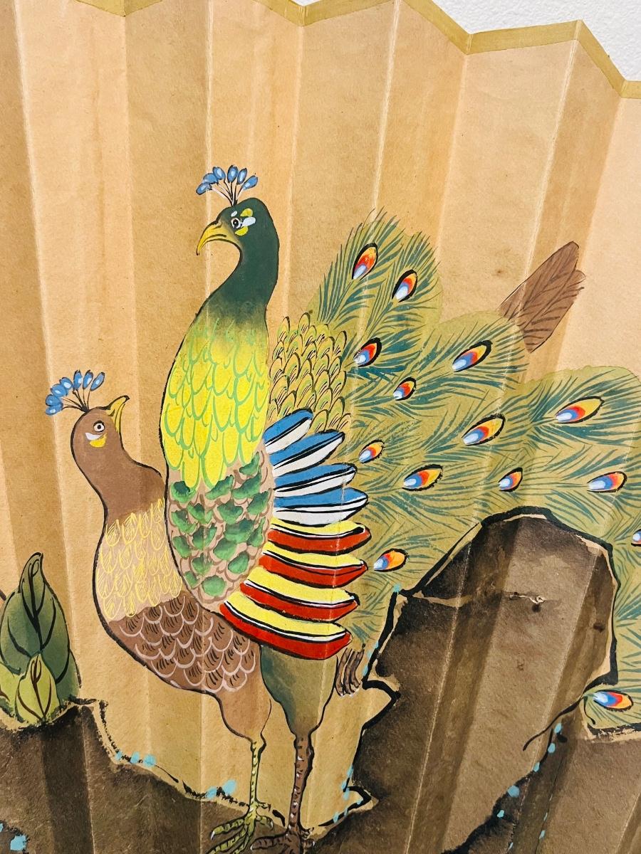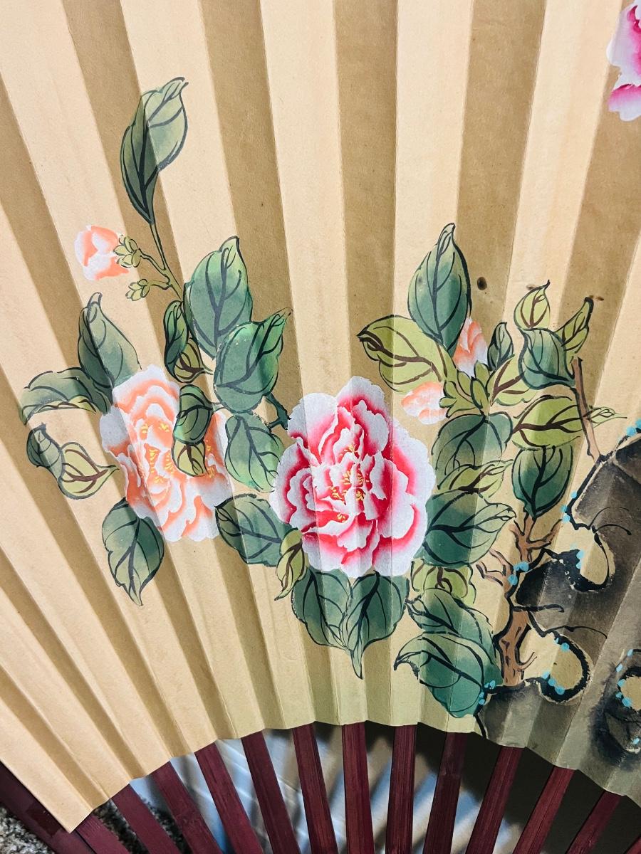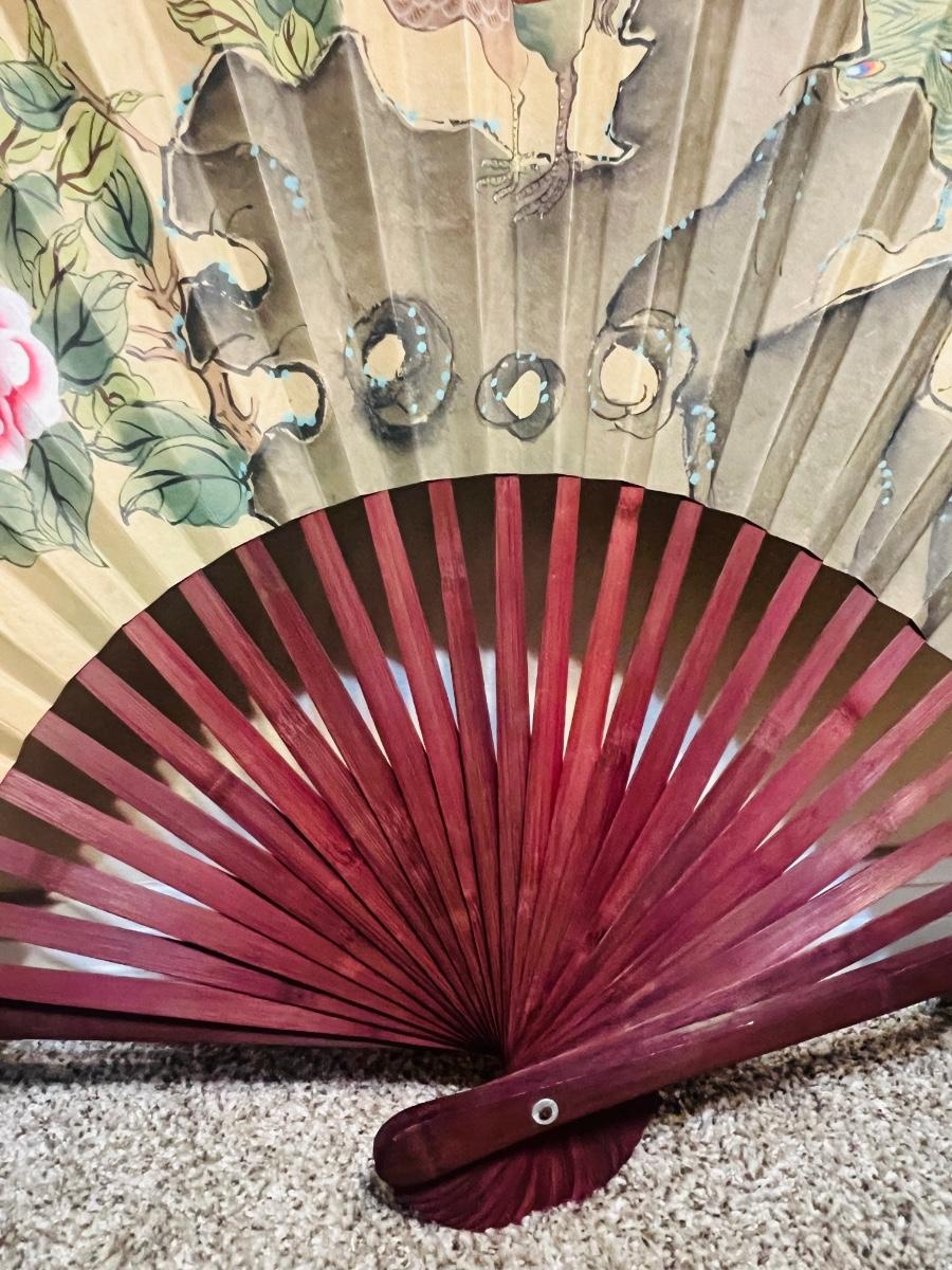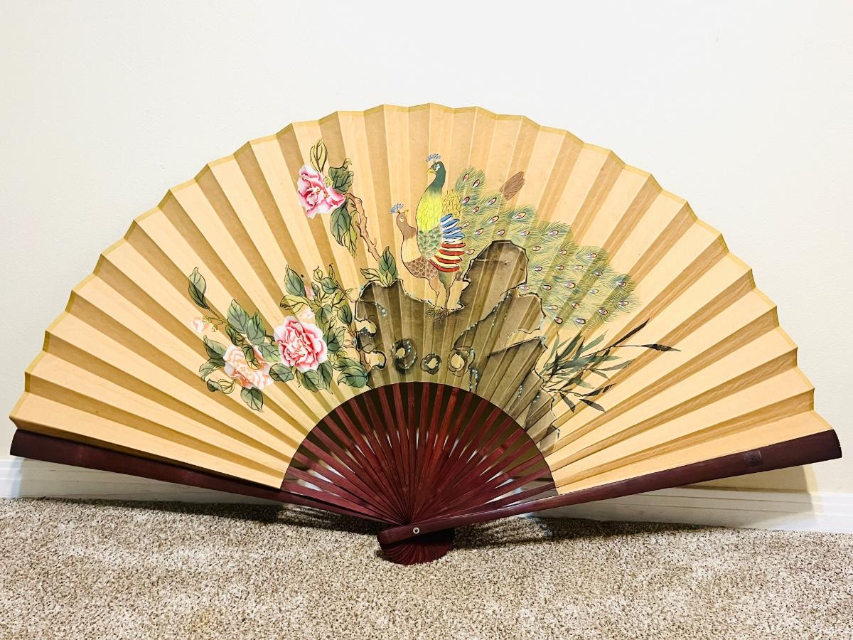 Folding Fan Hand Painted Wooden base with a beautiful peacock and roses. Measuring 57 inches when open and 31 inches tall.