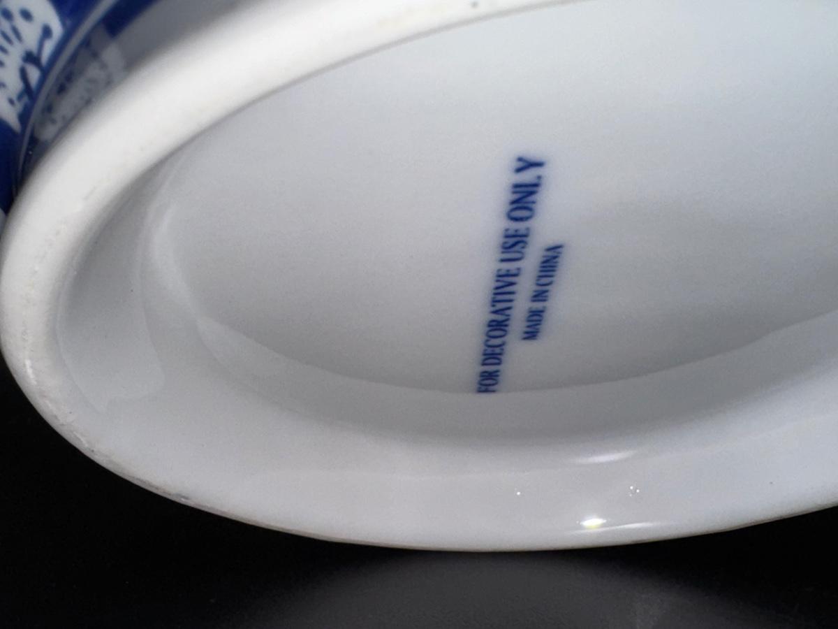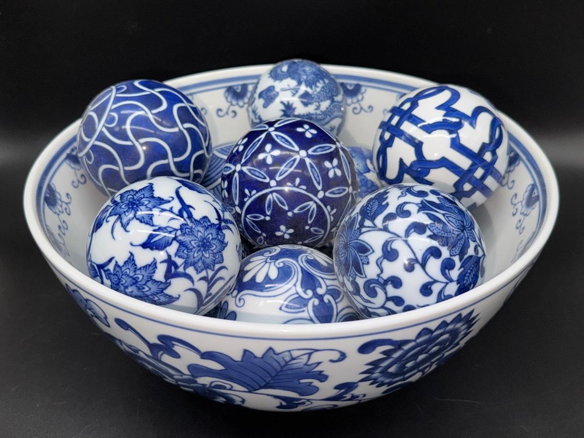 Large 12” Blue and White Bowl Filled with Porcelain Balls