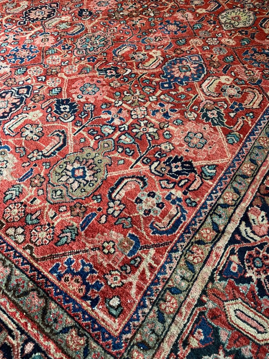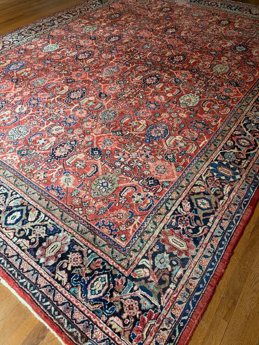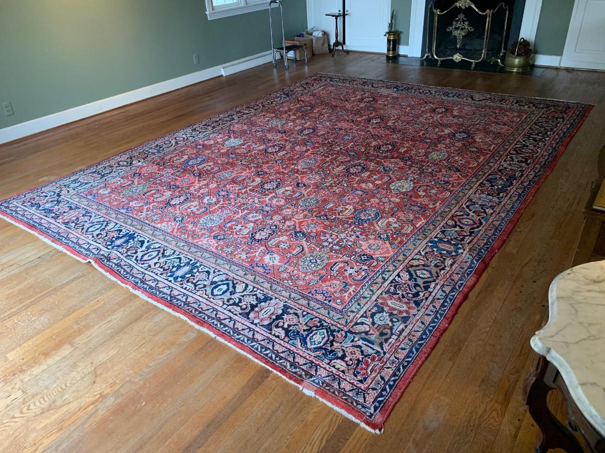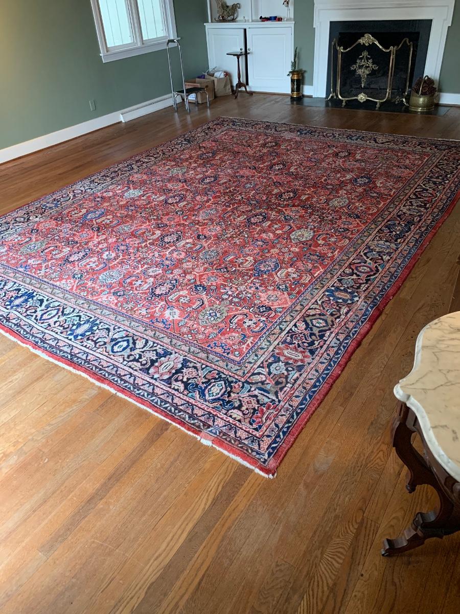 Large colorful red and blue area rug, measures 13’ x 10'. This rug is in good condition and comes with a rug pad. Pad is worn, and has been mended with duct tape. Please see photos for details. Local pick-up only.