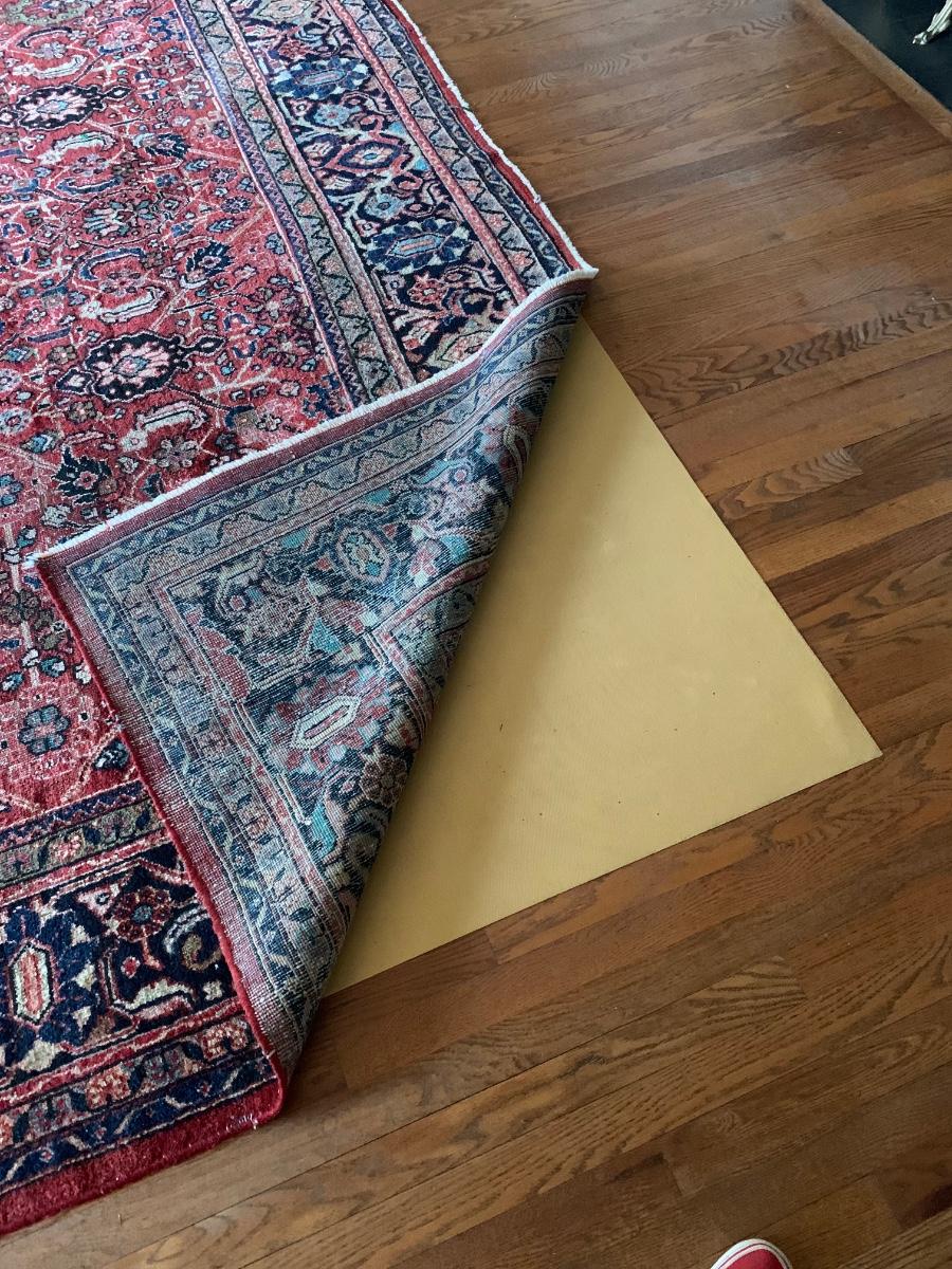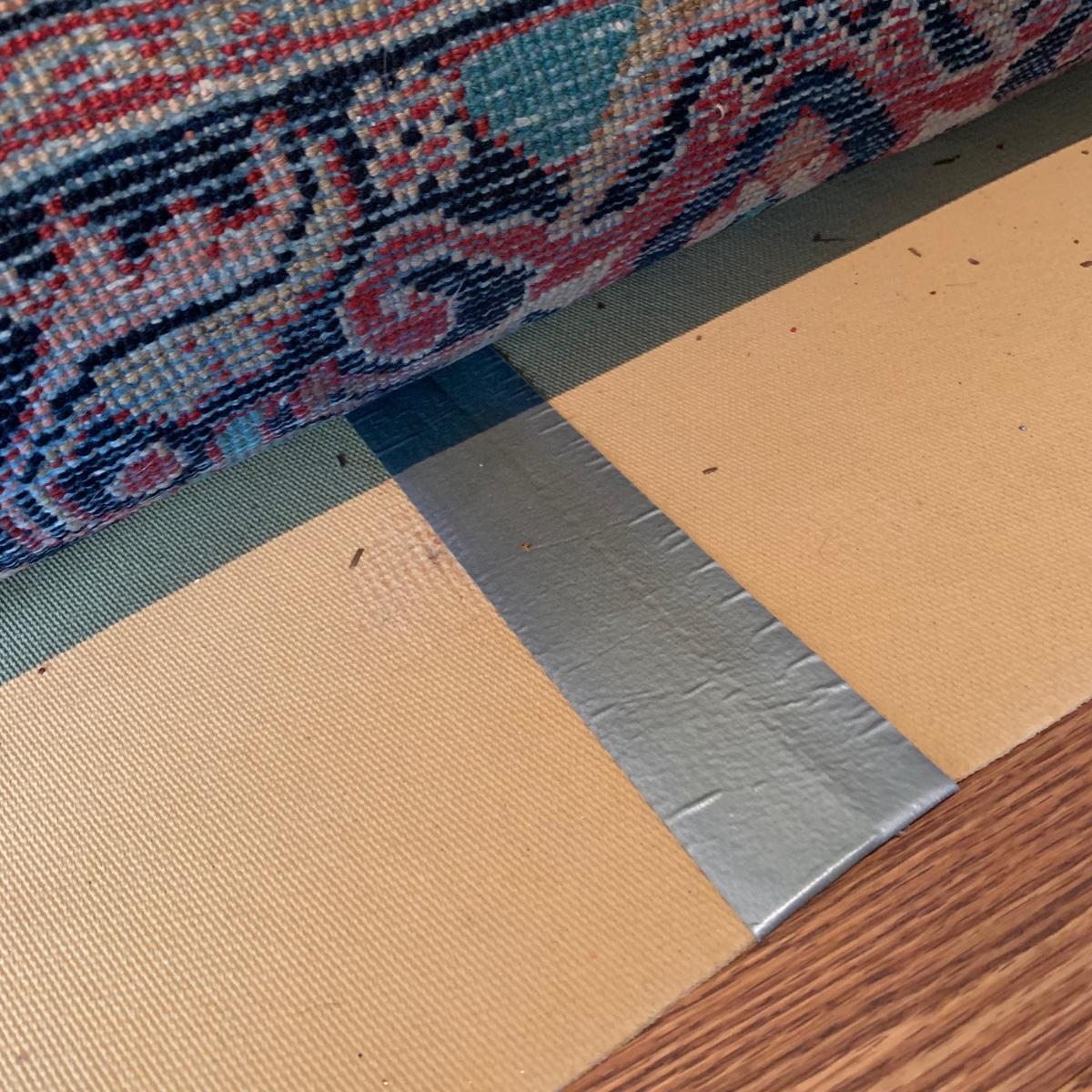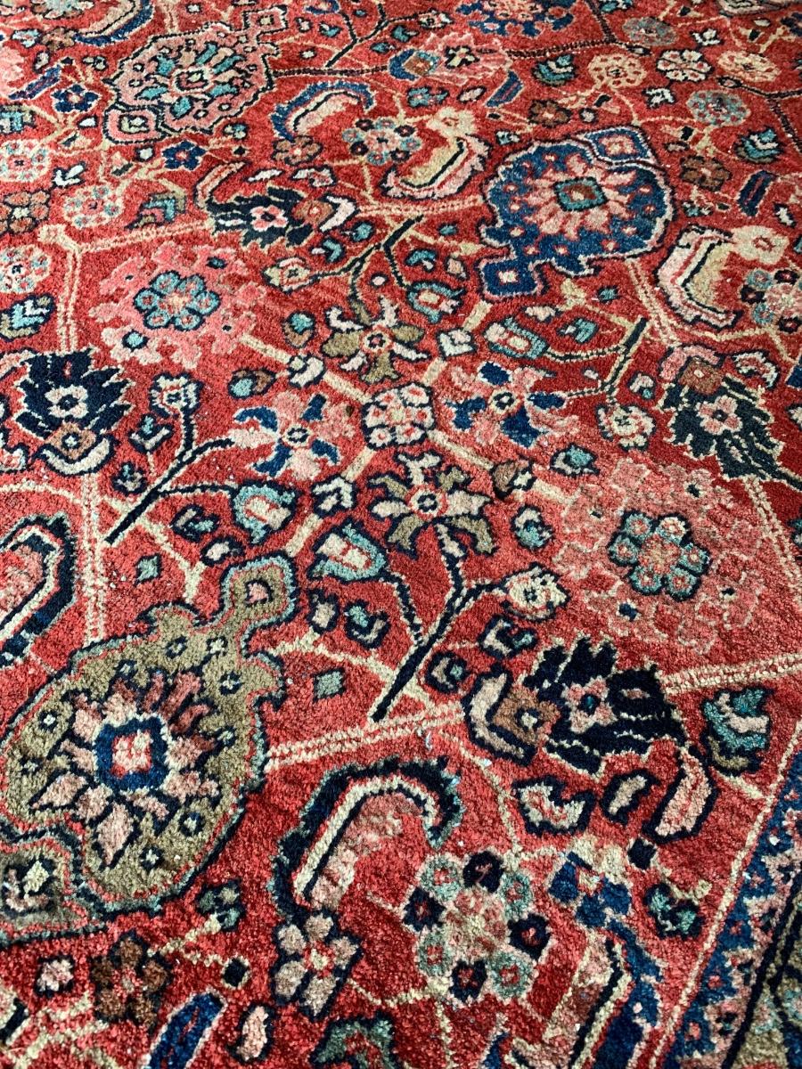 Large colorful red and blue area rug, measures 13’ x 10'. This rug is in good condition and comes with a rug pad. Pad is worn, and has been mended with duct tape. Please see photos for details. Local pick-up only.