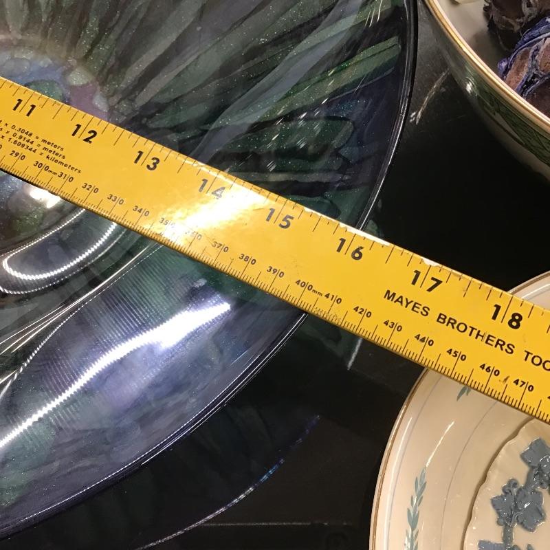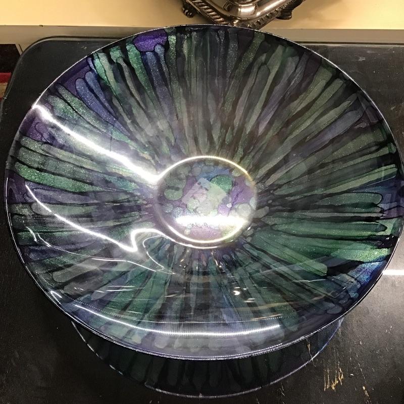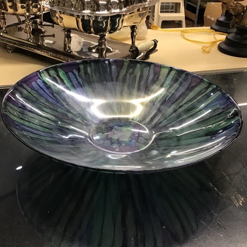 Please see all pictures. Beautiful Freeman’s and blues on the inside of the bowl and the outside of the bowl is shimmering Silver. Available for immediate pickup.