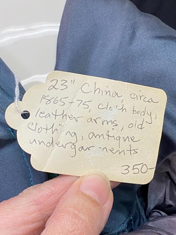 Large German china head doll. Flat top hair with vertical curls. Dress has faded but I believe it was once green based on stitching and zipper. Leather arms. There is a tag attached that puts this from 1865-1875. Other then the fade of dress in really good condition