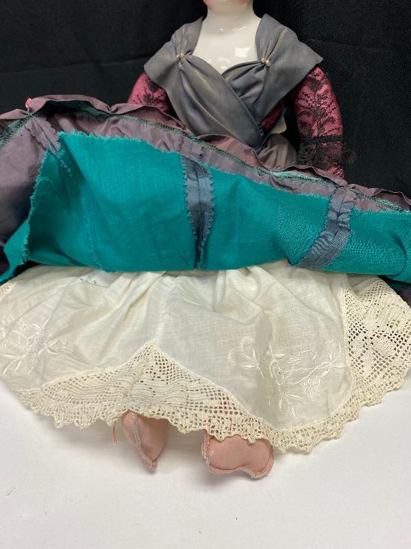 Large German china head doll. Flat top hair with vertical curls. Dress has faded but I believe it was once green based on stitching and zipper. Leather arms. There is a tag attached that puts this from 1865-1875. Other then the fade of dress in really good condition