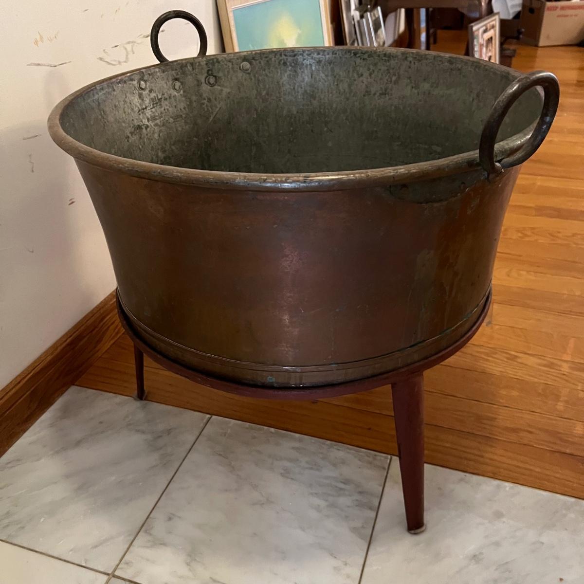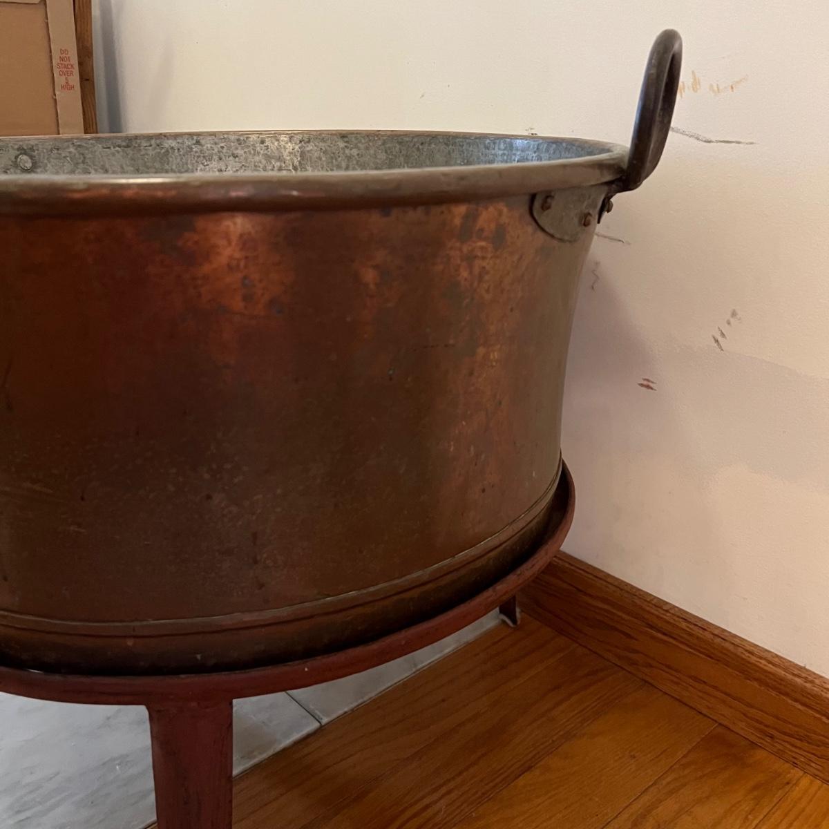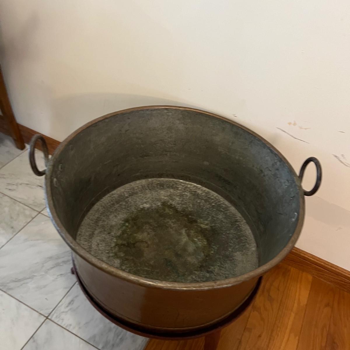This large copper clad pot with handles measures 24”D x 11”H and comes with a 10.5”H iron stand. Pot has a slightly rounded base. Please see photos for details.