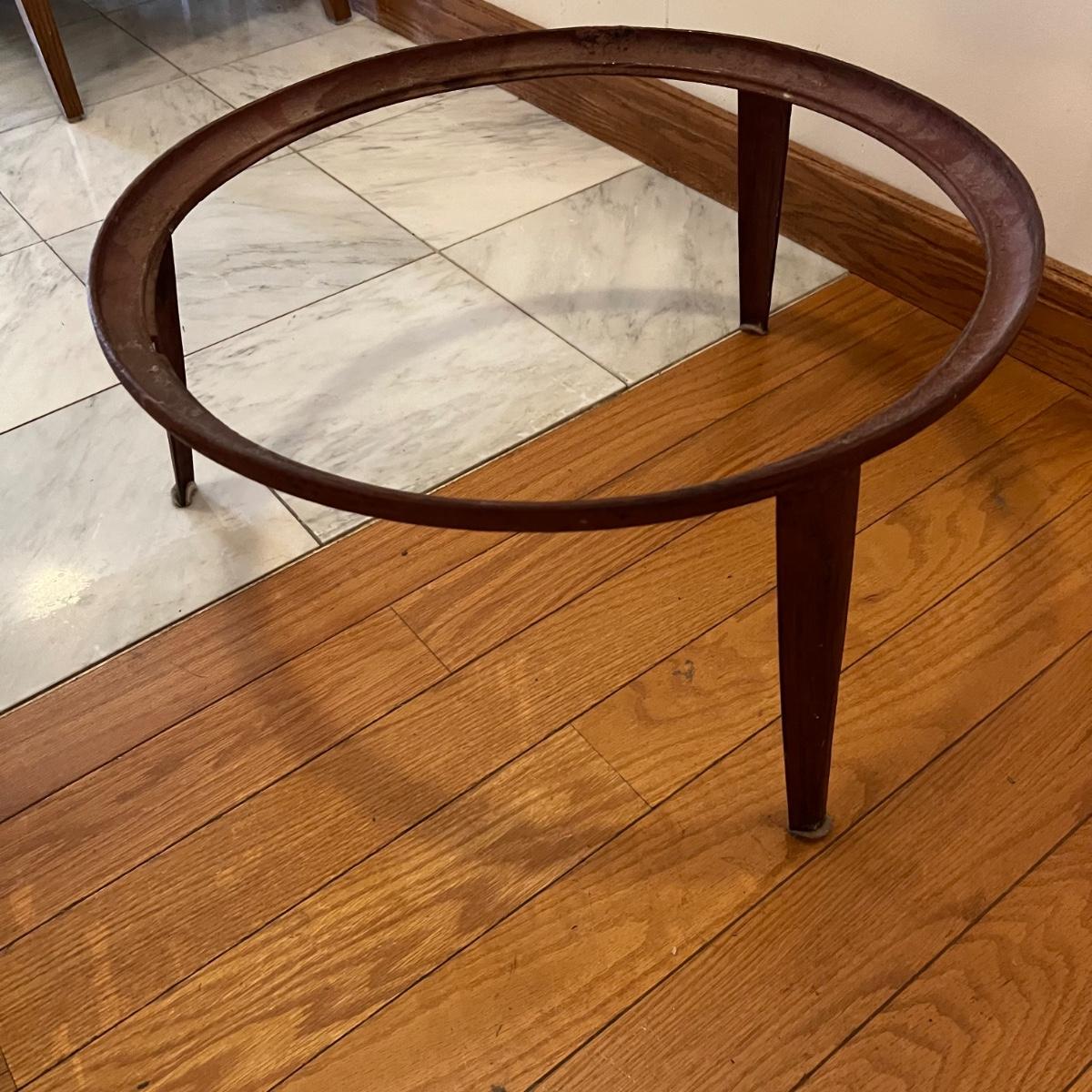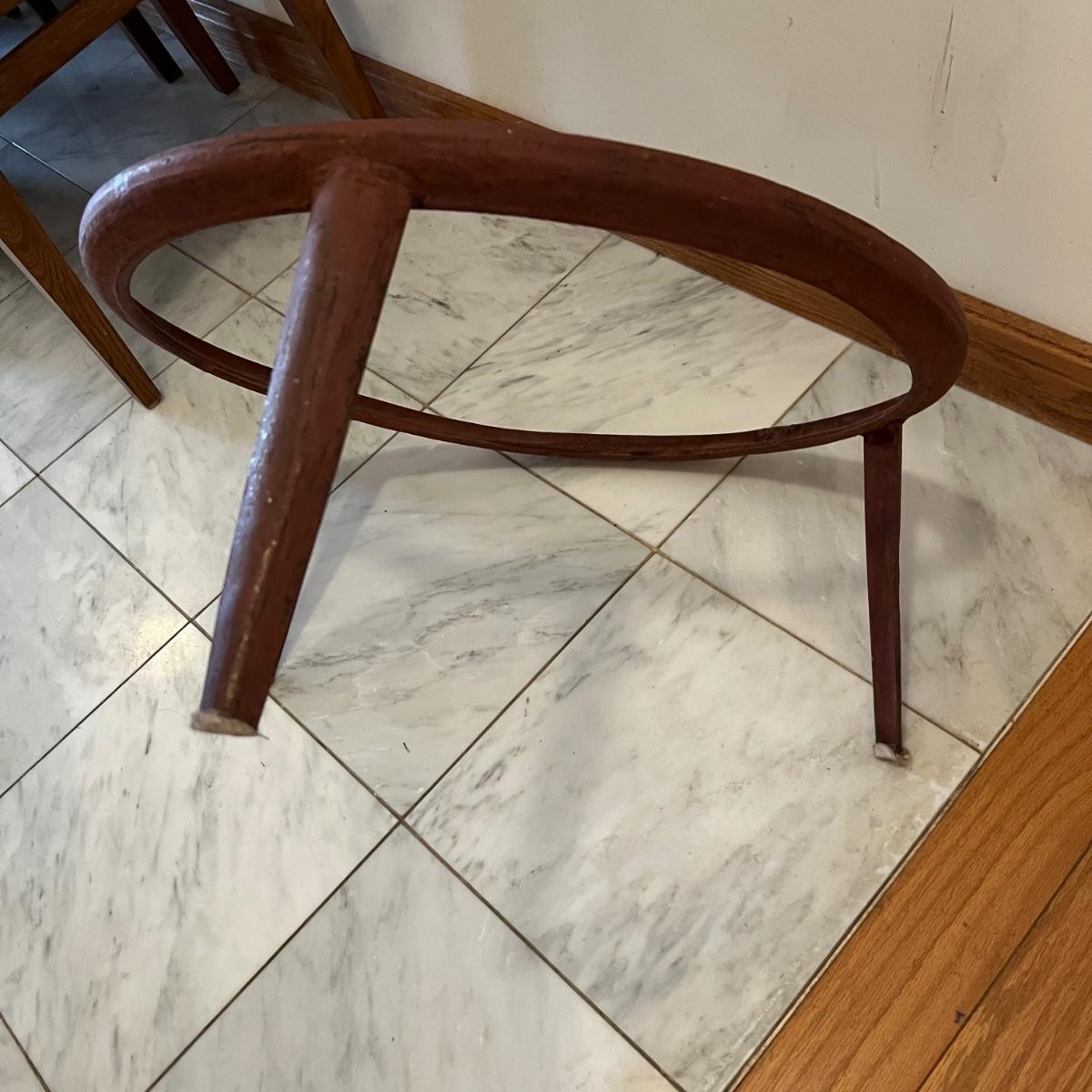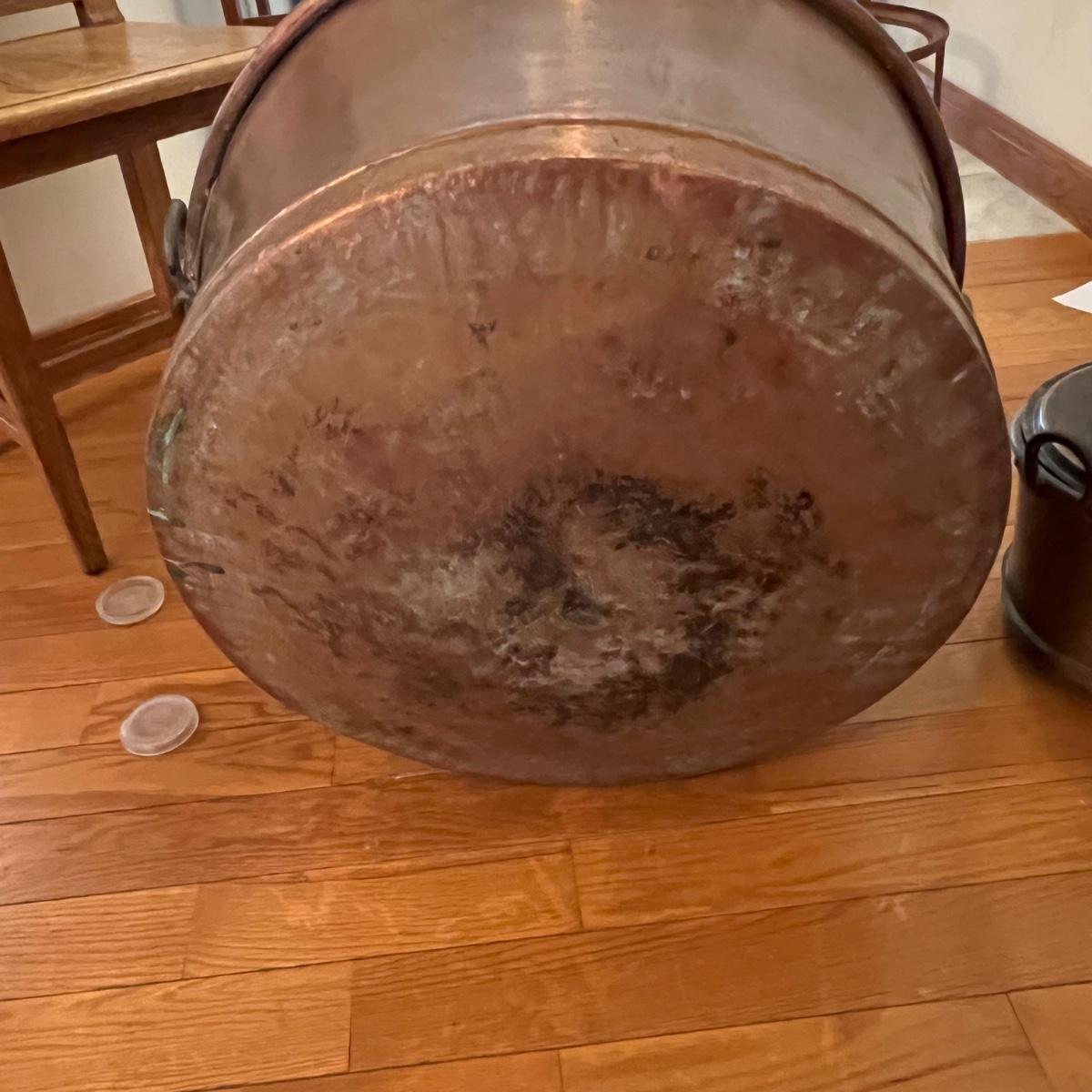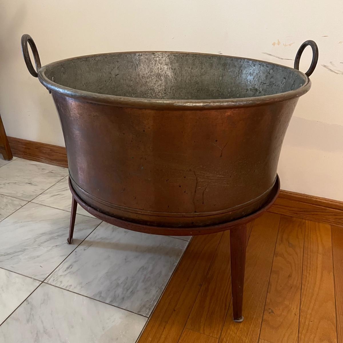 This large copper clad pot with handles measures 24”D x 11”H and comes with a 10.5”H iron stand. Pot has a slightly rounded base. Please see photos for details.
