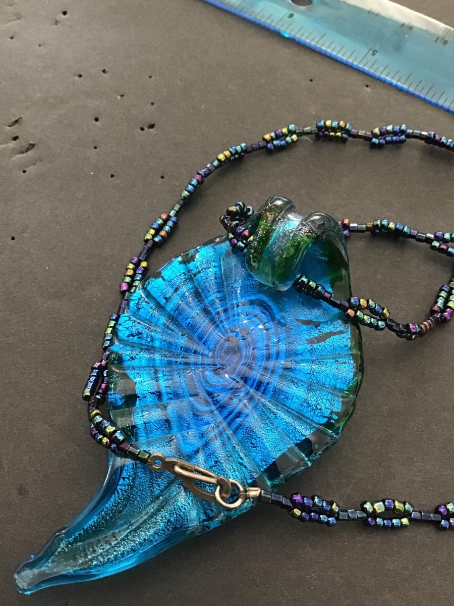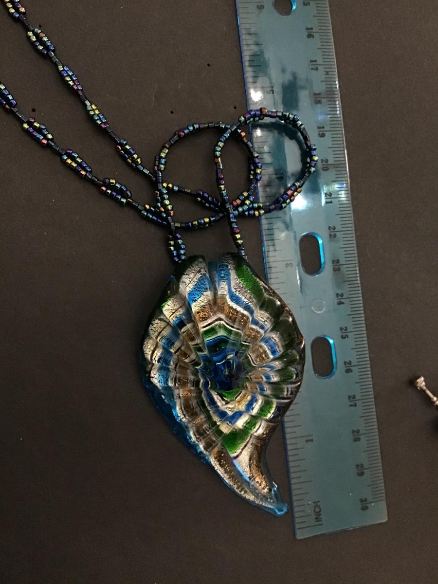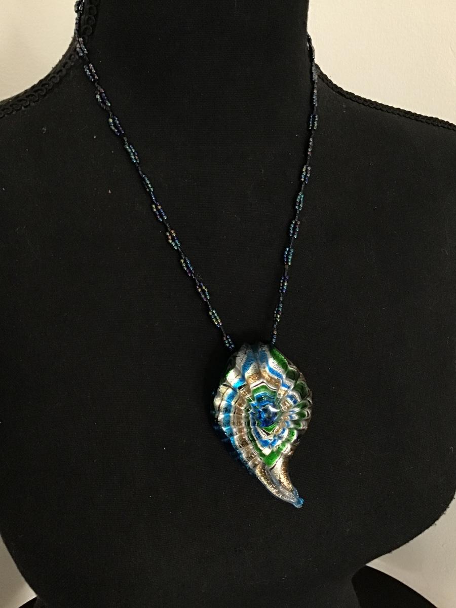 Large 3 Inch Glass. Shell Pendant on Vintage Glass Beaded Chain