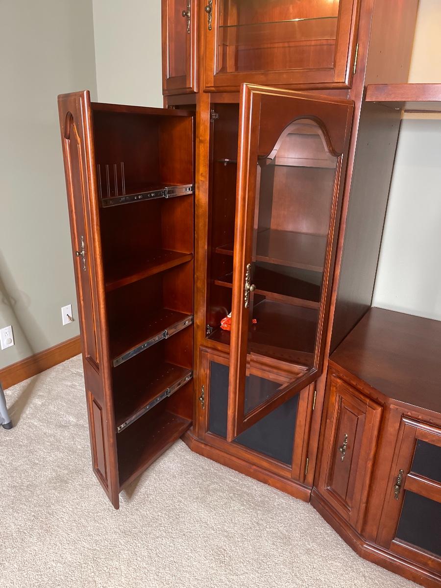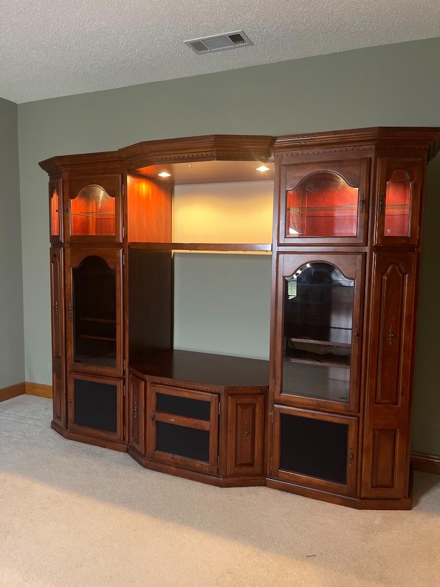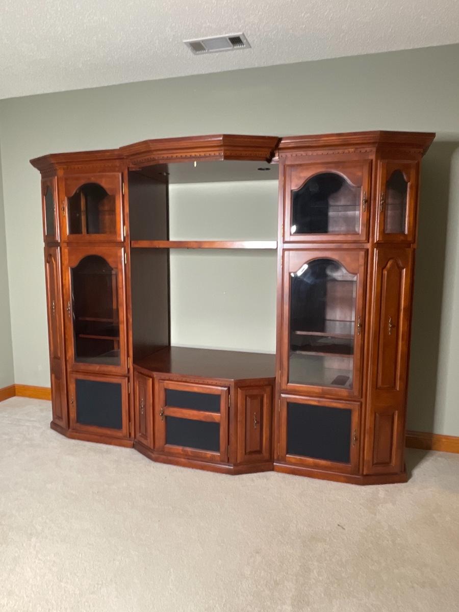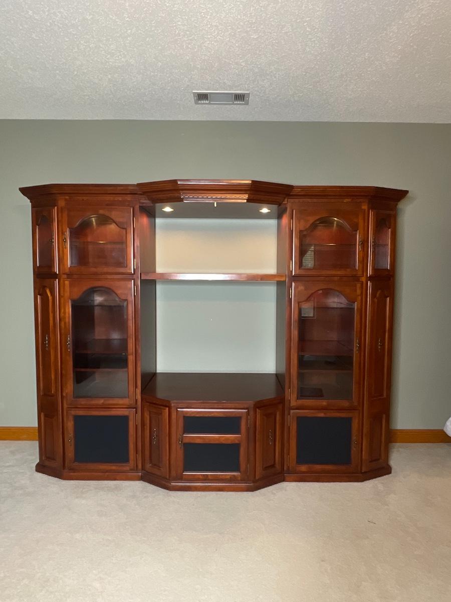 All glass and wood shelves are adjustable. Measurements taken in its smallest position. This piece’s width can extend approximately 16 more inches to accommodate a larger TV. Lower cabinets are shown with black speaker screens but can interchangeable with wood panels that are included. No brand or marking found.