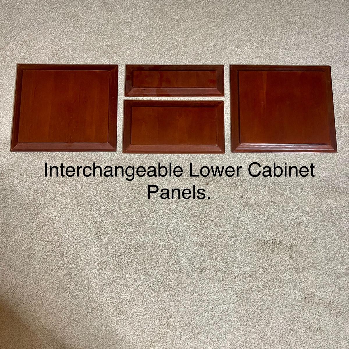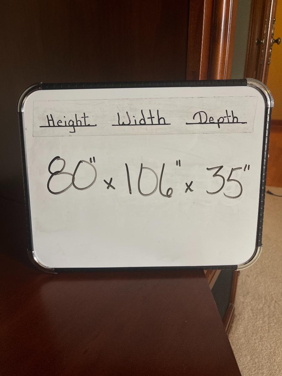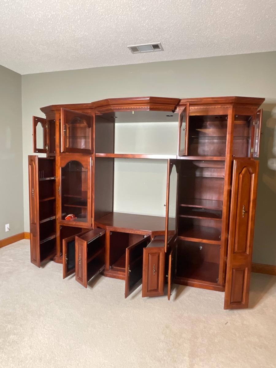 All glass and wood shelves are adjustable. Measurements taken in its smallest position. This piece’s width can extend approximately 16 more inches to accommodate a larger TV. Lower cabinets are shown with black speaker screens but can interchangeable with wood panels that are included. No brand or marking found.