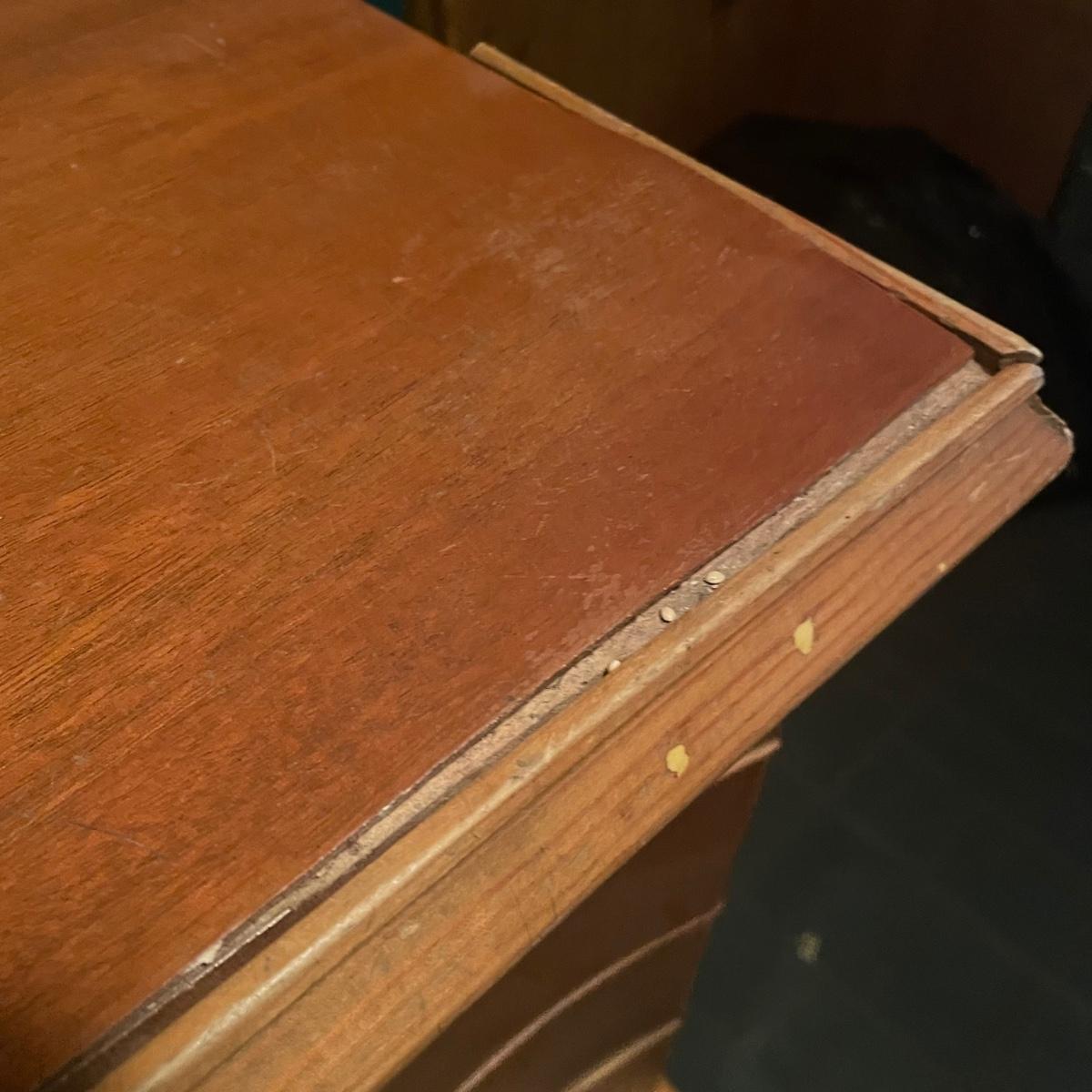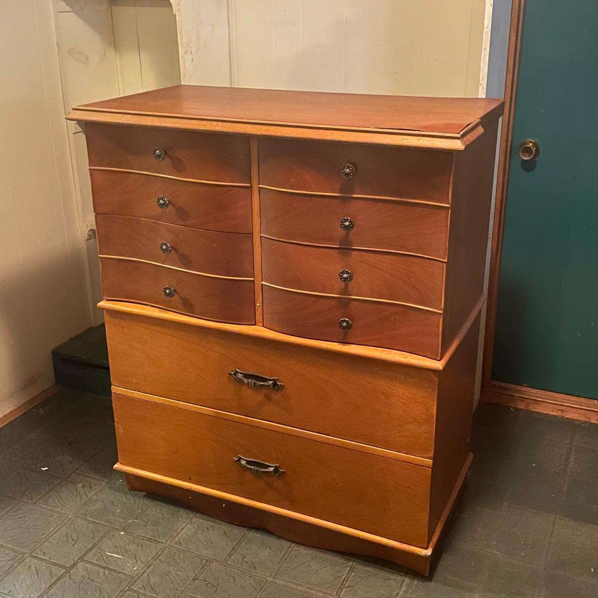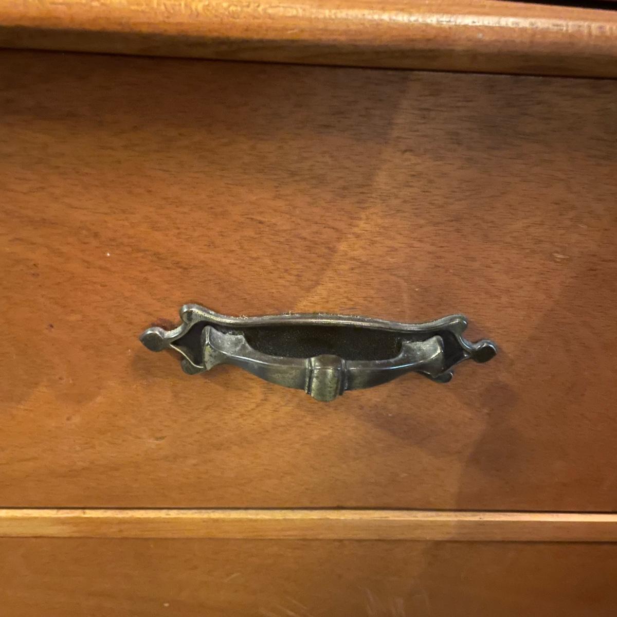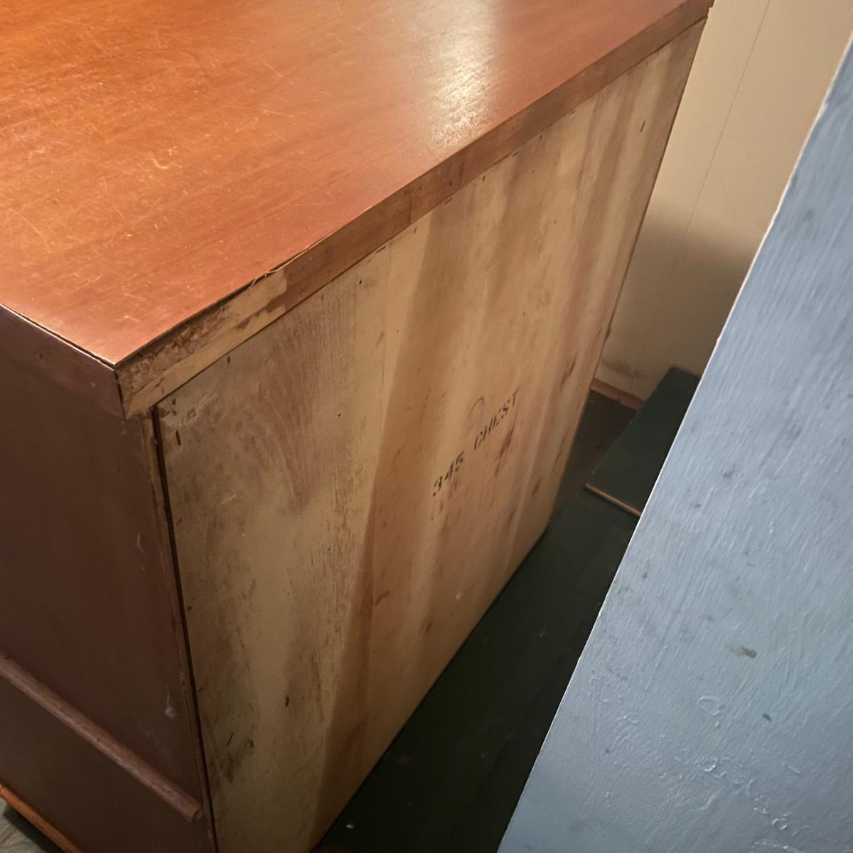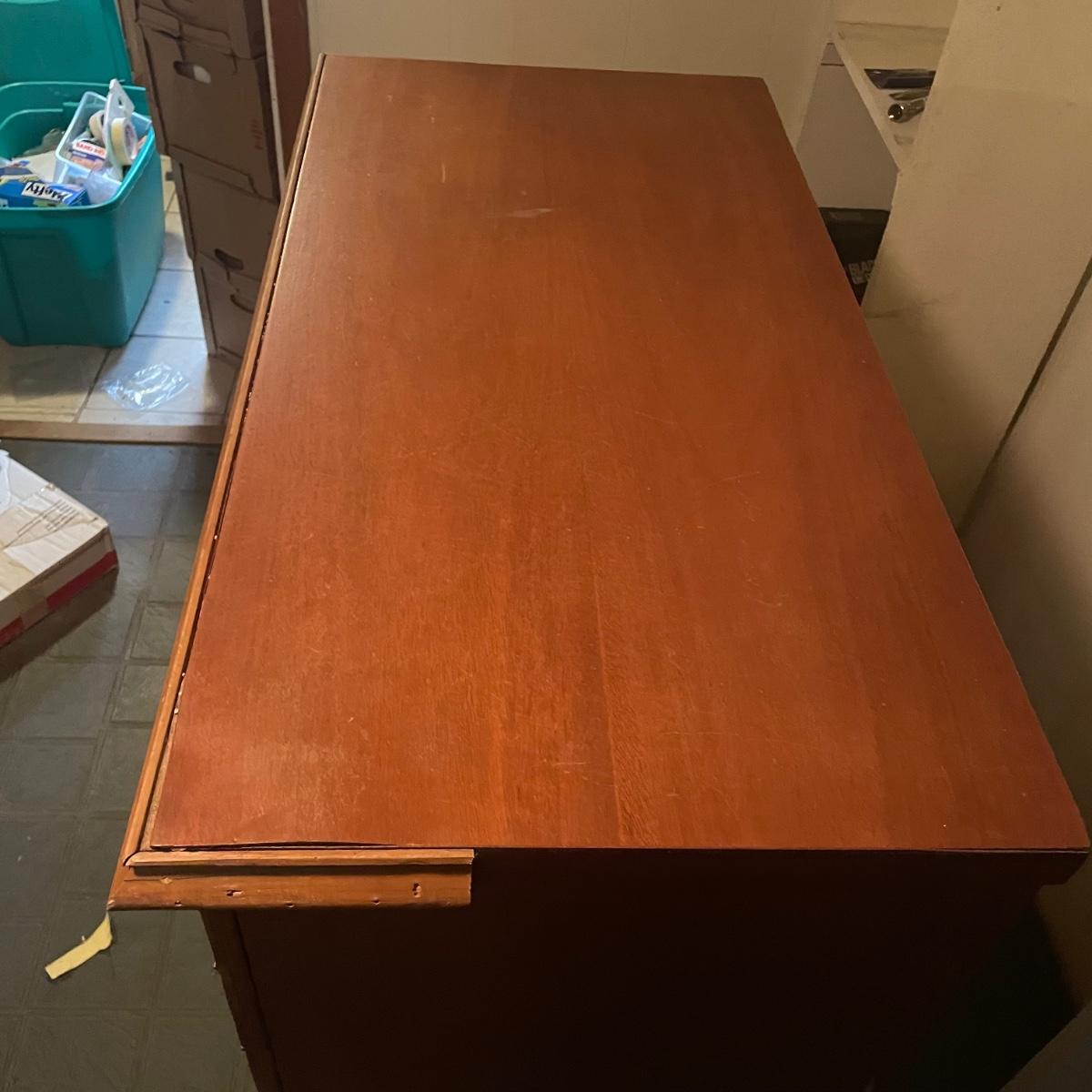 This solid wood dresser has six spacious dovetailed drawers with brass colored hardware. It has a slight lift in the veneer on the top right hand surface and it appears a piece of wood trim was added to the top section (Front and sides) which should be easy to remove if desired. A few scuff marks are shown in images.