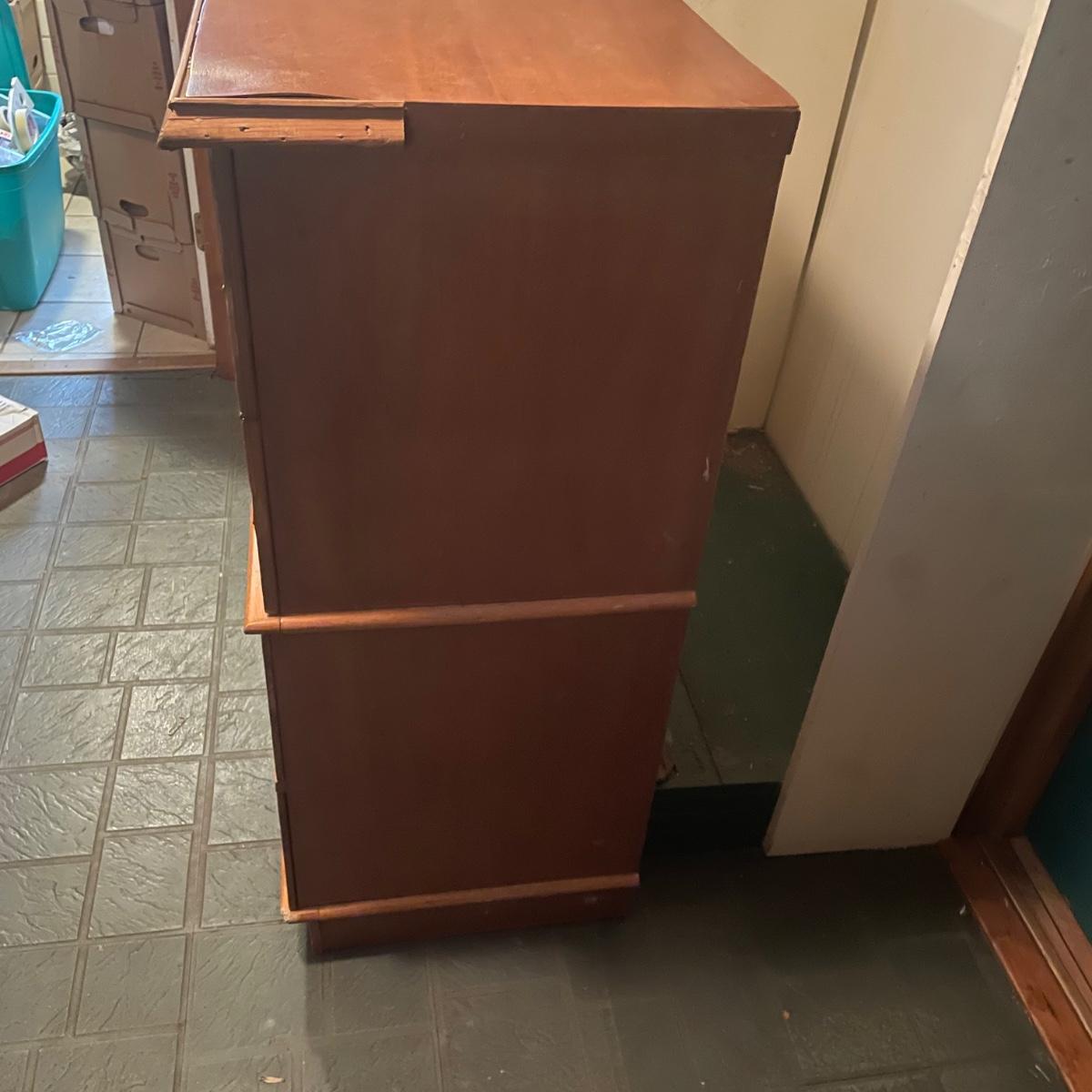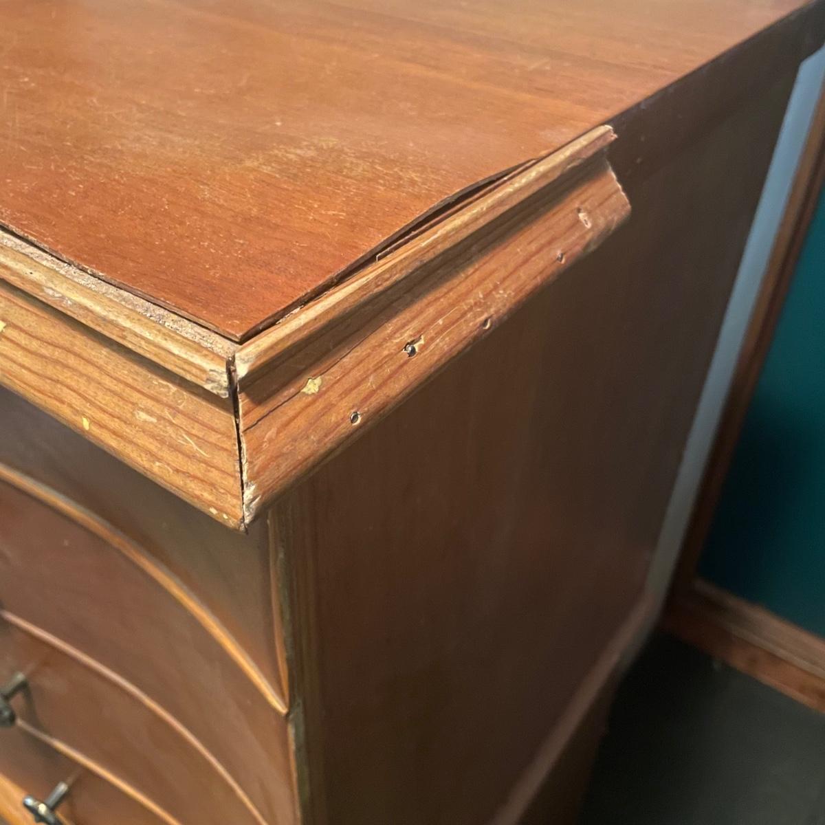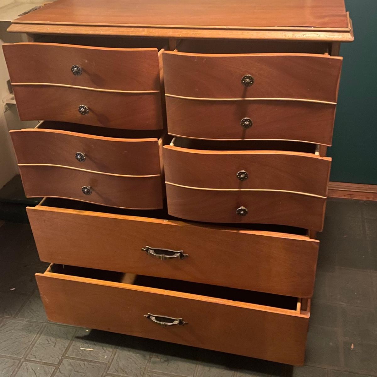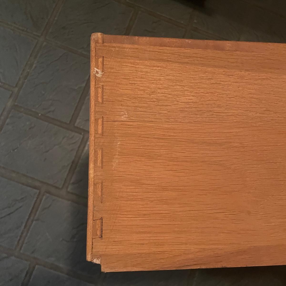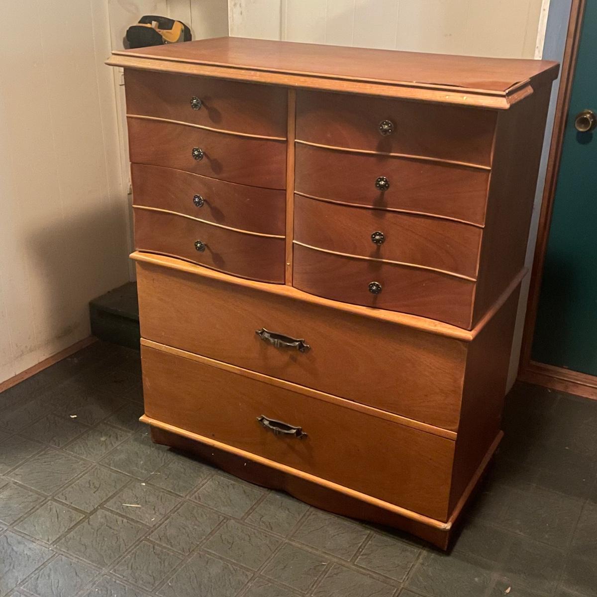 This solid wood dresser has six spacious dovetailed drawers with brass colored hardware. It has a slight lift in the veneer on the top right hand surface and it appears a piece of wood trim was added to the top section (Front and sides) which should be easy to remove if desired. A few scuff marks are shown in images.