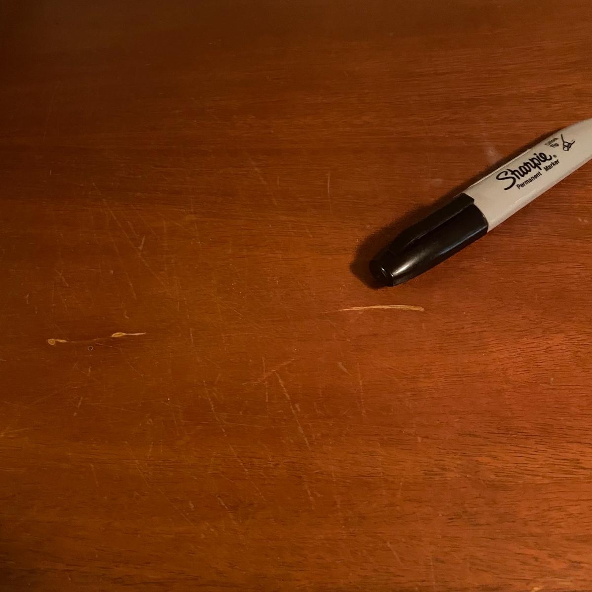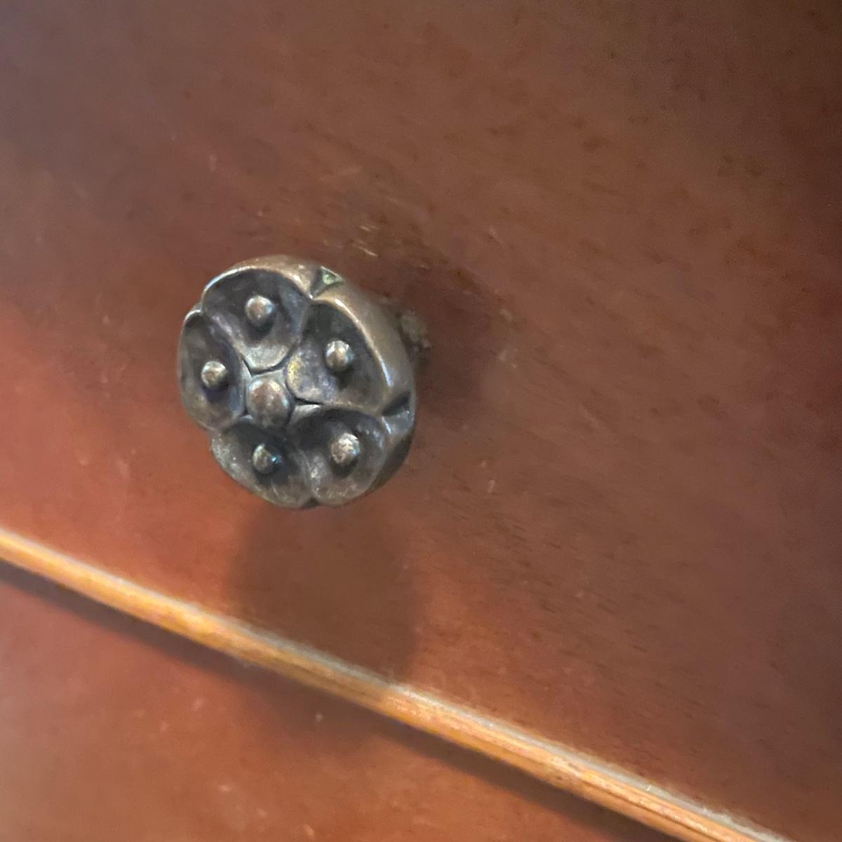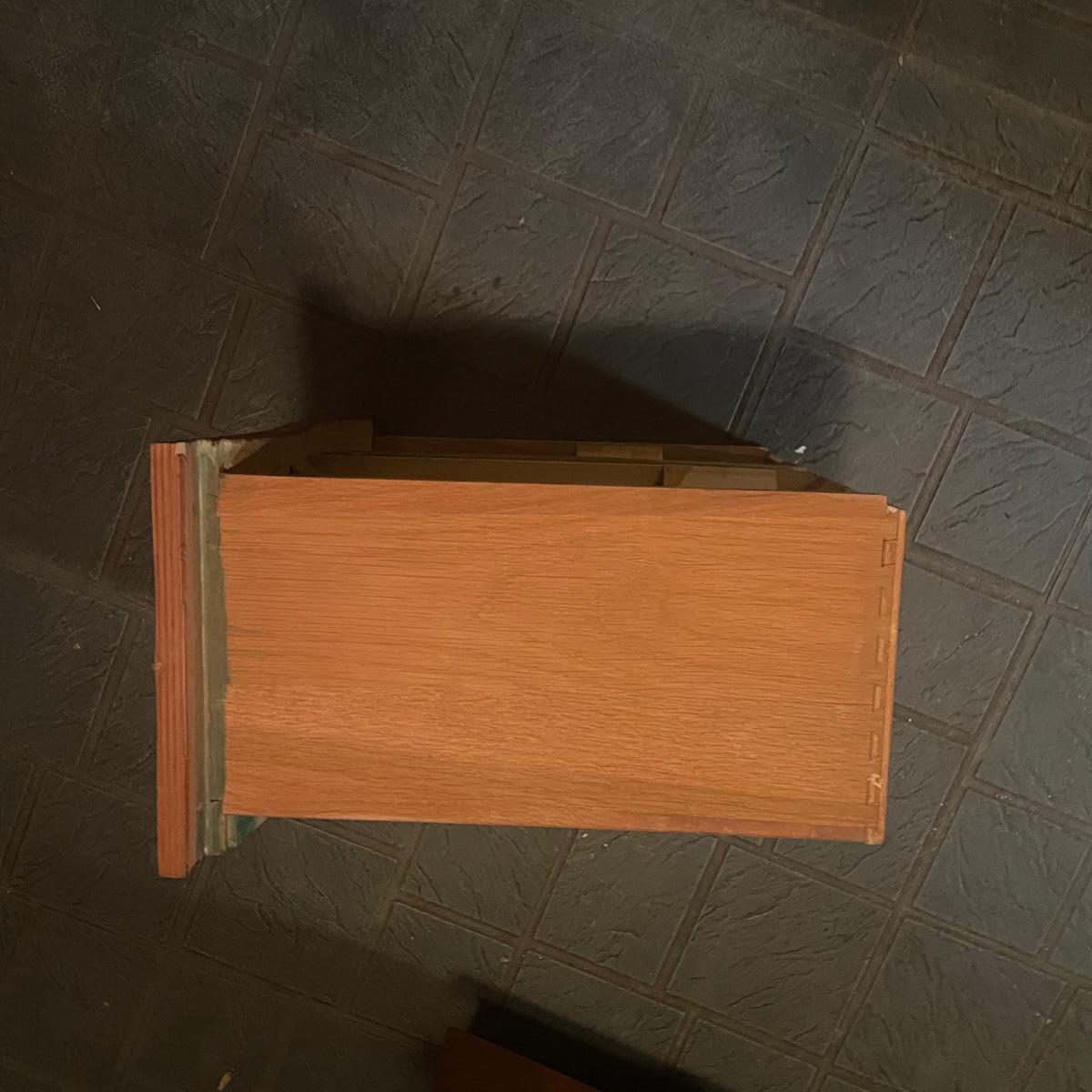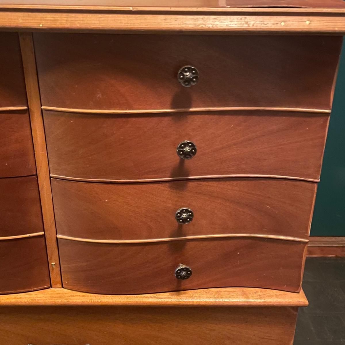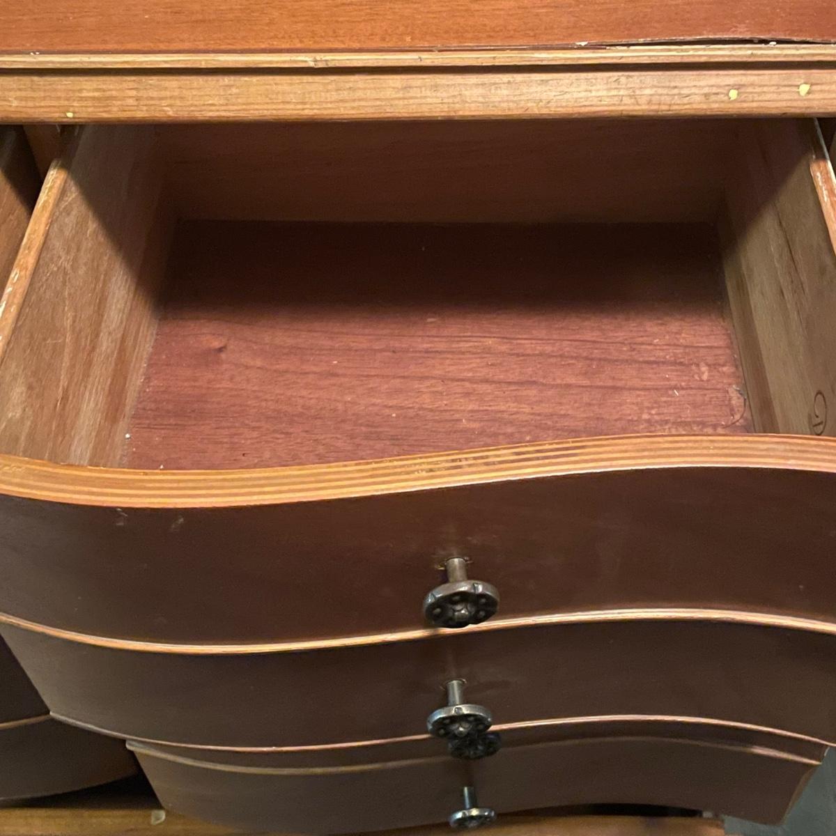 This solid wood dresser has six spacious dovetailed drawers with brass colored hardware. It has a slight lift in the veneer on the top right hand surface and it appears a piece of wood trim was added to the top section (Front and sides) which should be easy to remove if desired. A few scuff marks are shown in images.