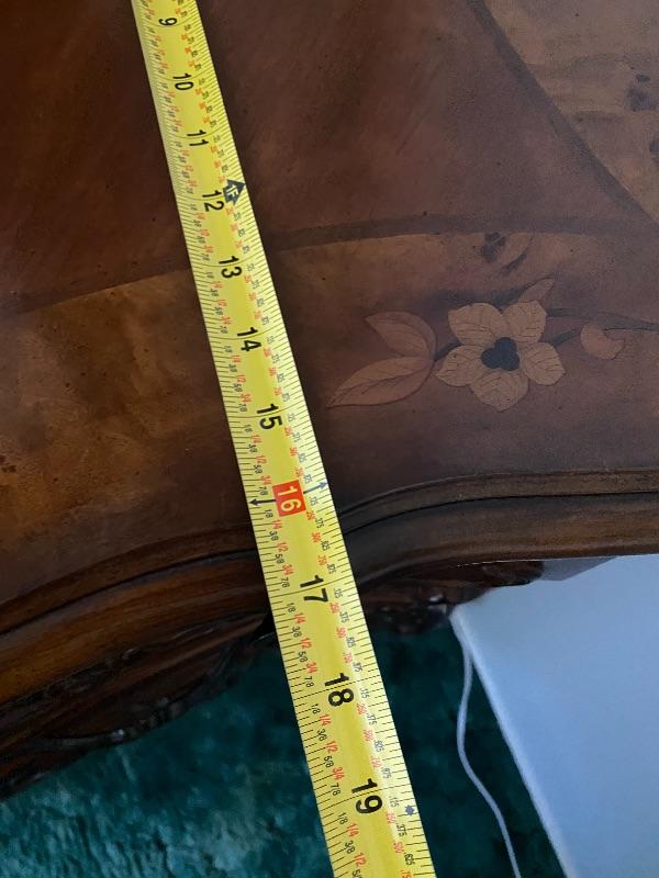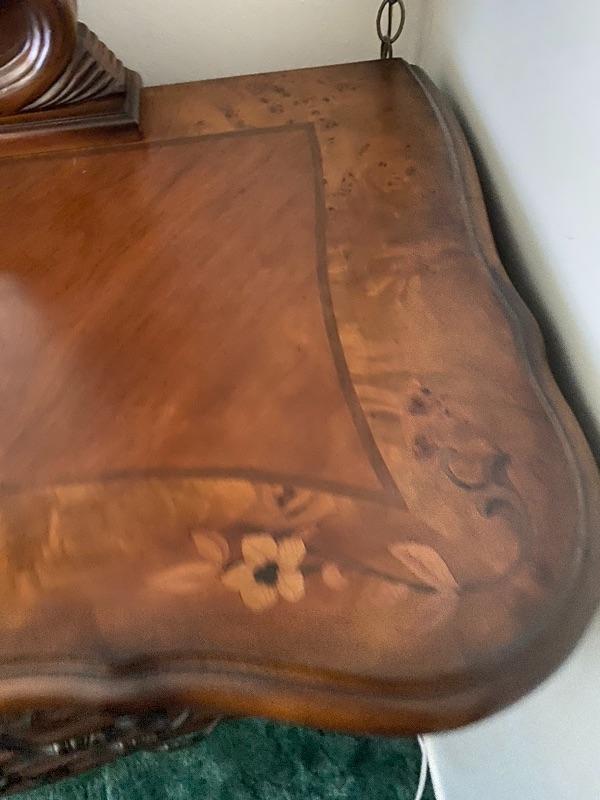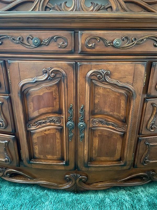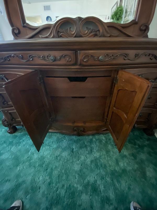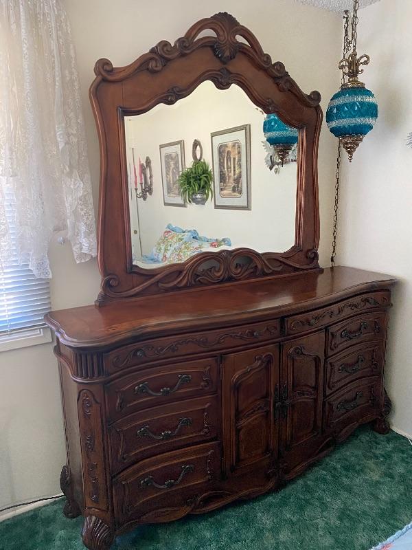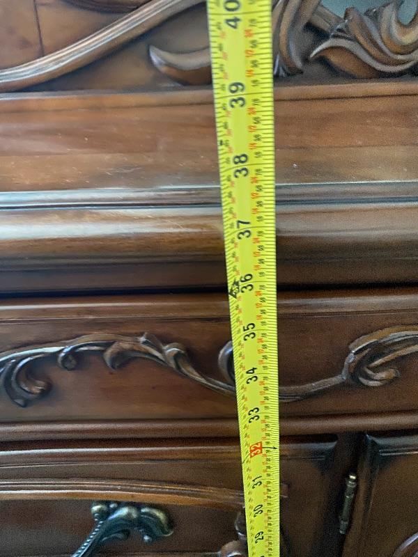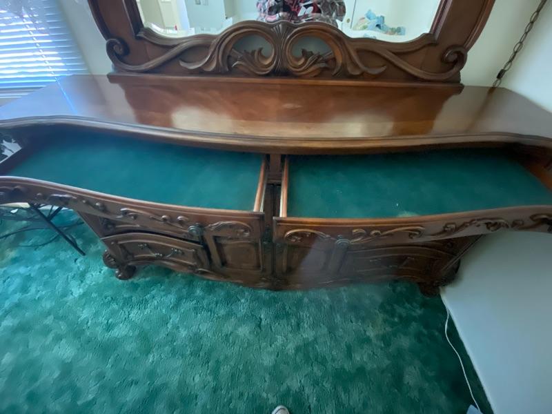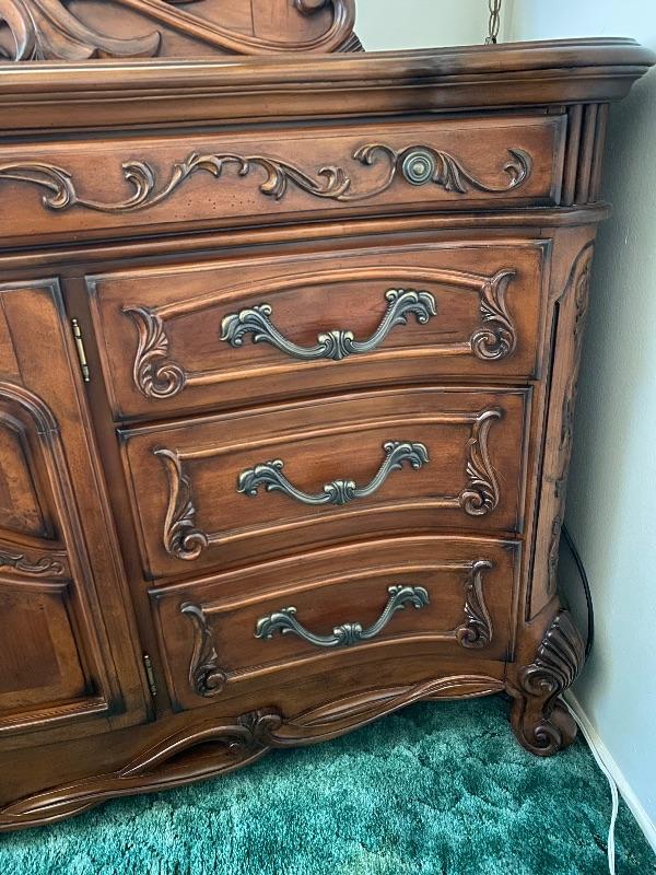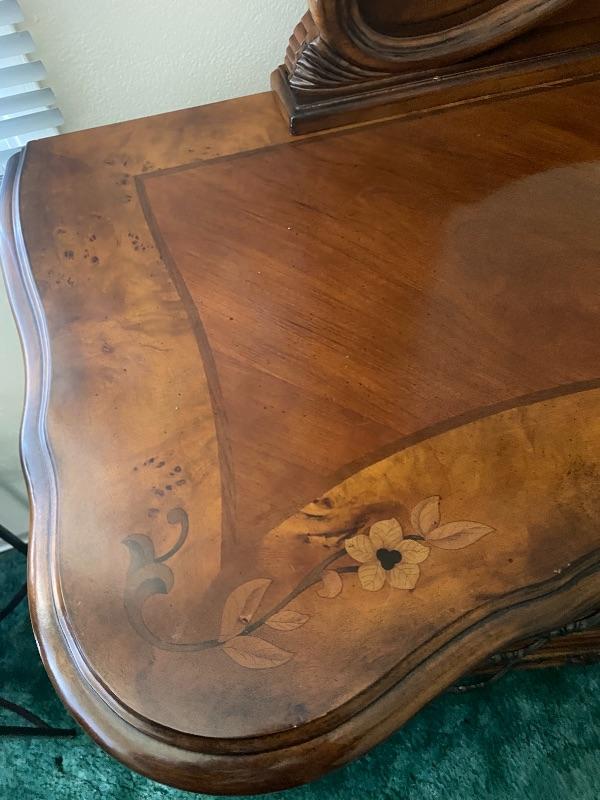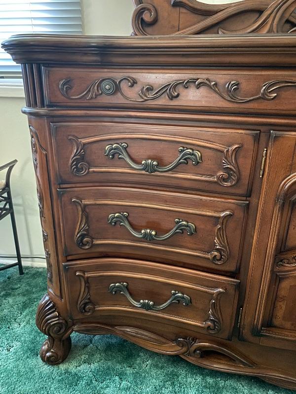 Beautiful wood dresser by AICO Michael Amini. Felted top drawers, 11 drawers total. Inlaid flower design in the top. About 17" deep and 38" high. Mirror is about 50" from dresser top. (88" total height).