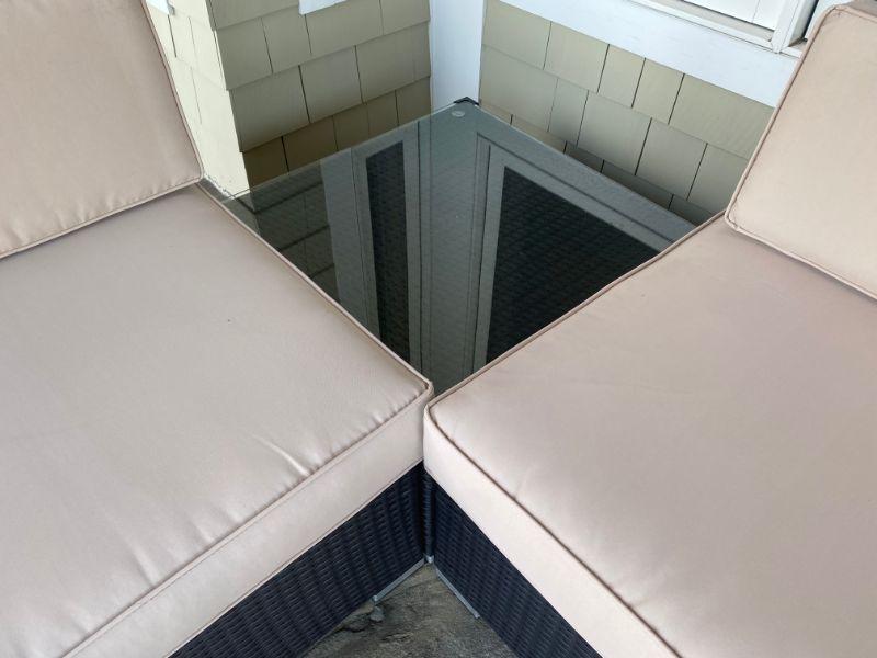cushions easily velcro to bottom to prevent sliding. each section is separate so you can arrange them to fit any area. the table has tempered glass and measures 26" x26" Three sections together measure 85" long x 31"deep x 17" seat height.