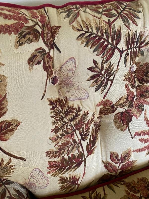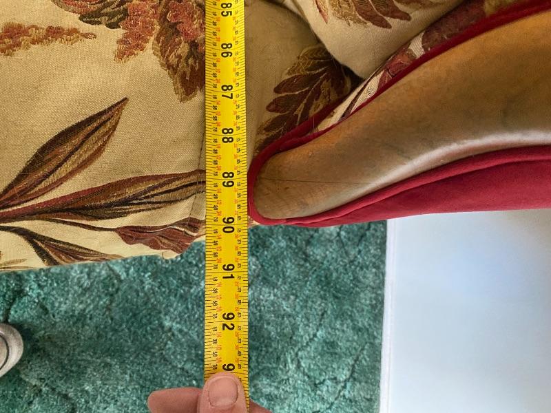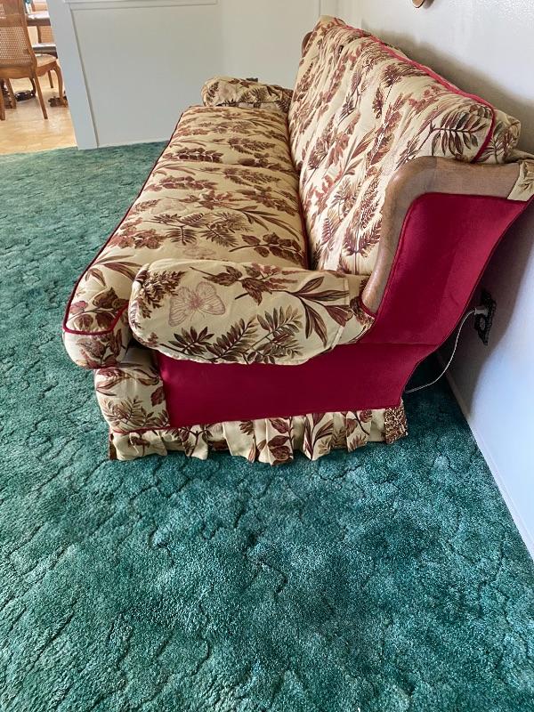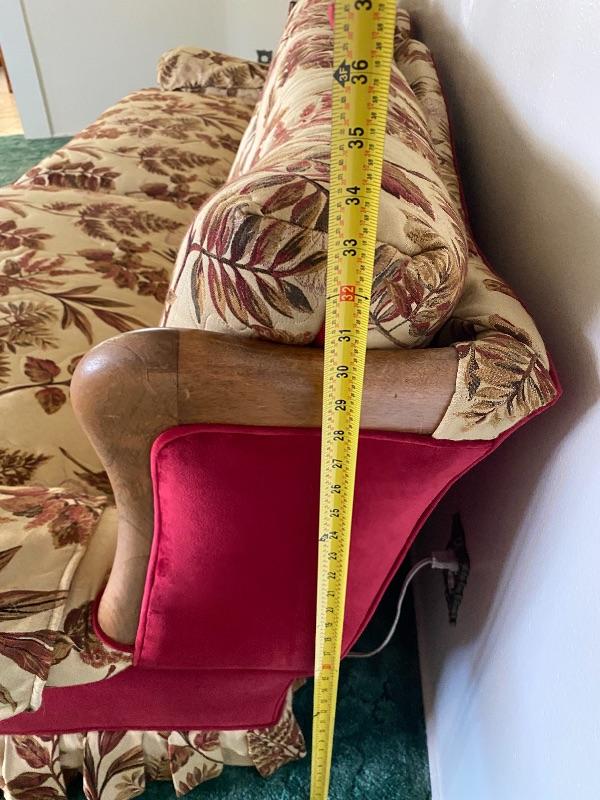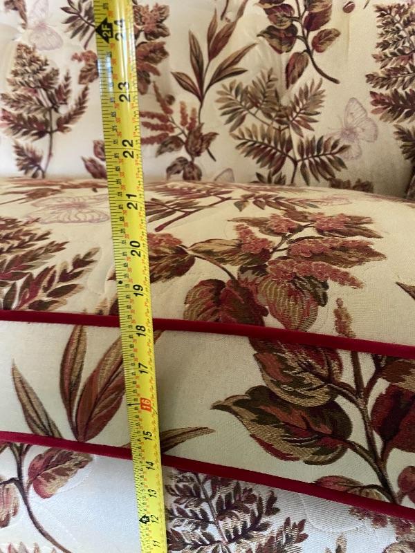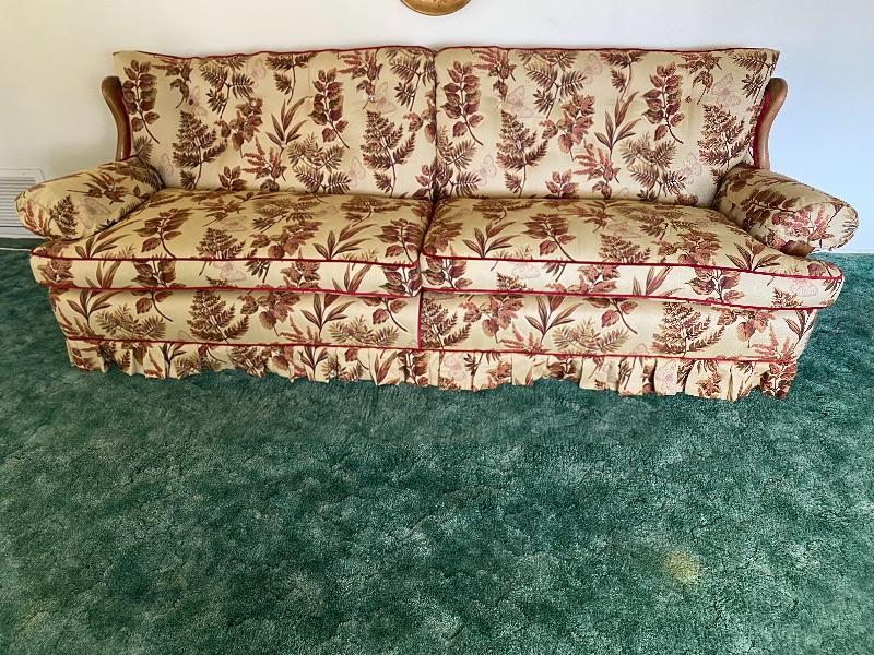 Large vintage 90" couch. Couch has been reupholstered not in the original fabric. Currently done in a beige and red pattern of leaves and butterflies. Sides and back and all edging is done in a deep red color. Two cushion seat. Solid and comfortable does not sag. Has wood trim on the sides.