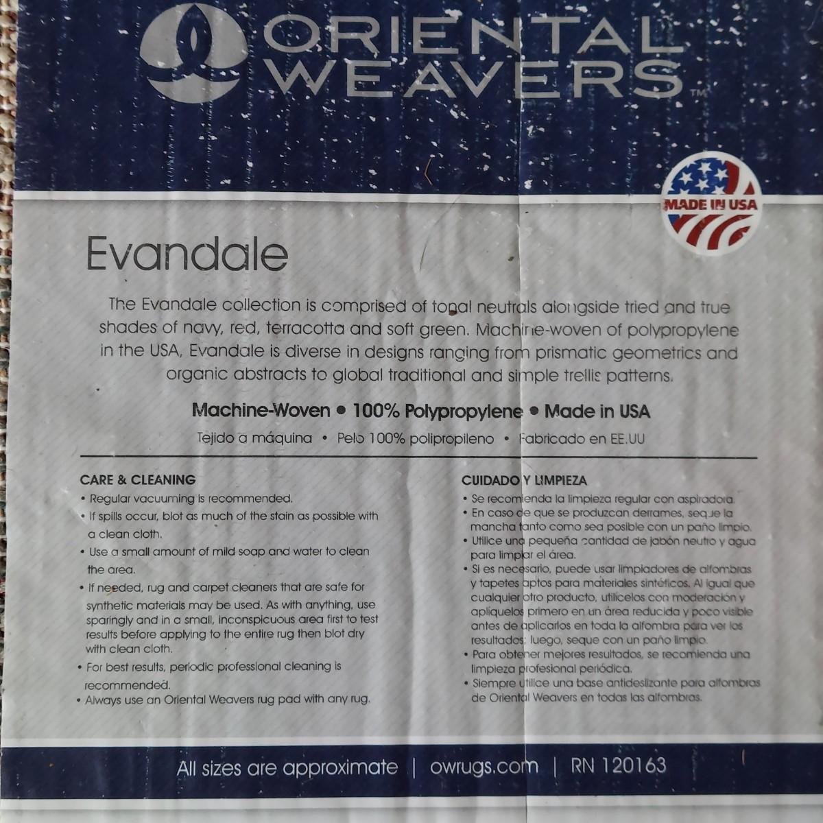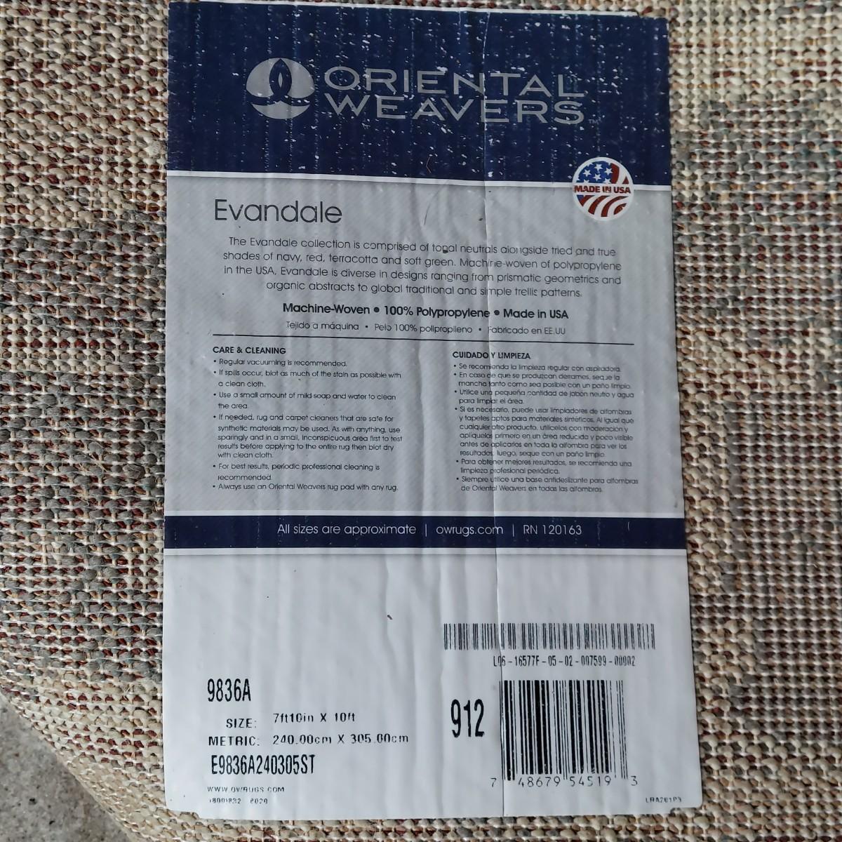 Evandale rug by Oriental Weavers. Measures 10' x 7'10". Rug pad is included. Comes from a pet-owned home.
