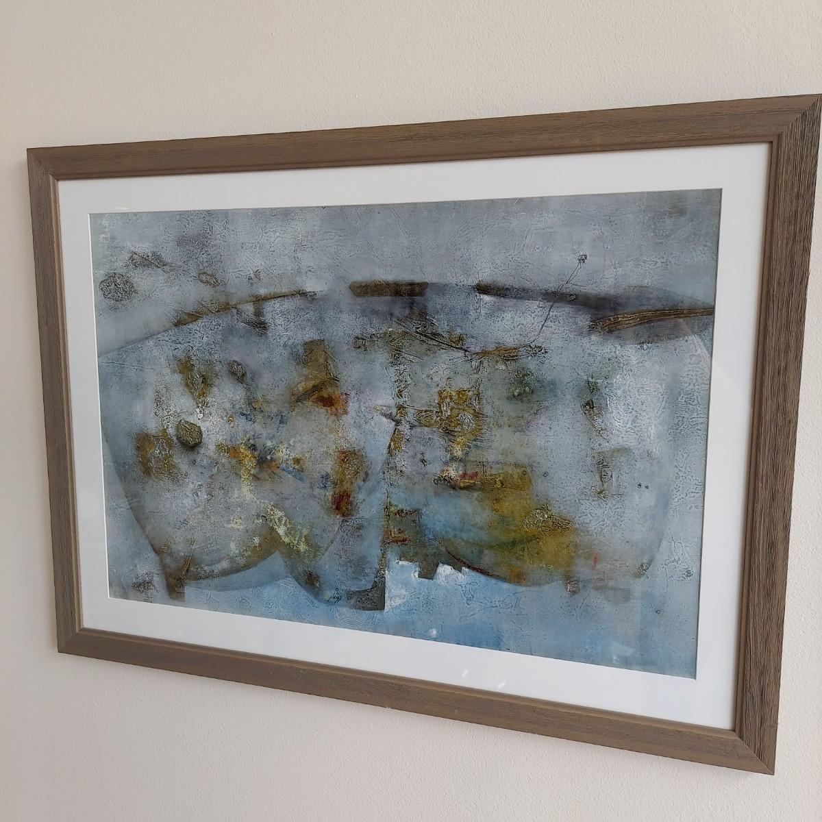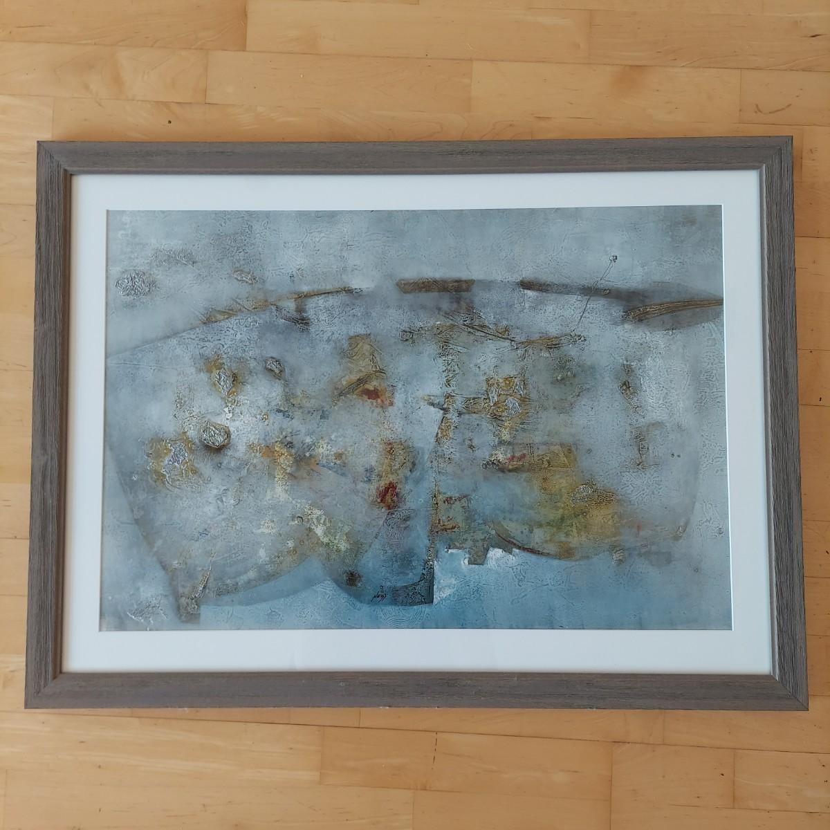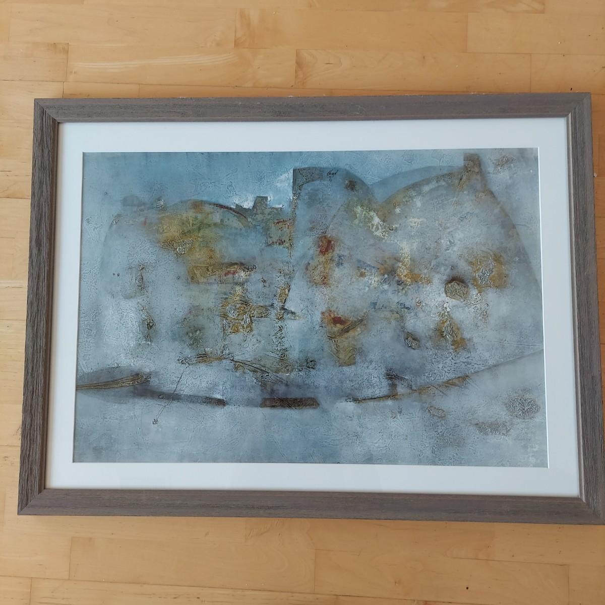 Large artwork matted in a wood frame under UV protective glass. The frame measures approximately 34” x 25.5"H. The piece appears to be an original painting that can be hung two different ways. A signature is present but indistinguishable. Please see photos for details. Shipping available. Shipping certain items can be costly. We suggest contacting our preferred local shipping provider, Postage Express, with dimensions and getting an estimate before bidding: (828) 255-9250 or shipping@postageexpressnc.com