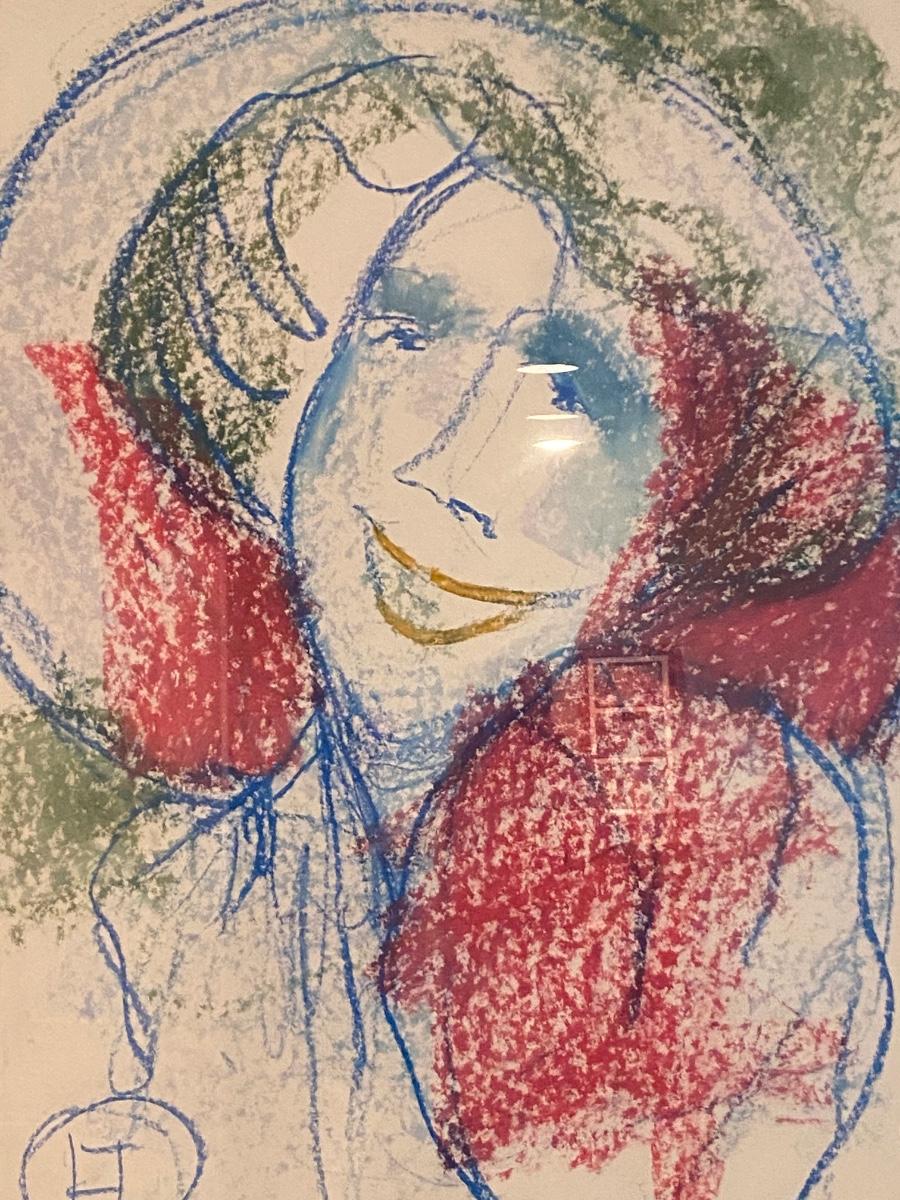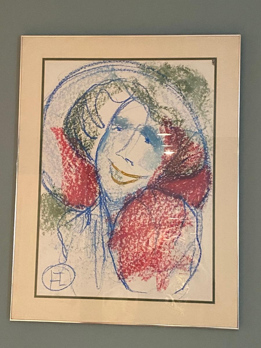 Large abstract style portrait wall art. Looks to be done with crayon or oil pastels possibly. Artist signed in the bottom left corner. There is a crack/ damage in lower corner of glass pane. Around 24" size.
