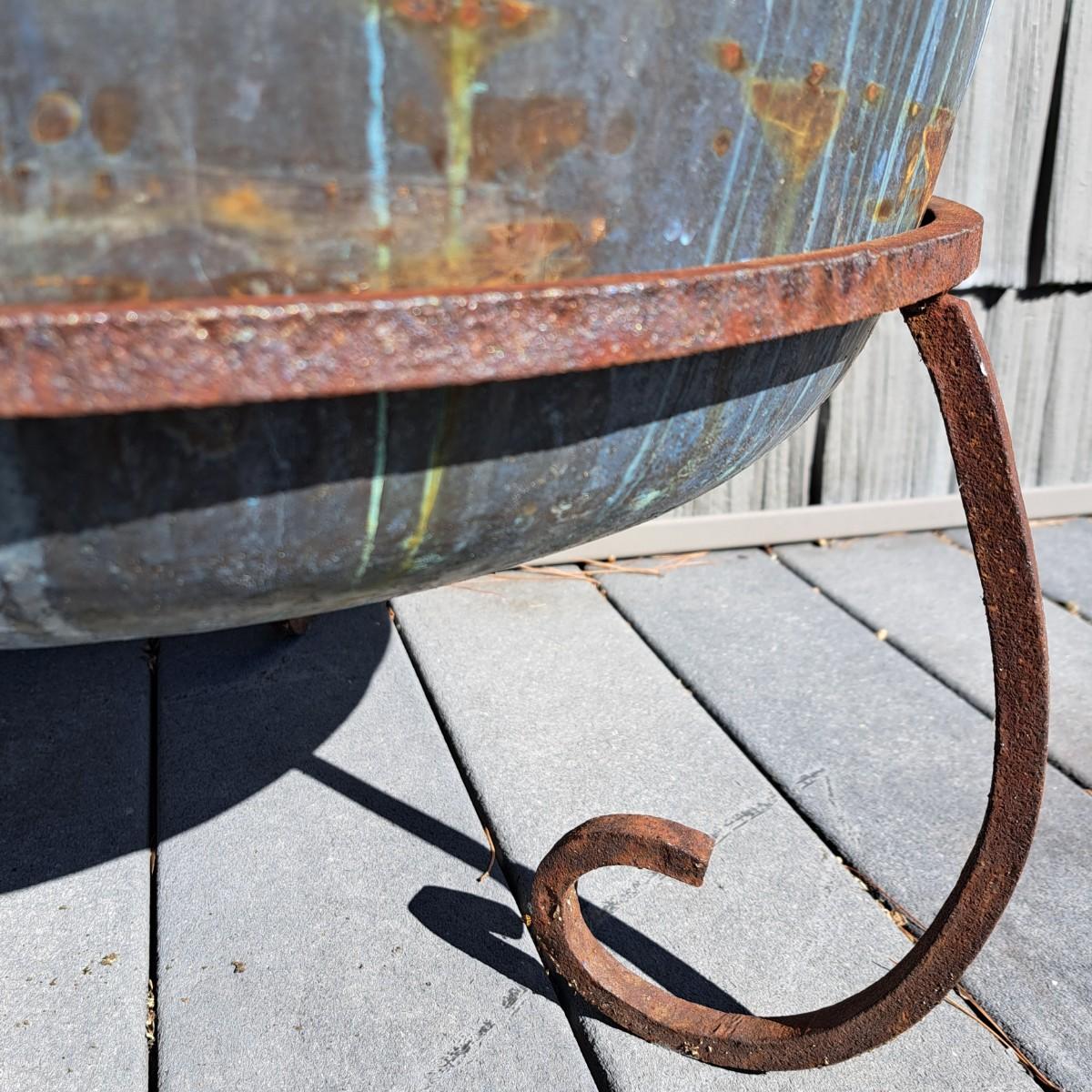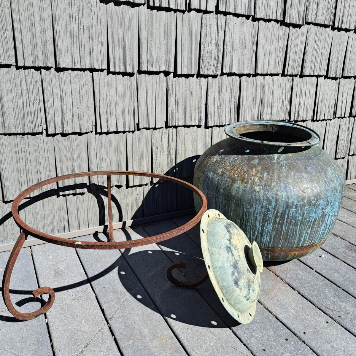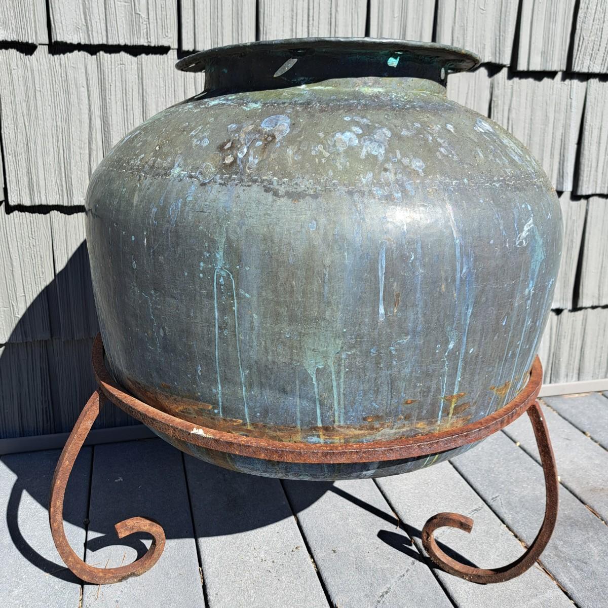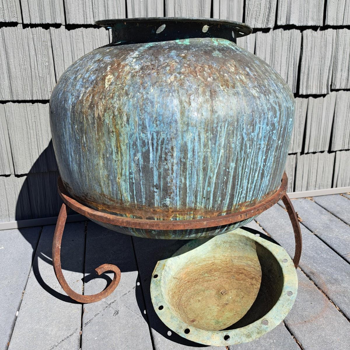 Aged copper planter with a bulbous shape and iron stand. Both planter and stand have a mixture of rust and a beautiful running verdigris patina, 19"D × 18H; with stand reaches 30"H. Top rim of planter is slightly bent. Has a matching plate-shaped top that can be used as a cover. Local pickup only.