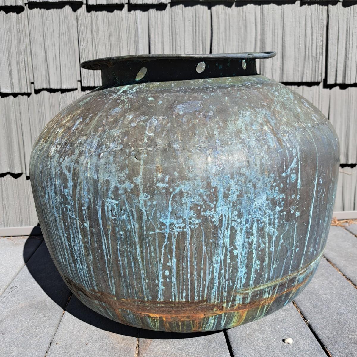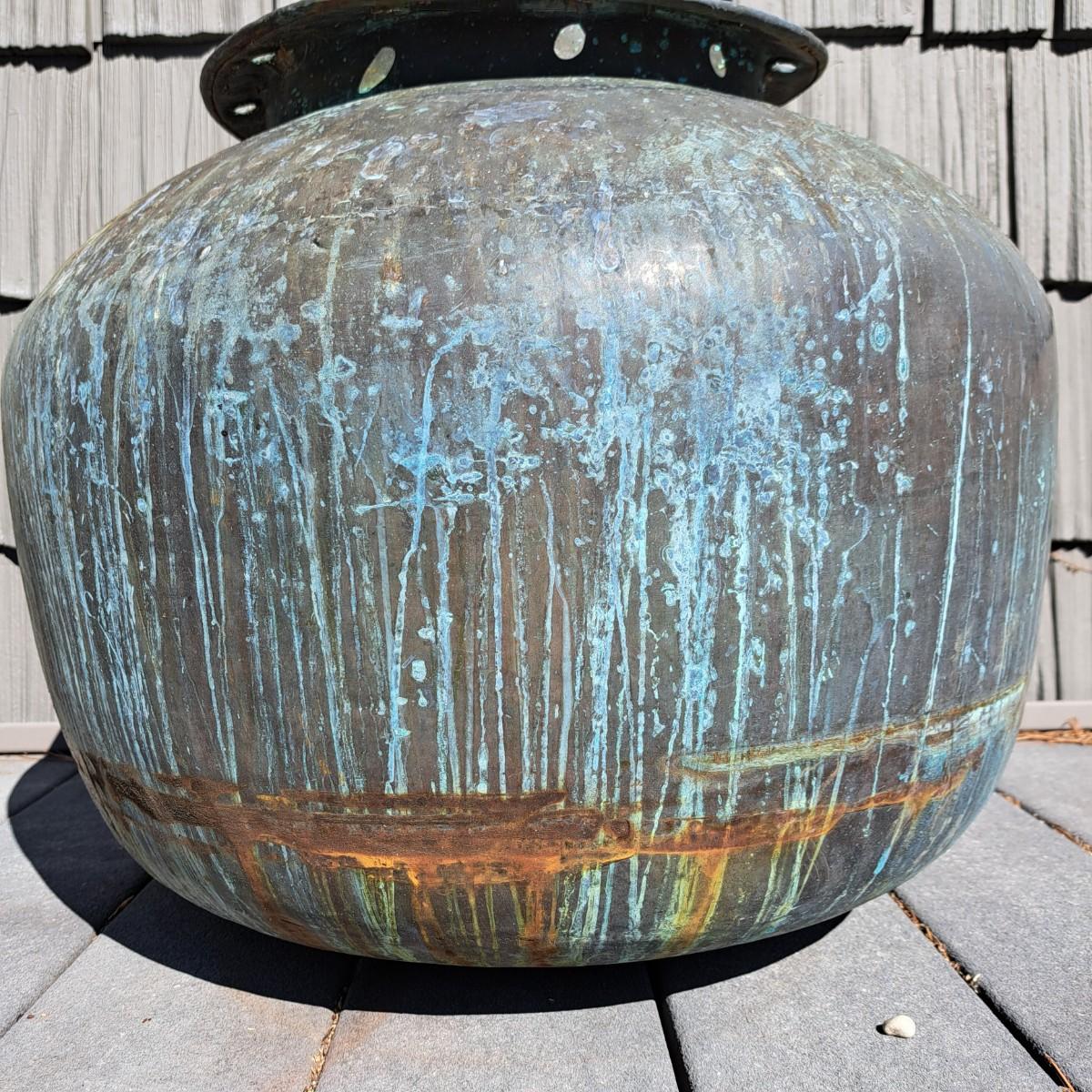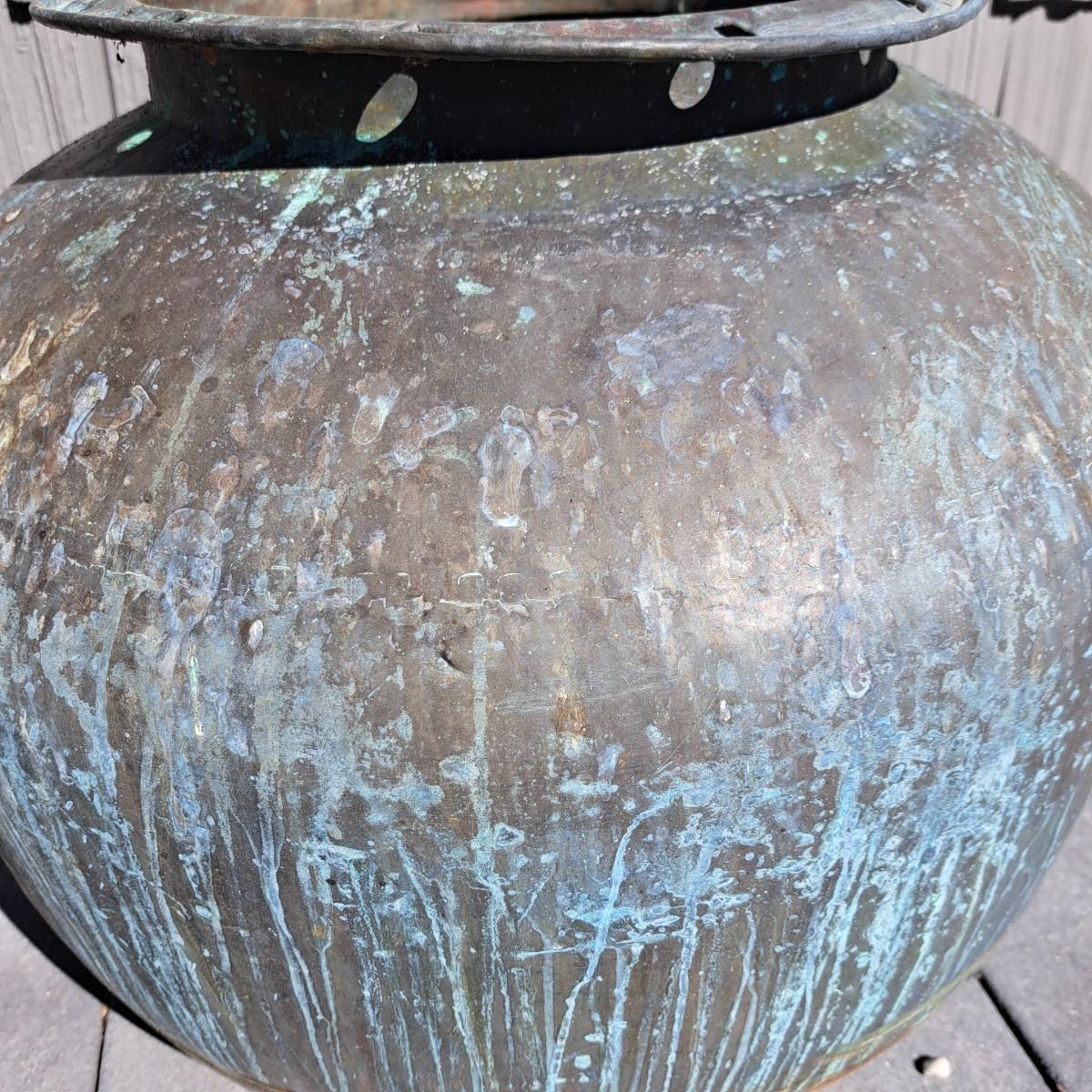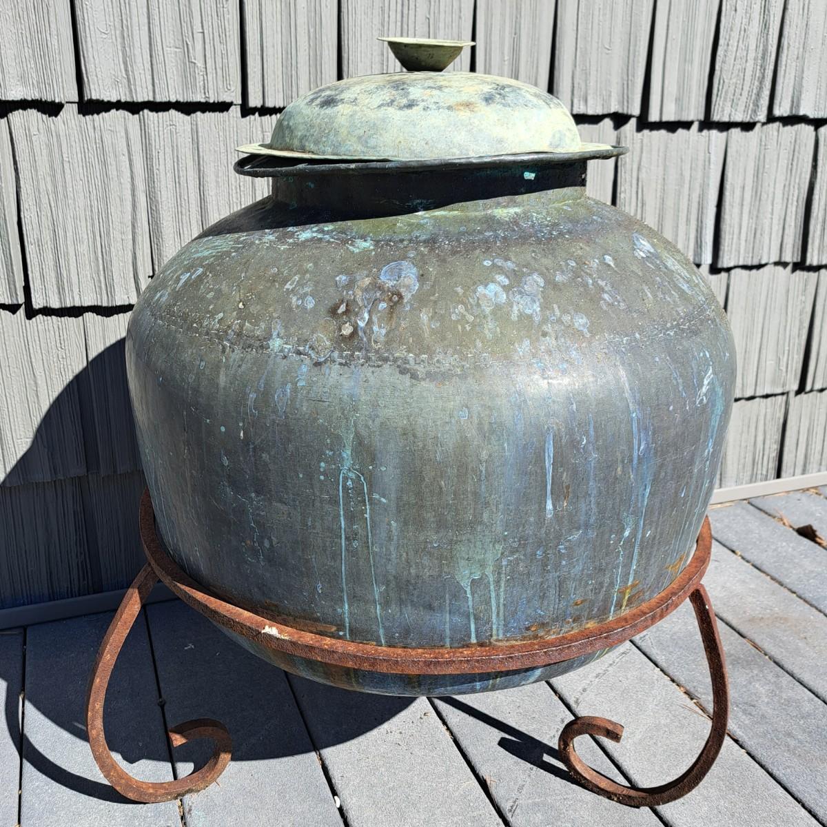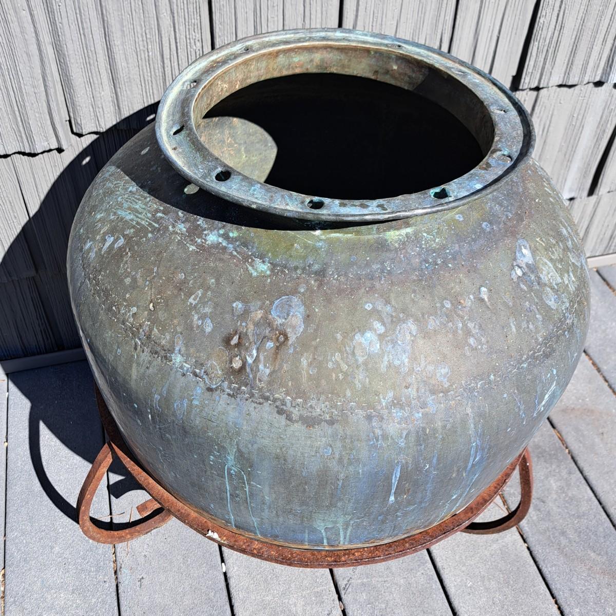 Aged copper planter with a bulbous shape and iron stand. Both planter and stand have a mixture of rust and a beautiful running verdigris patina, 19"D × 18H; with stand reaches 30"H. Top rim of planter is slightly bent. Has a matching plate-shaped top that can be used as a cover. Local pickup only.