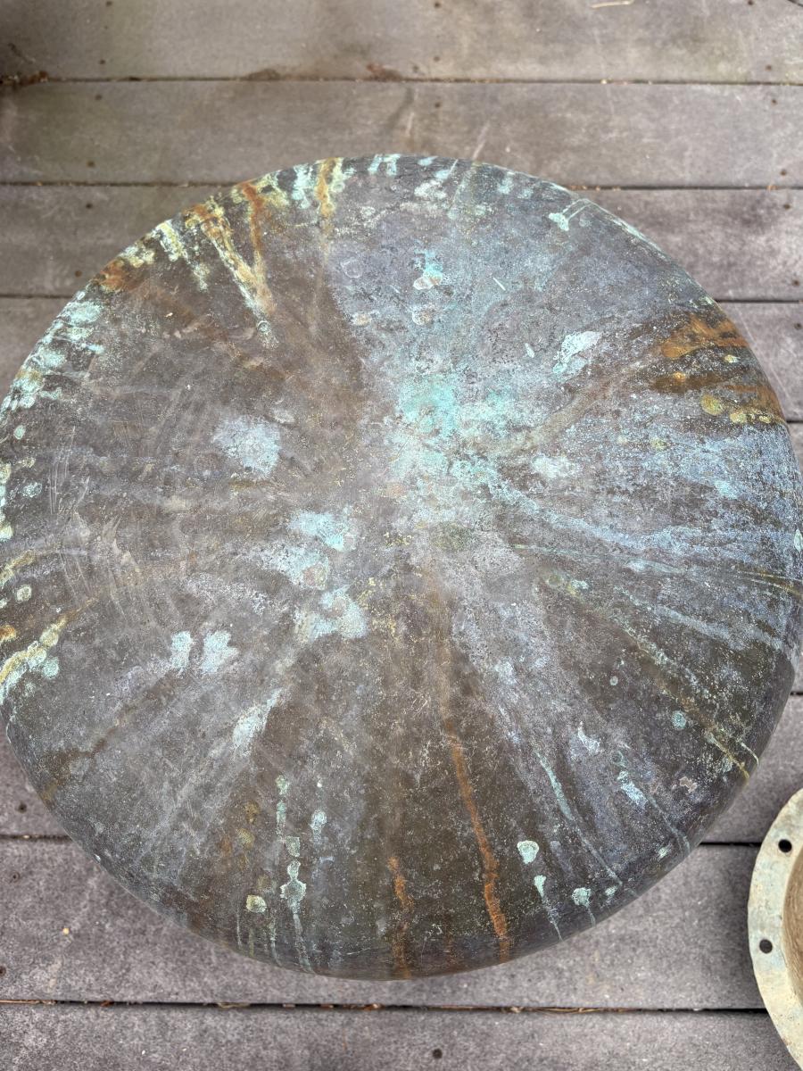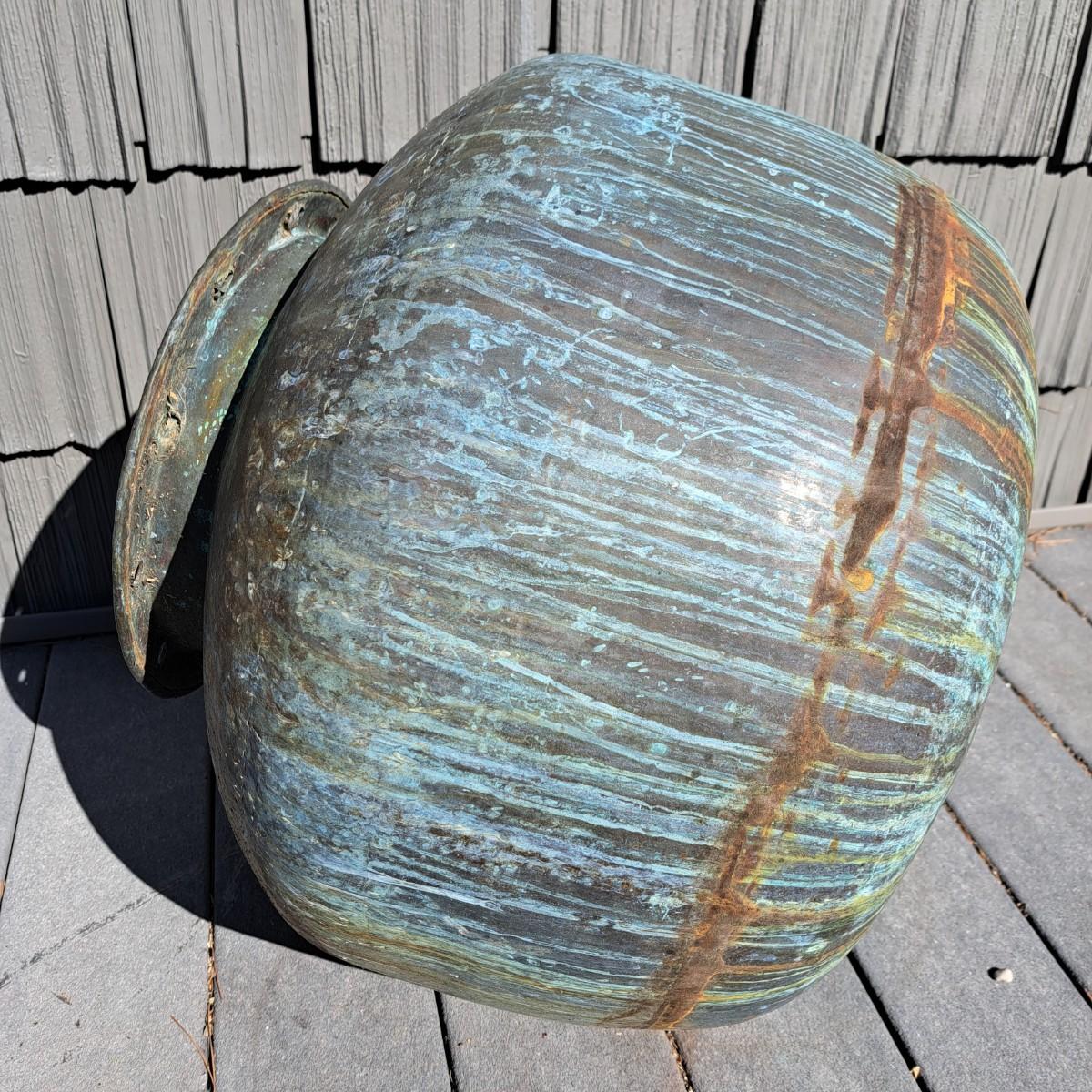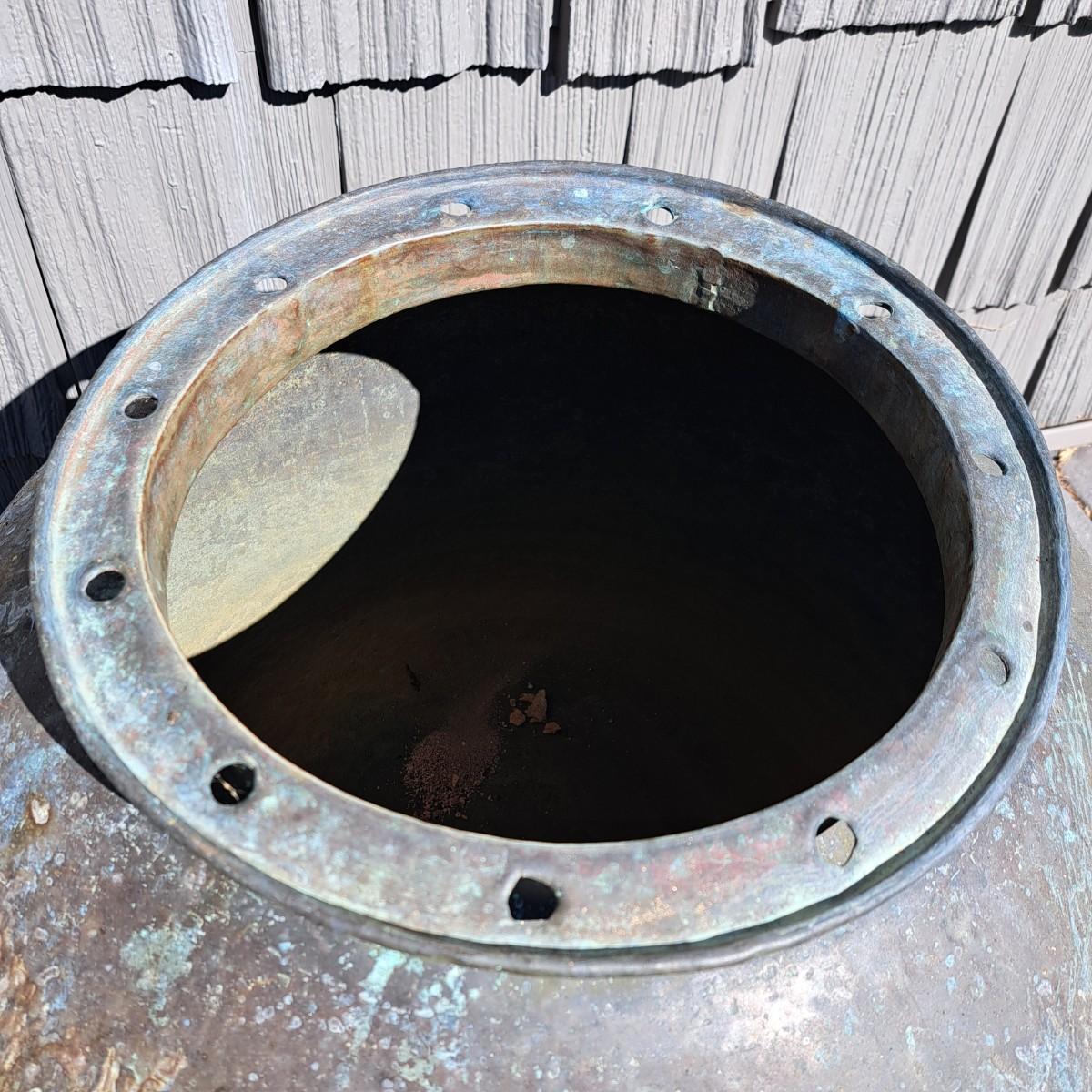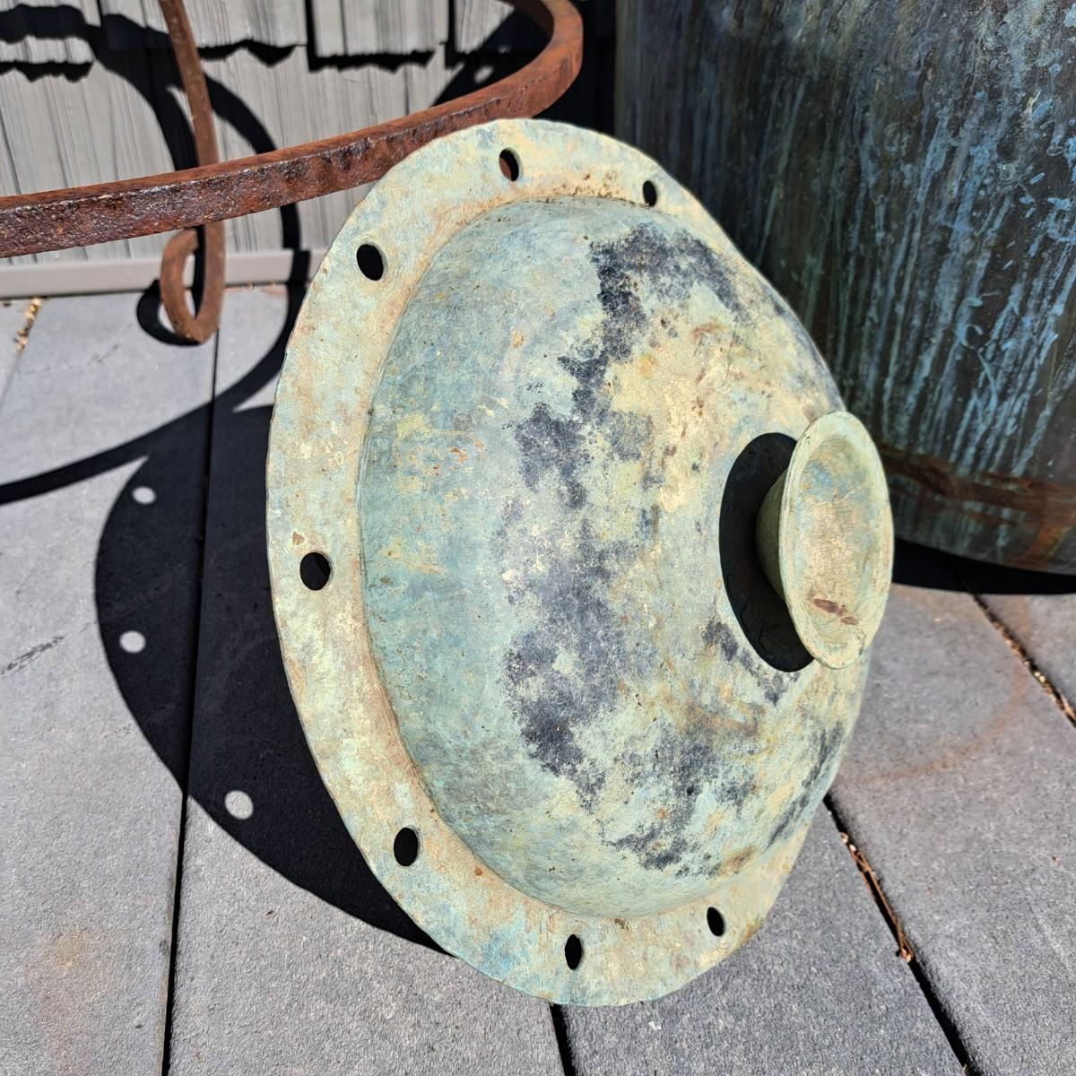 Aged copper planter with a bulbous shape and iron stand. Both planter and stand have a mixture of rust and a beautiful running verdigris patina, 19"D × 18H; with stand reaches 30"H. Top rim of planter is slightly bent. Has a matching plate-shaped top that can be used as a cover. Local pickup only.