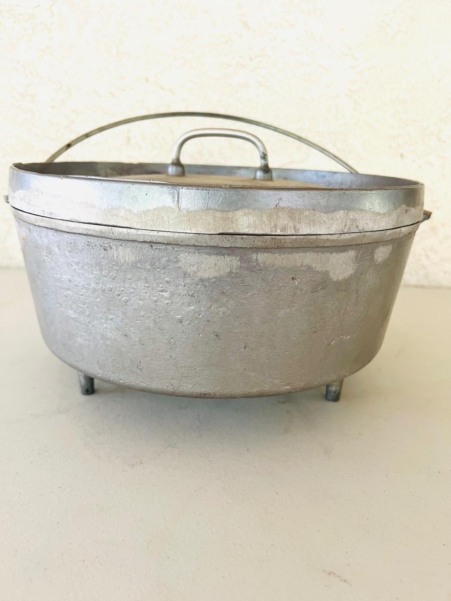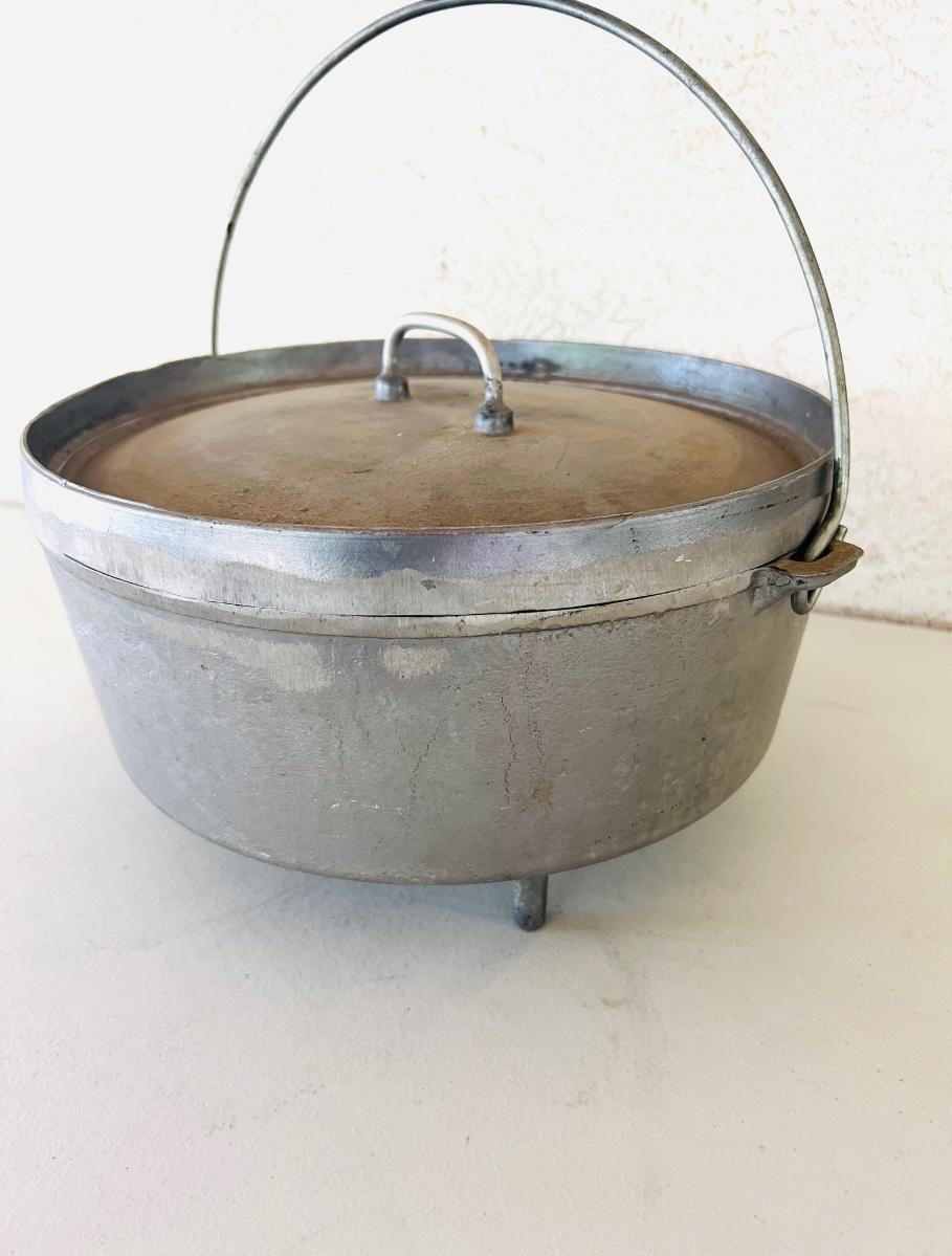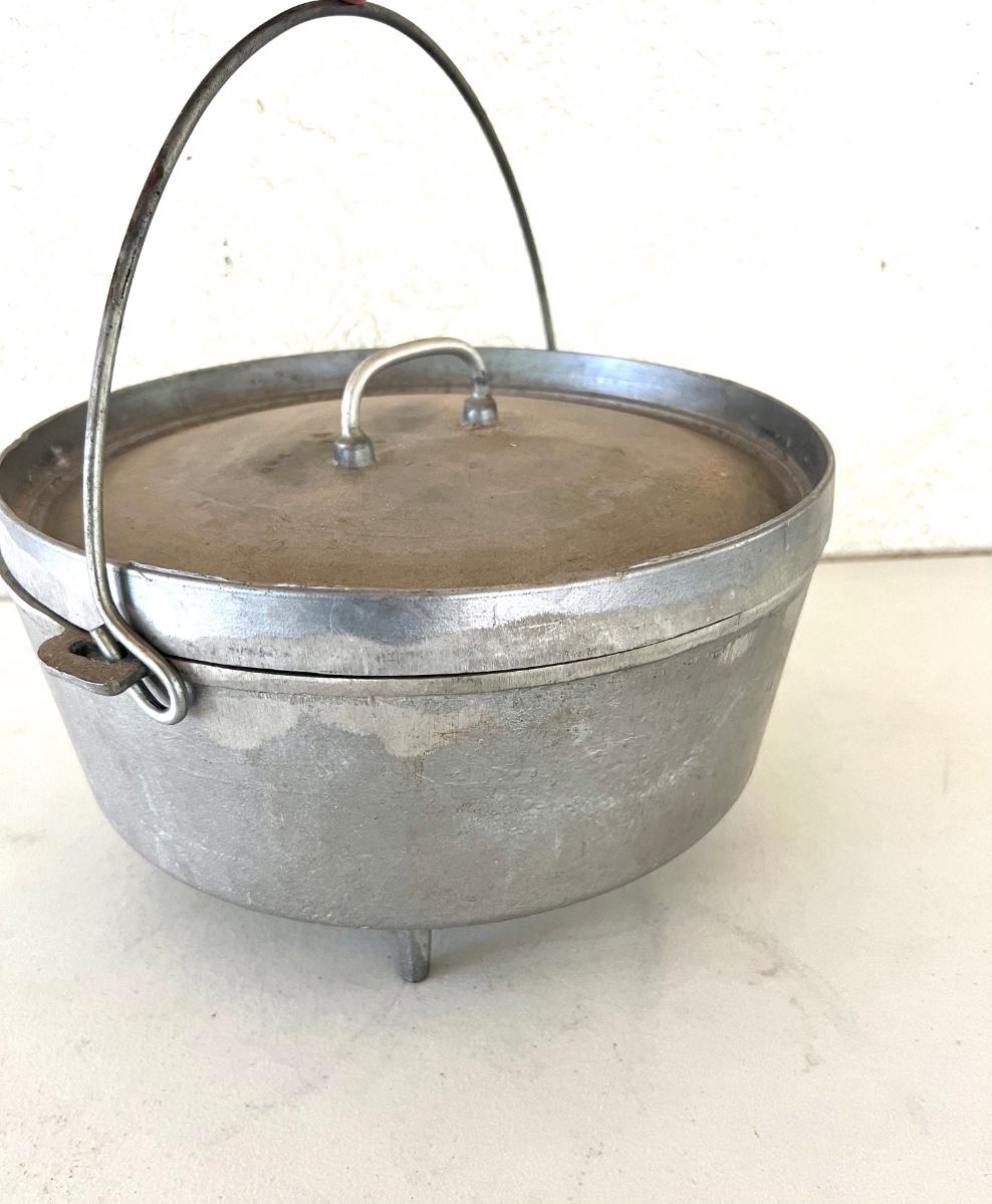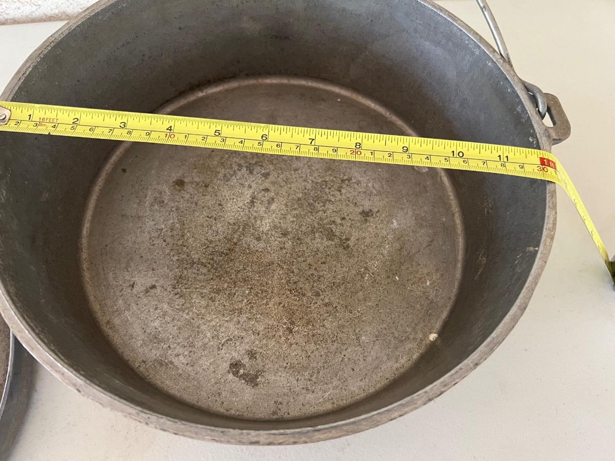 Heavy Aluminum Dutch Footed Oven With handle. See pictures for measurements on the Dutch oven.