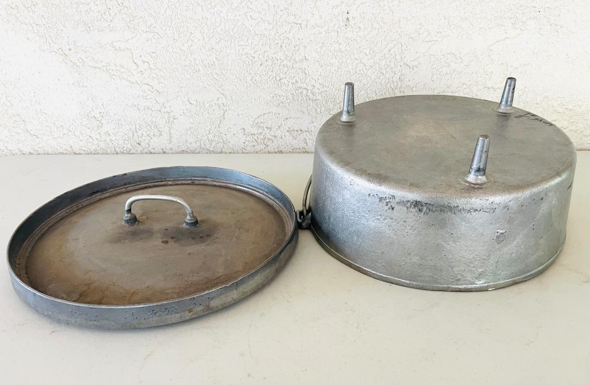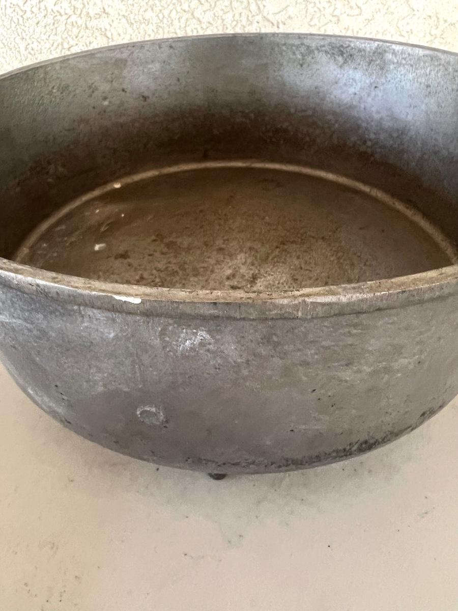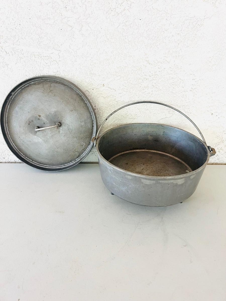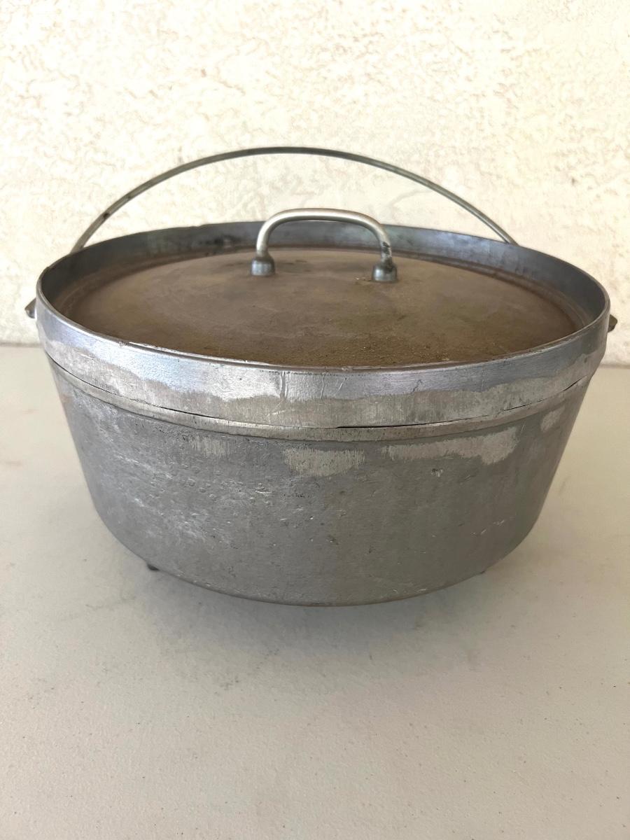 Heavy Aluminum Dutch Footed Oven With handle. See pictures for measurements on the Dutch oven.