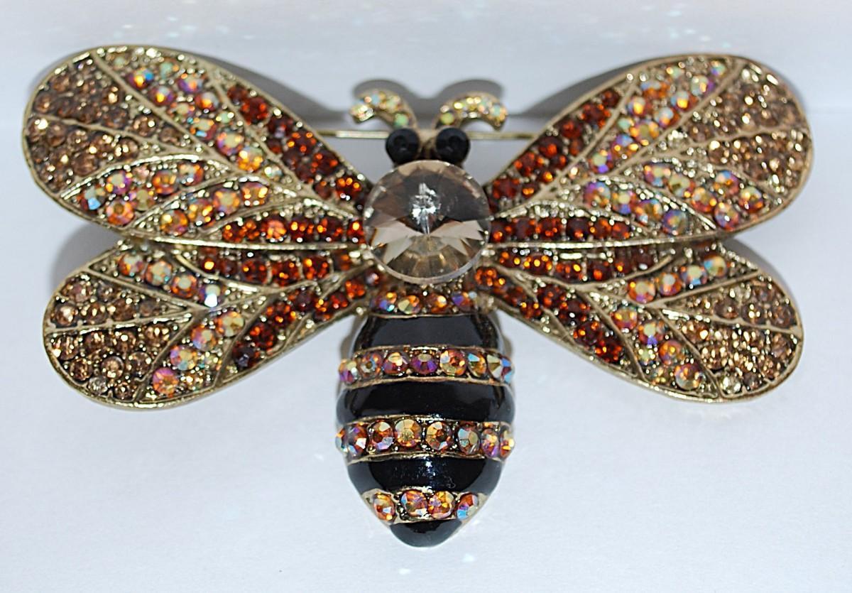 Large Amber & Iridescent Stones BEJEWELED BEE BROOCH (3" x 2") with Enamel Black Belly & Eyes & Clear Stone Center