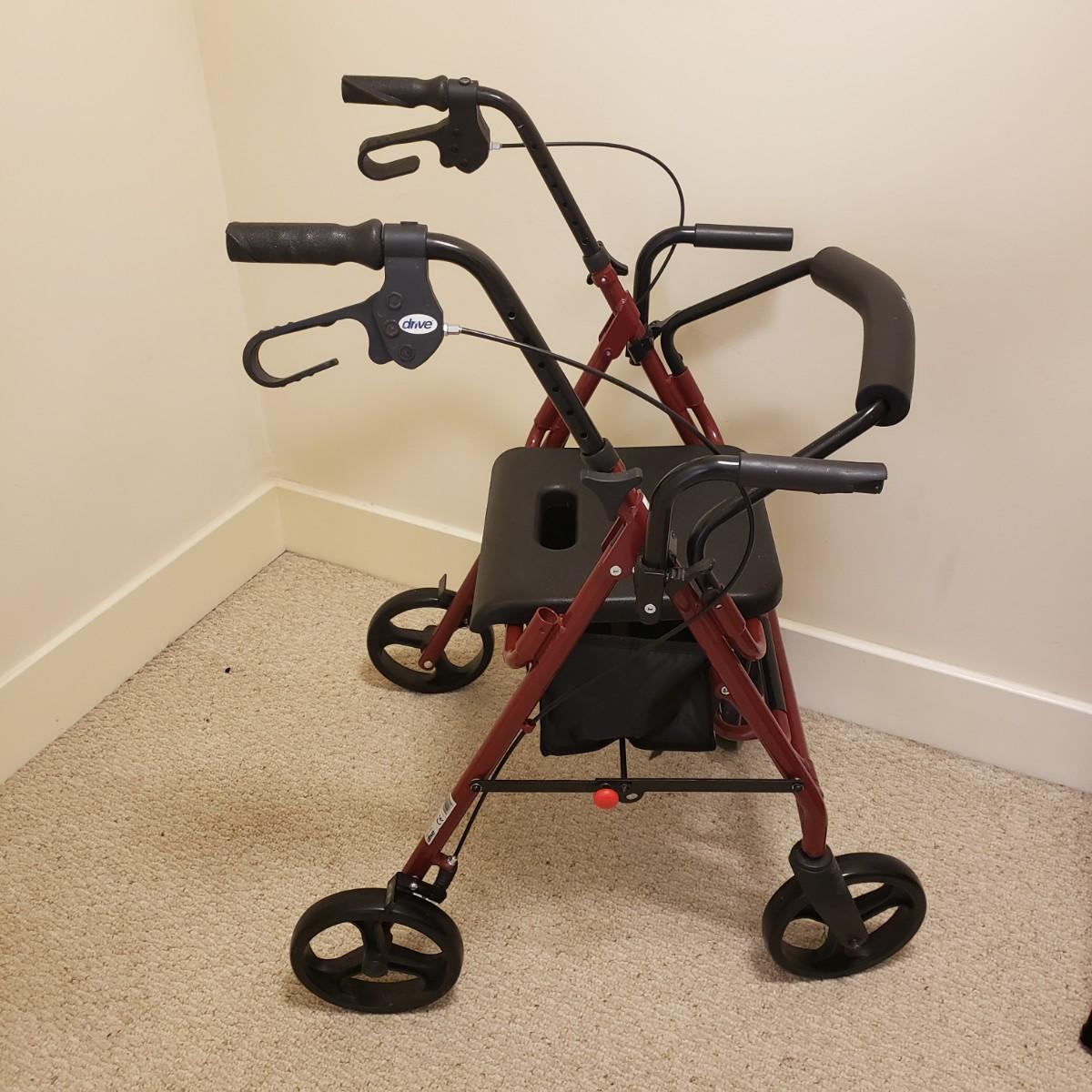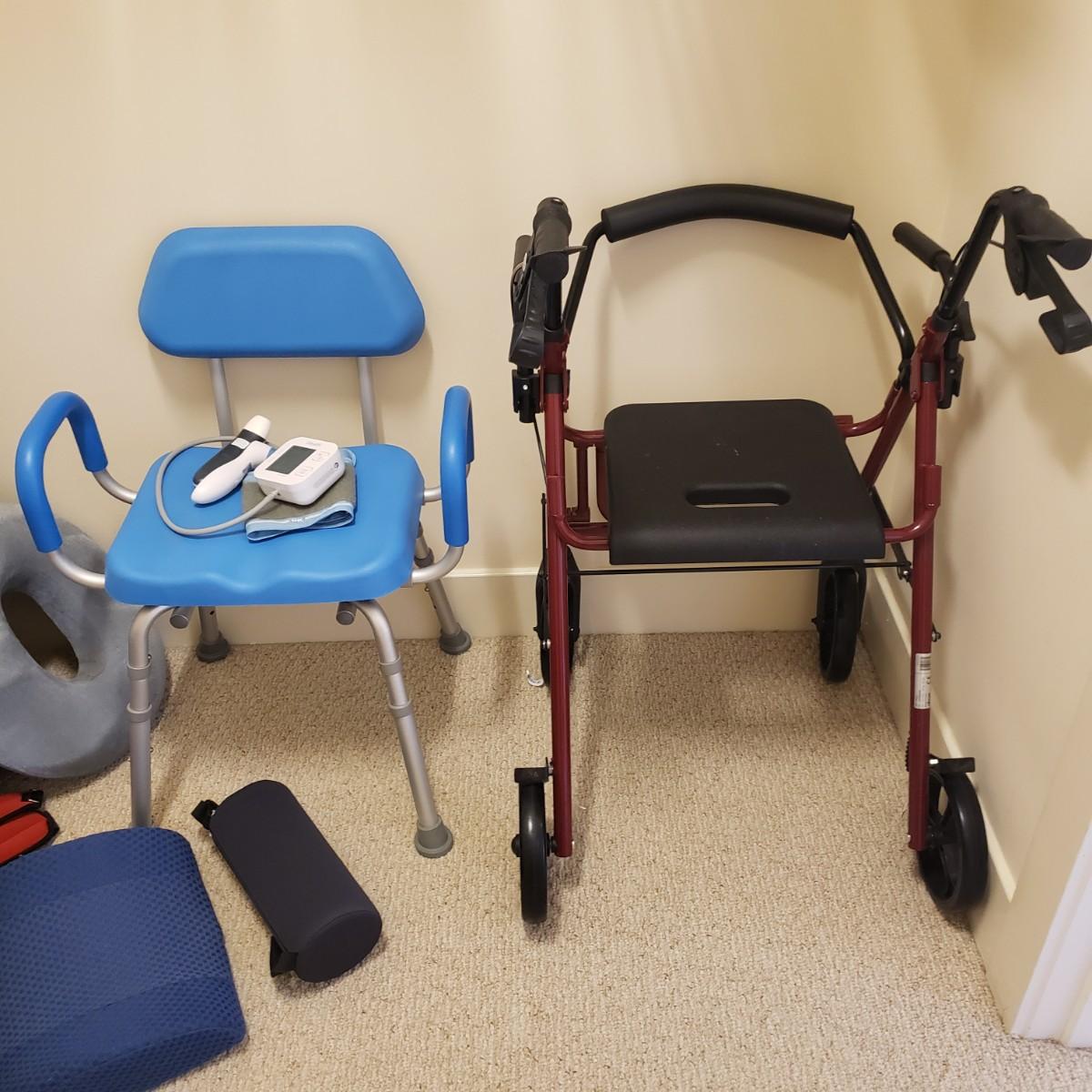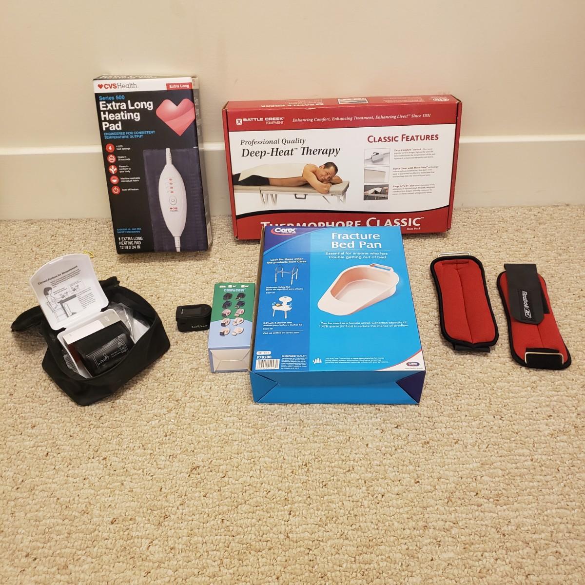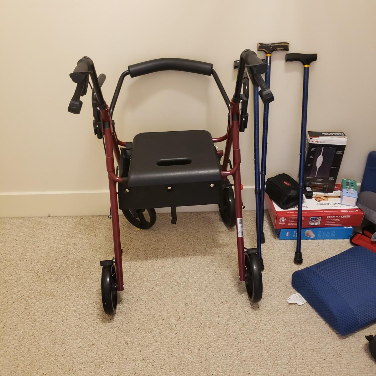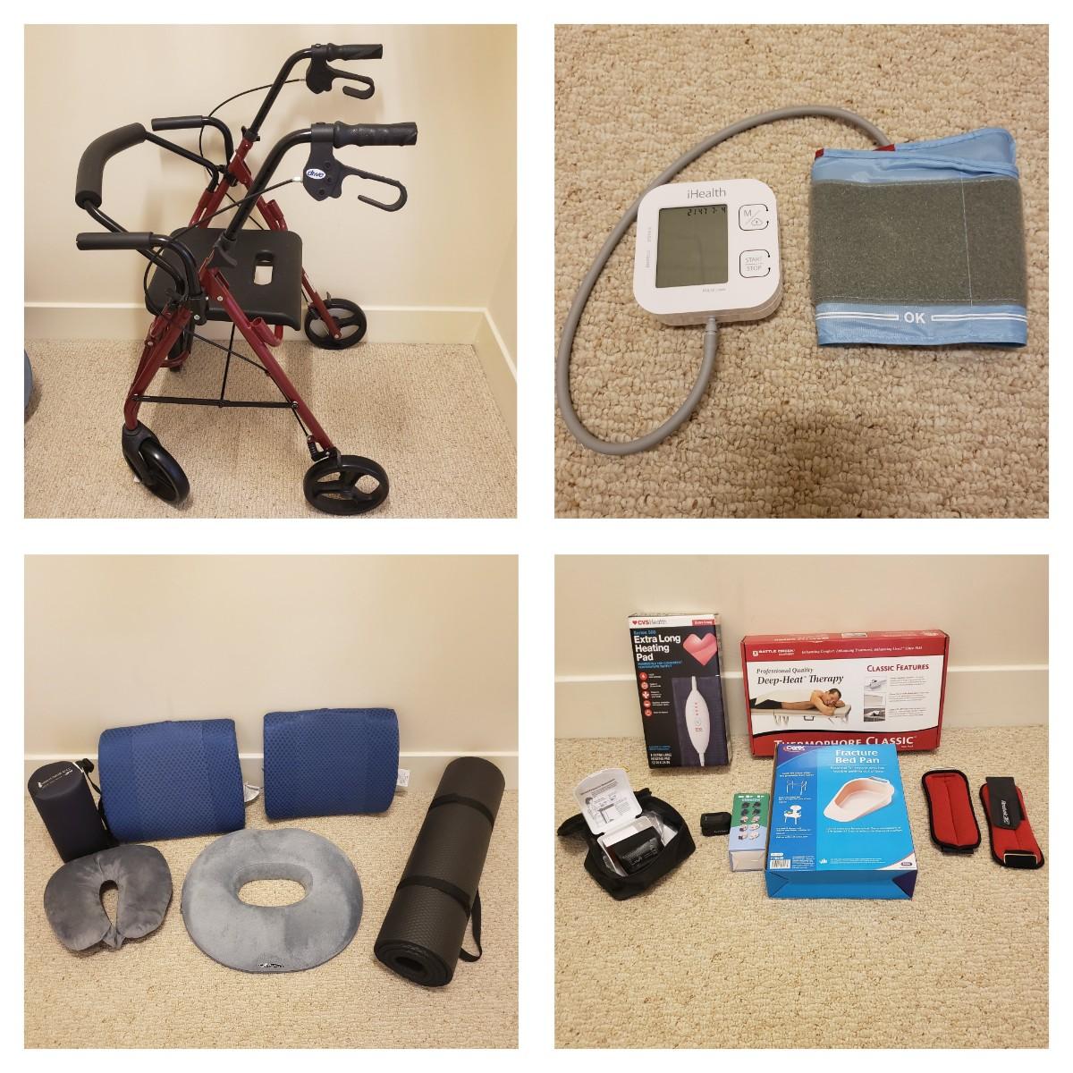 This large ambulatory lot contains two Drive rolling walkers. On has a bag under the seat, the other does not. The three identical canes are adjustable. One handle is more worn than the other two. There are four NIB items: Cow&Cow, CVS extra ling heating pad, Carex bed pan and a Thermophore Classic. See pictures for details.