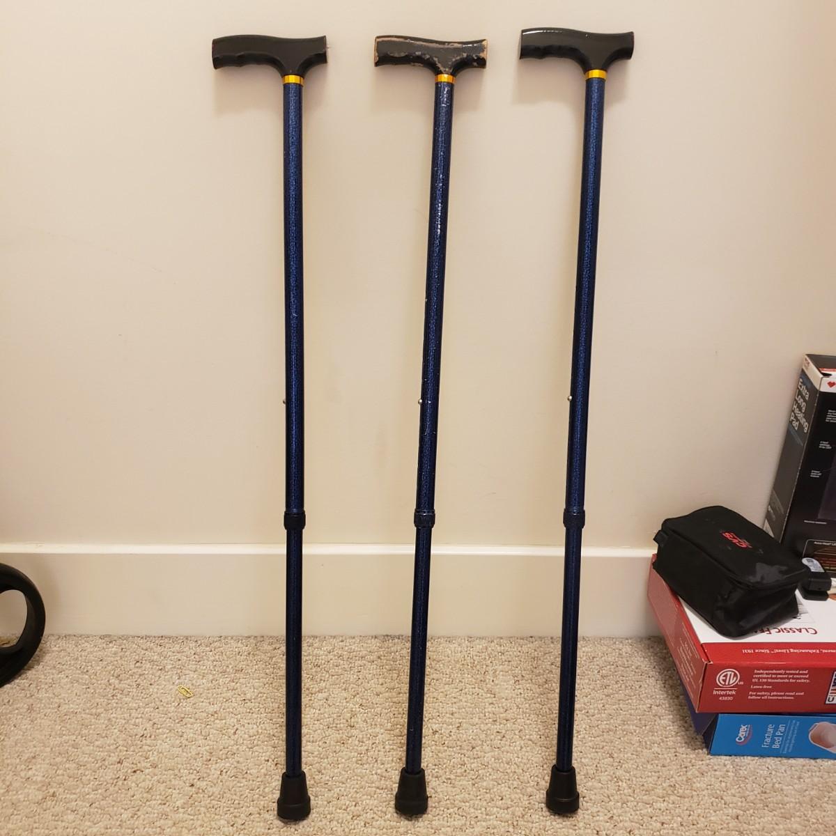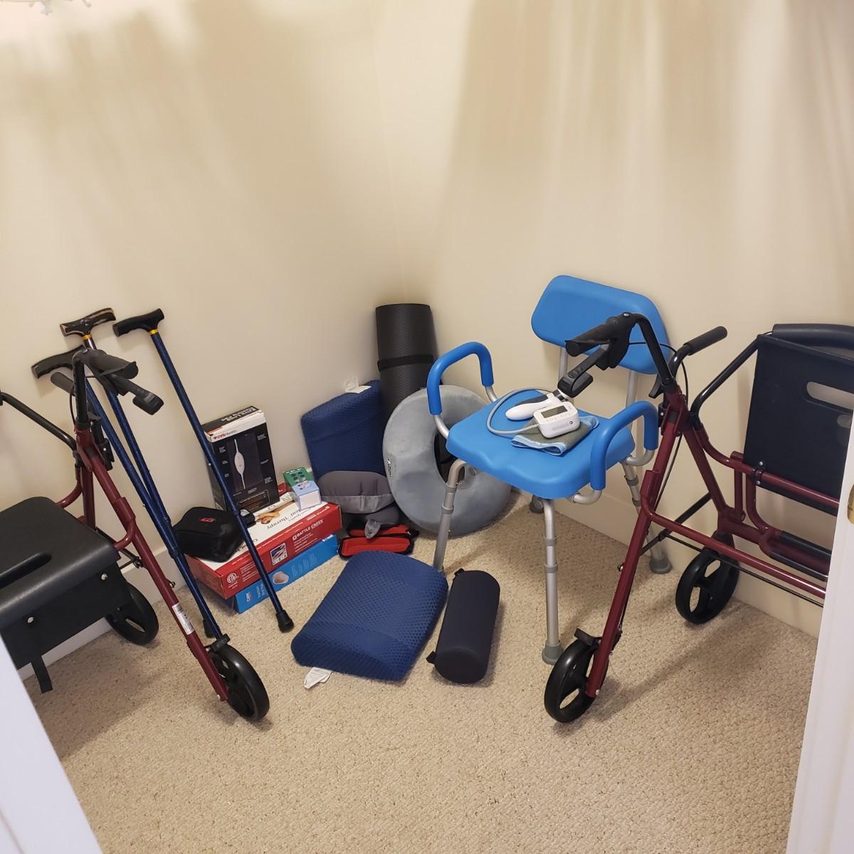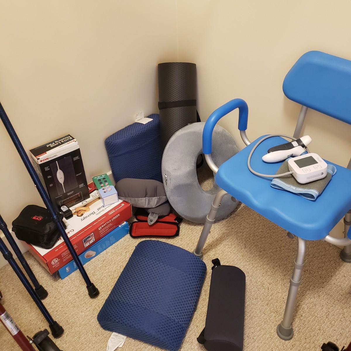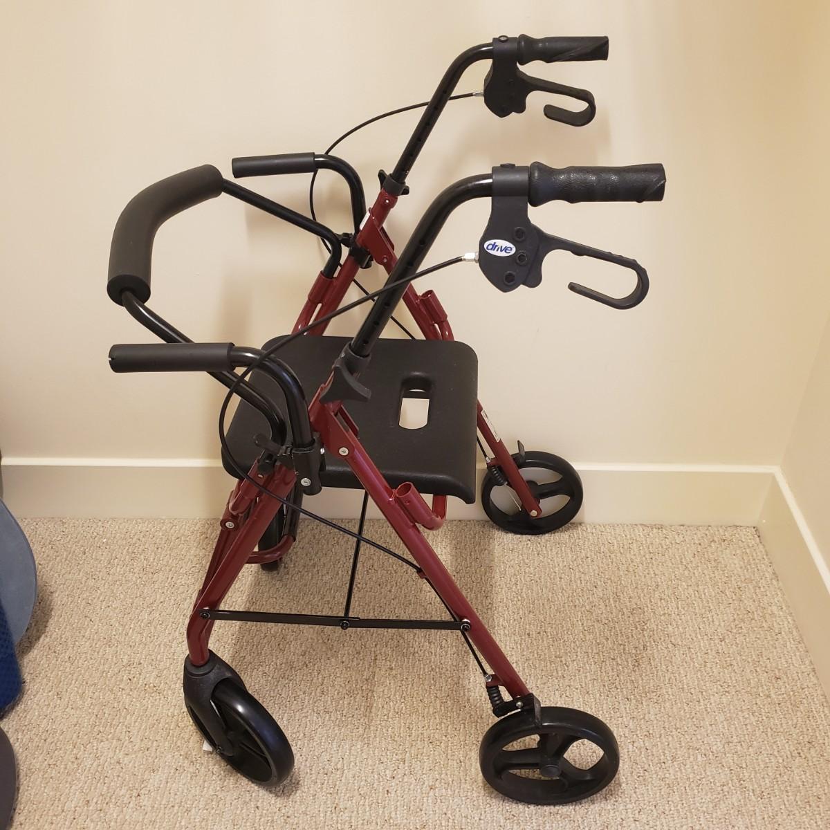 This large ambulatory lot contains two Drive rolling walkers. On has a bag under the seat, the other does not. The three identical canes are adjustable. One handle is more worn than the other two. There are four NIB items: Cow&Cow, CVS extra ling heating pad, Carex bed pan and a Thermophore Classic. See pictures for details.
