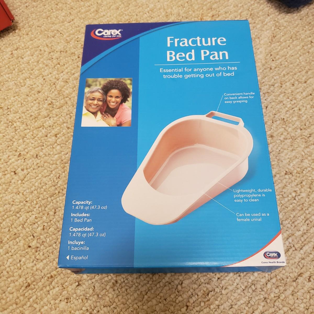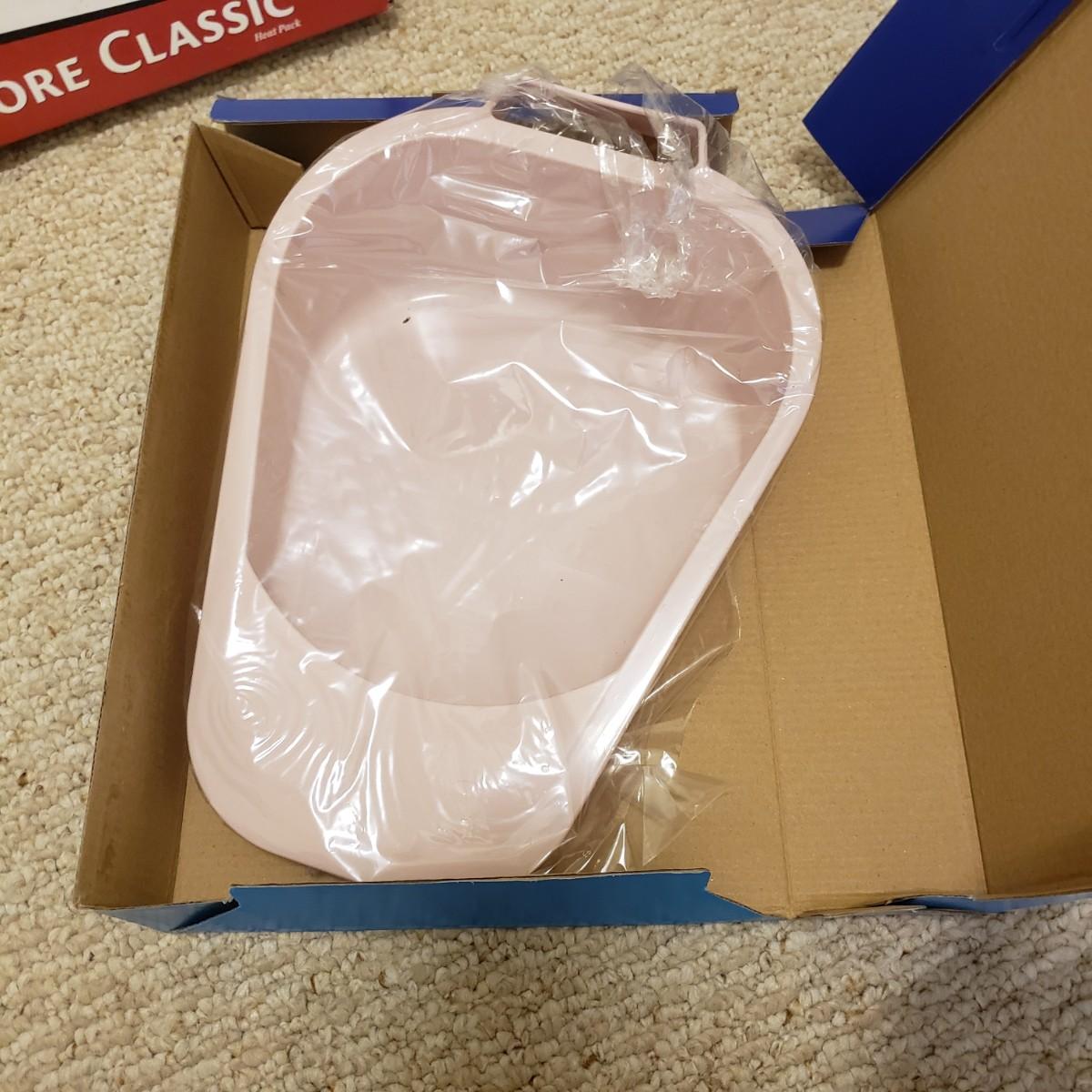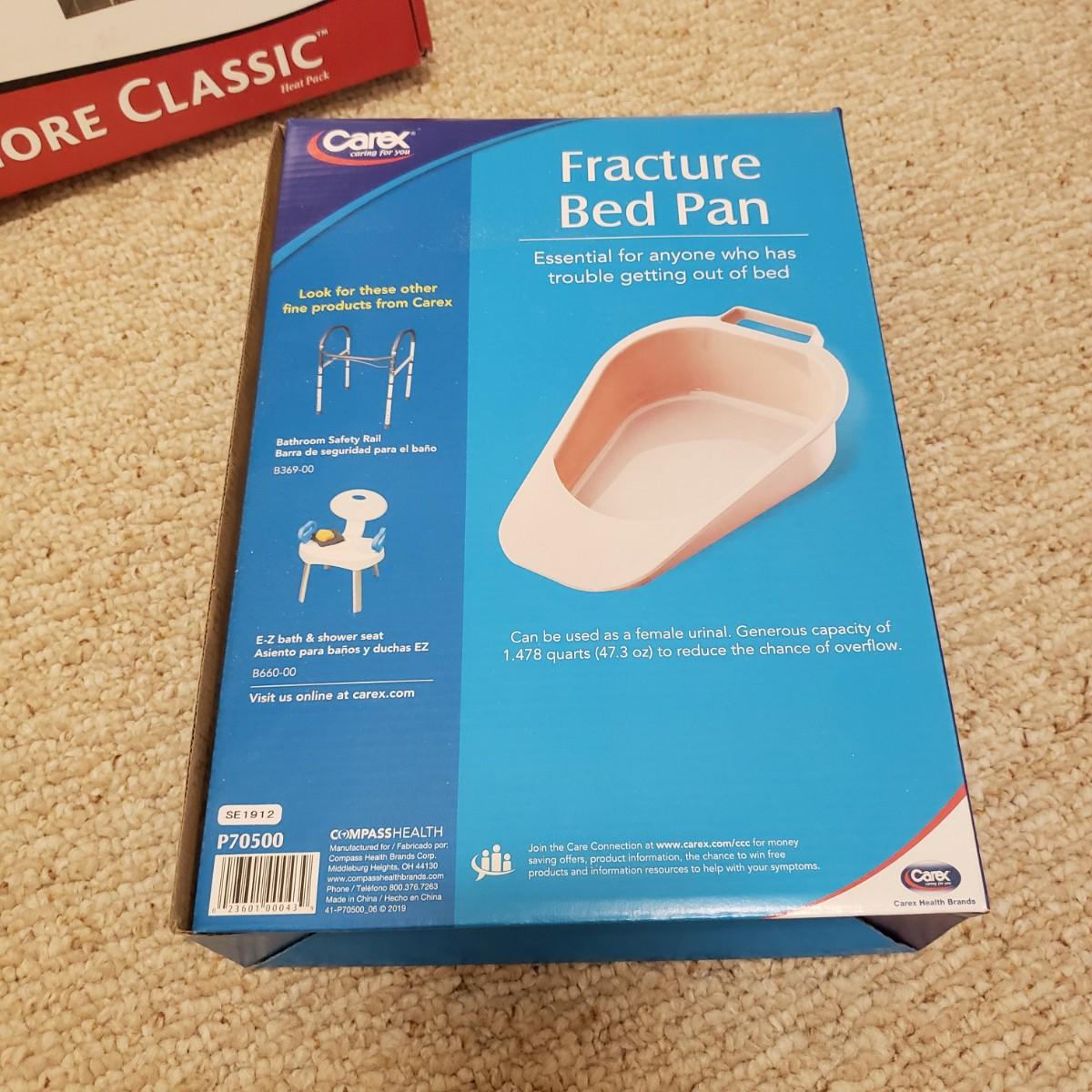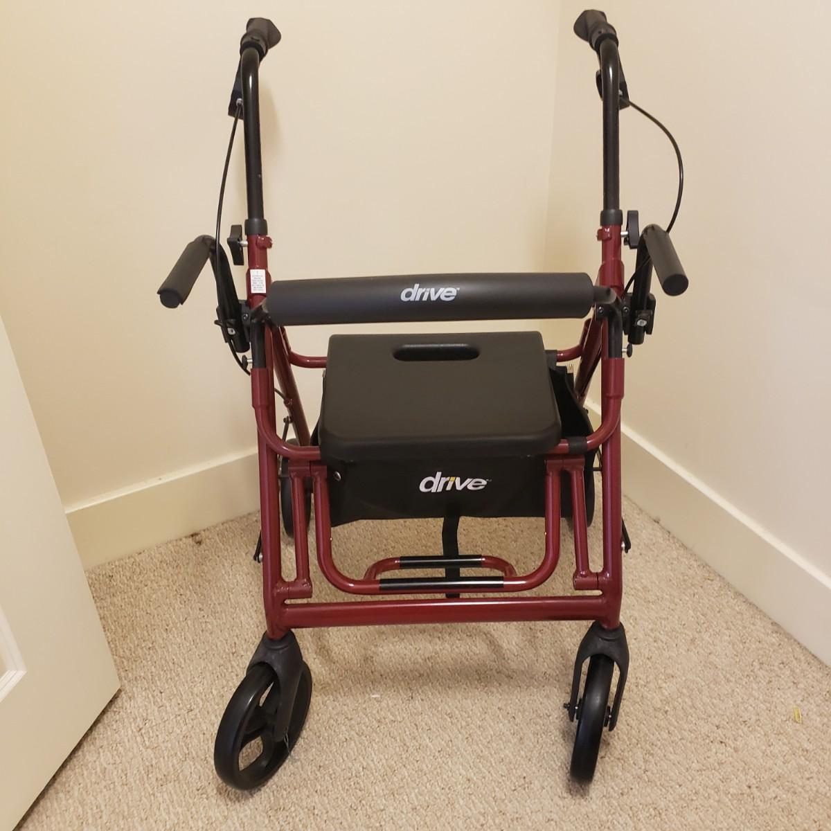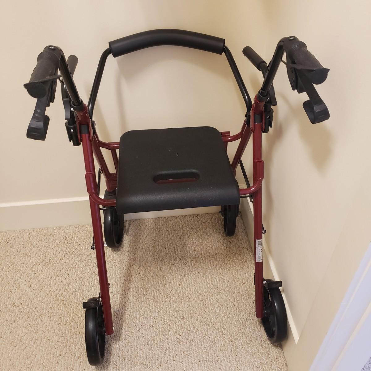 This large ambulatory lot contains two Drive rolling walkers. On has a bag under the seat, the other does not. The three identical canes are adjustable. One handle is more worn than the other two. There are four NIB items: Cow&Cow, CVS extra ling heating pad, Carex bed pan and a Thermophore Classic. See pictures for details.