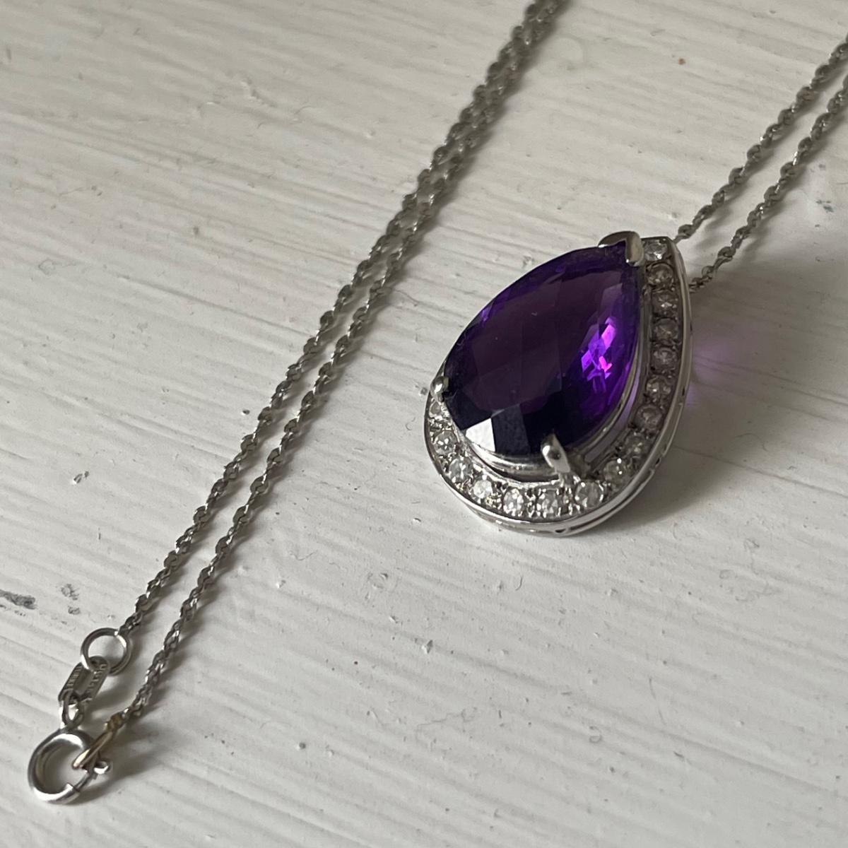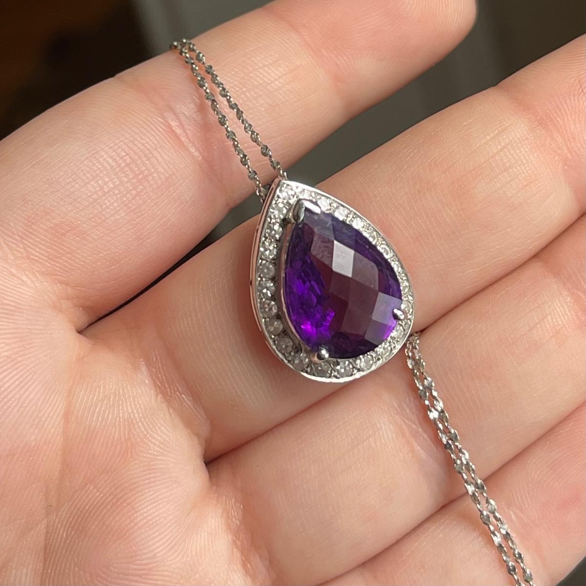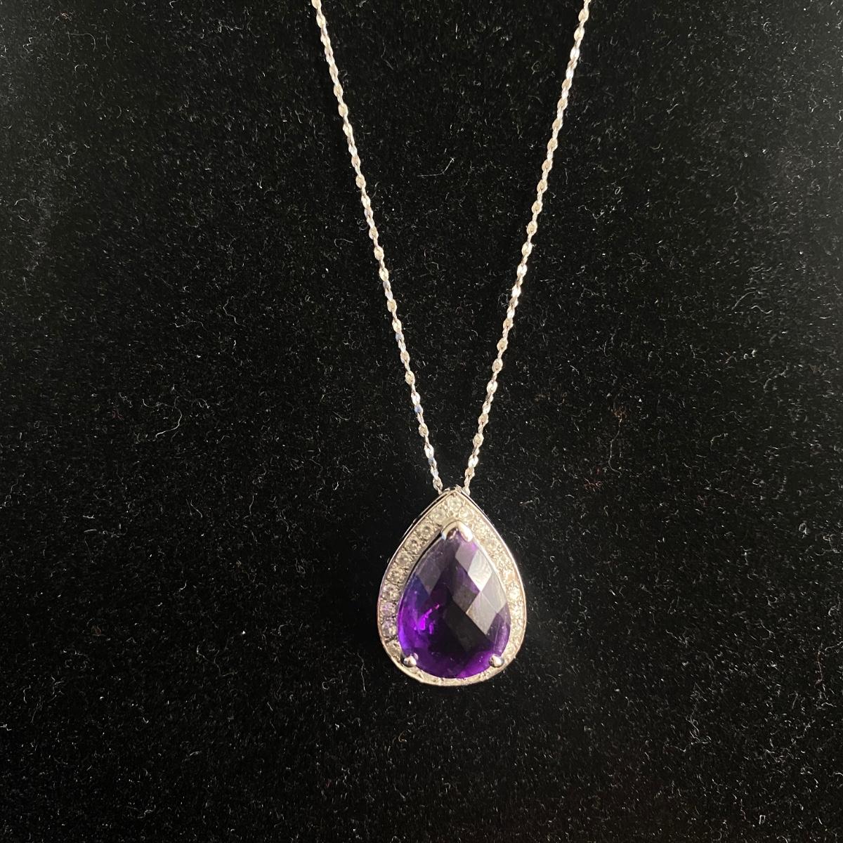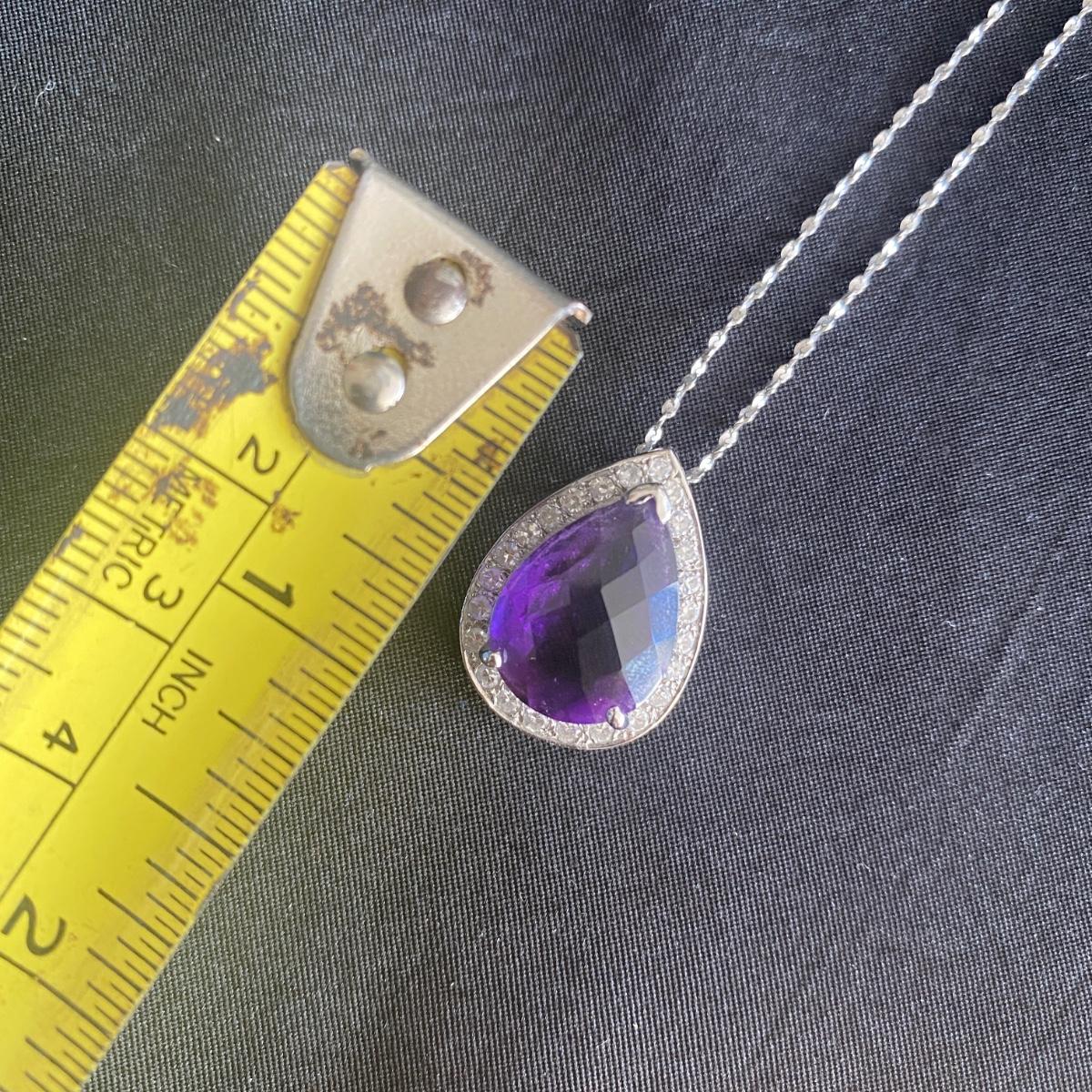 A teardrop shaped amethyst and diamond pendant hanging on a 14k gold chain. The 14k mark is next to the clasp on the chain as well as “Turkey” and it appears to be white gold. The amethyst measures 3/4" x 1/2" and tested as amethyst by Presidium test. Many of the diamonds tested as diamond, but at least one tested as a simulant by Presidium test.
