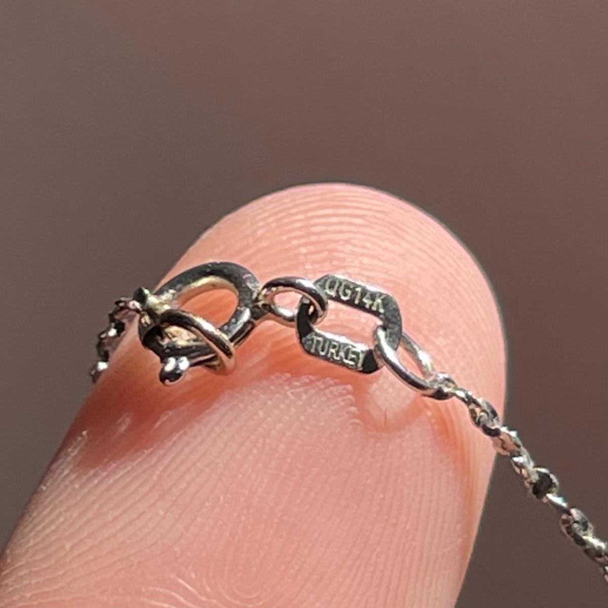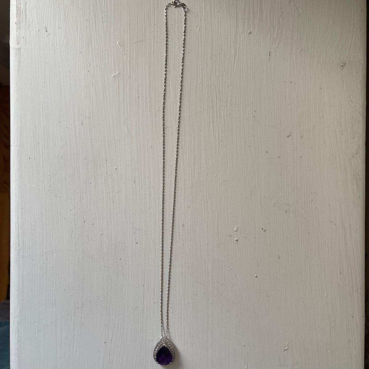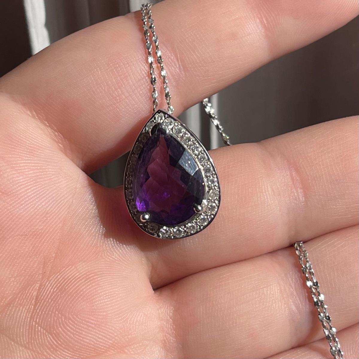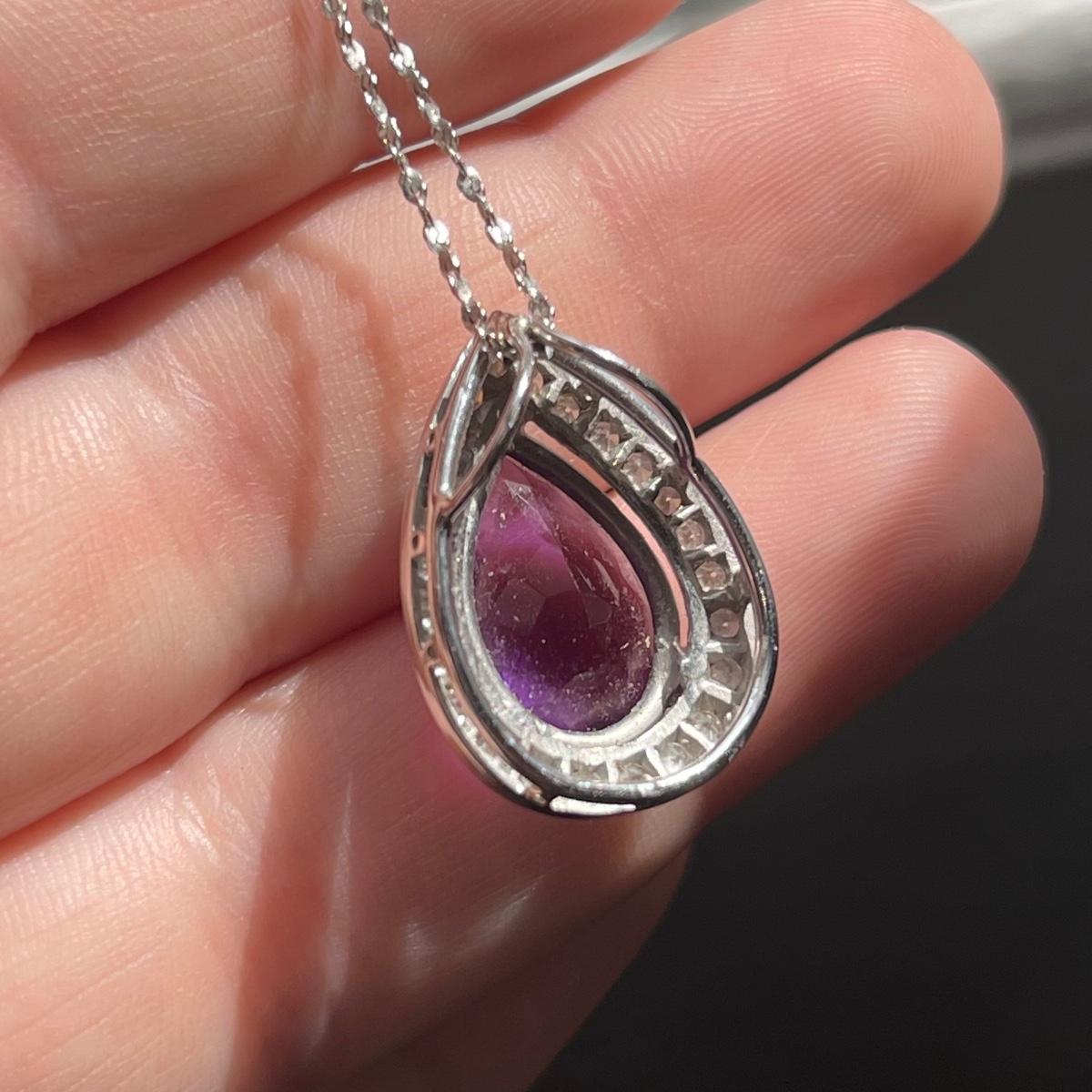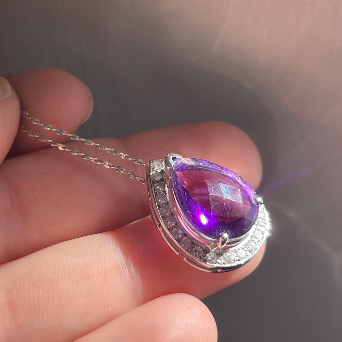 A teardrop shaped amethyst and diamond pendant hanging on a 14k gold chain. The 14k mark is next to the clasp on the chain as well as “Turkey” and it appears to be white gold. The amethyst measures 3/4" x 1/2" and tested as amethyst by Presidium test. Many of the diamonds tested as diamond, but at least one tested as a simulant by Presidium test.