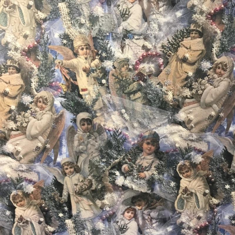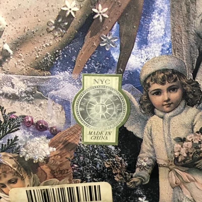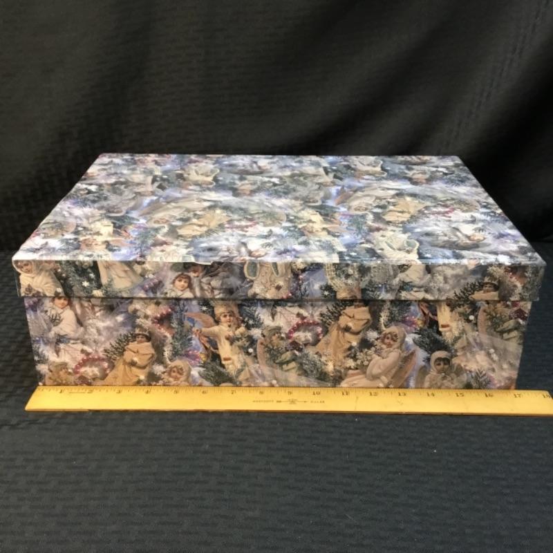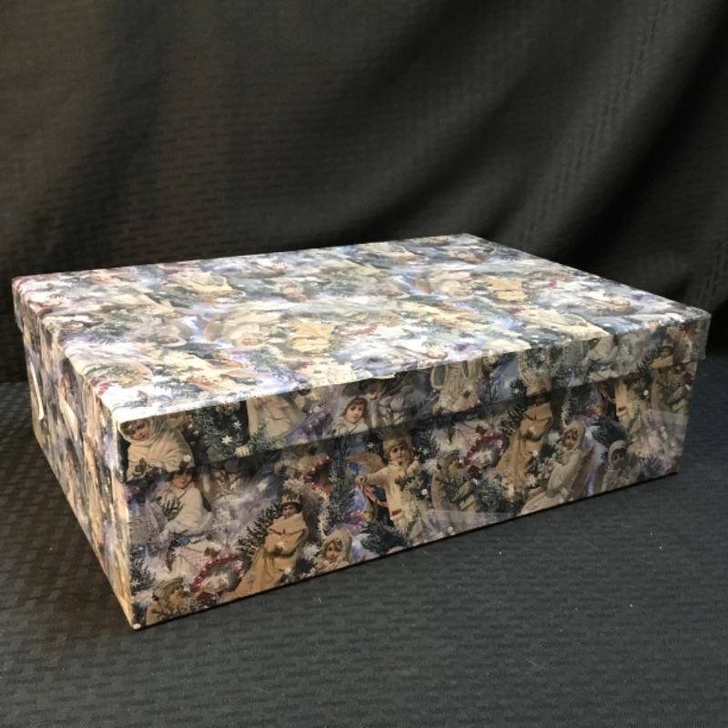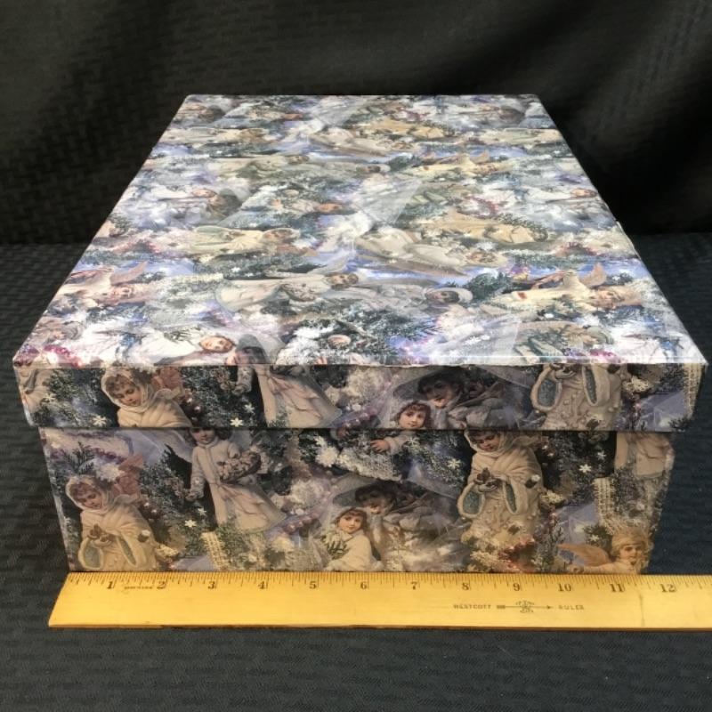 Up for auction is a large gift box depicting adolescent angels in various poses on a festive winter holiday background; see pictures. Auction is for box only.